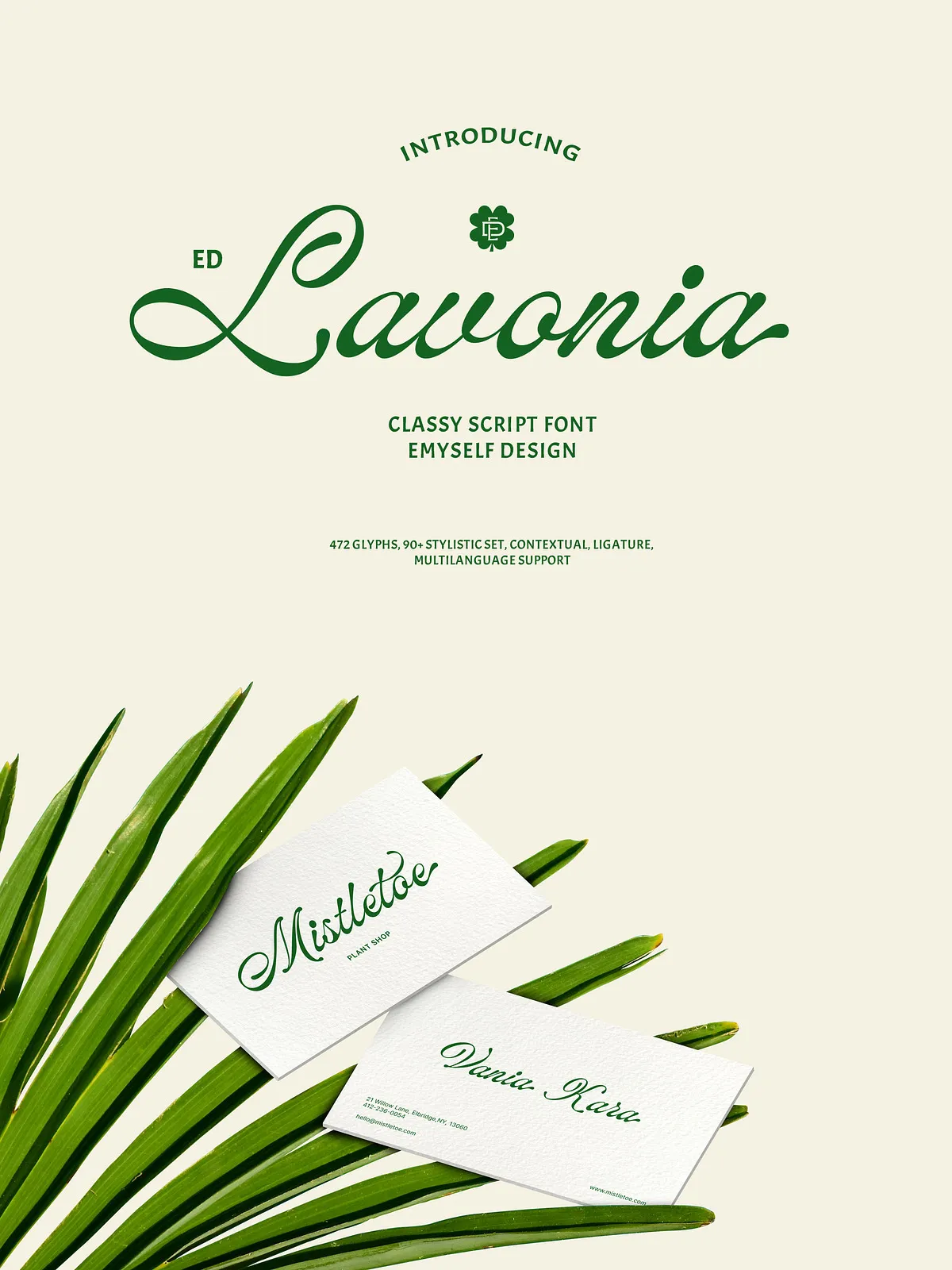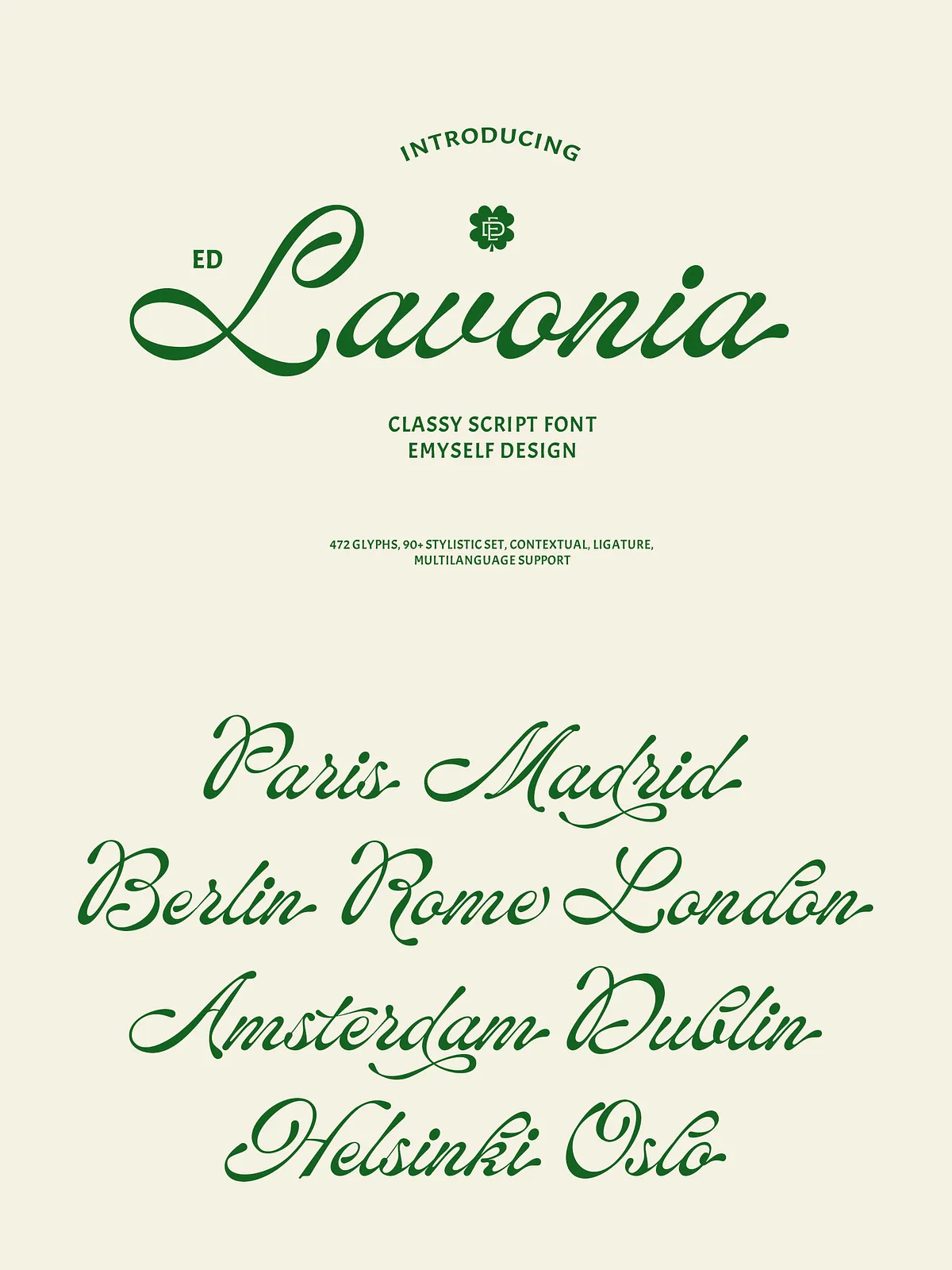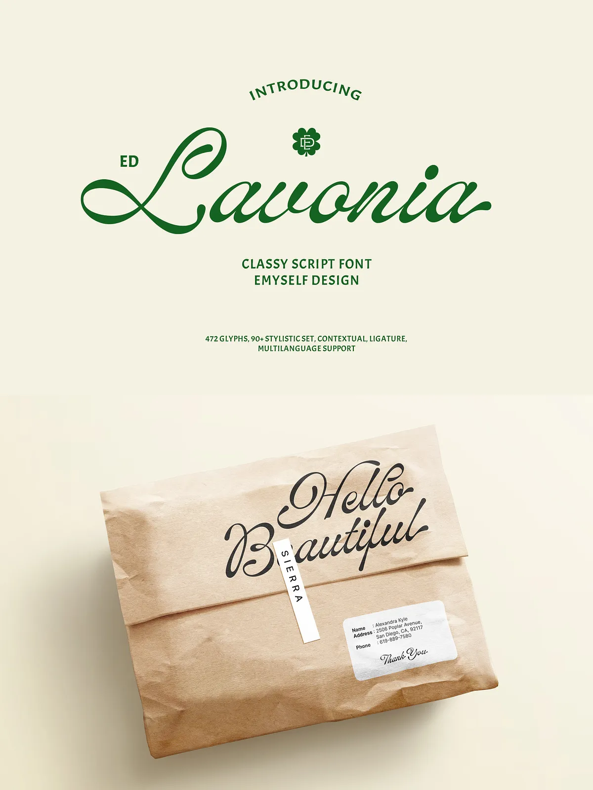 - Full Multi-Language Support – Lavonia Script supports Latin-based languages across Europe and the Americas, including French, German, Italian, Spanish, Portuguese, Dutch, Swedish, and more – with full diacritic coverage for authentic, professional results.