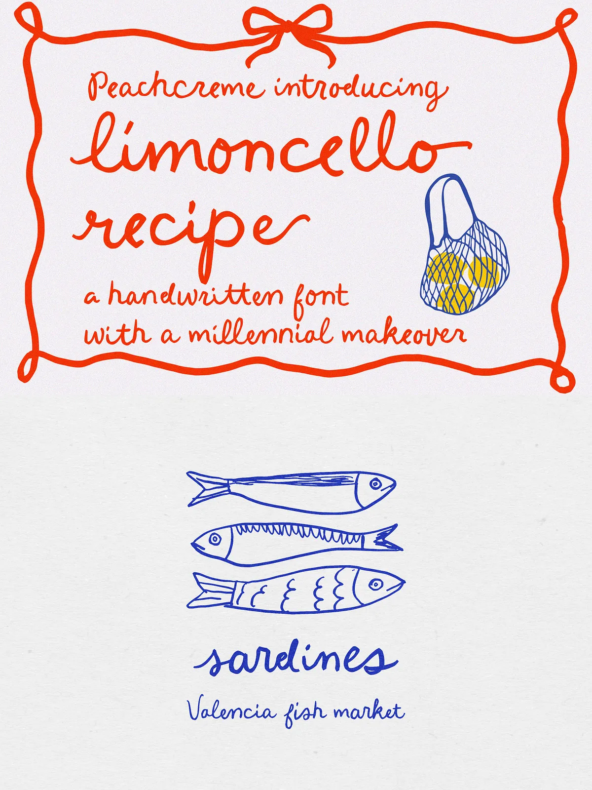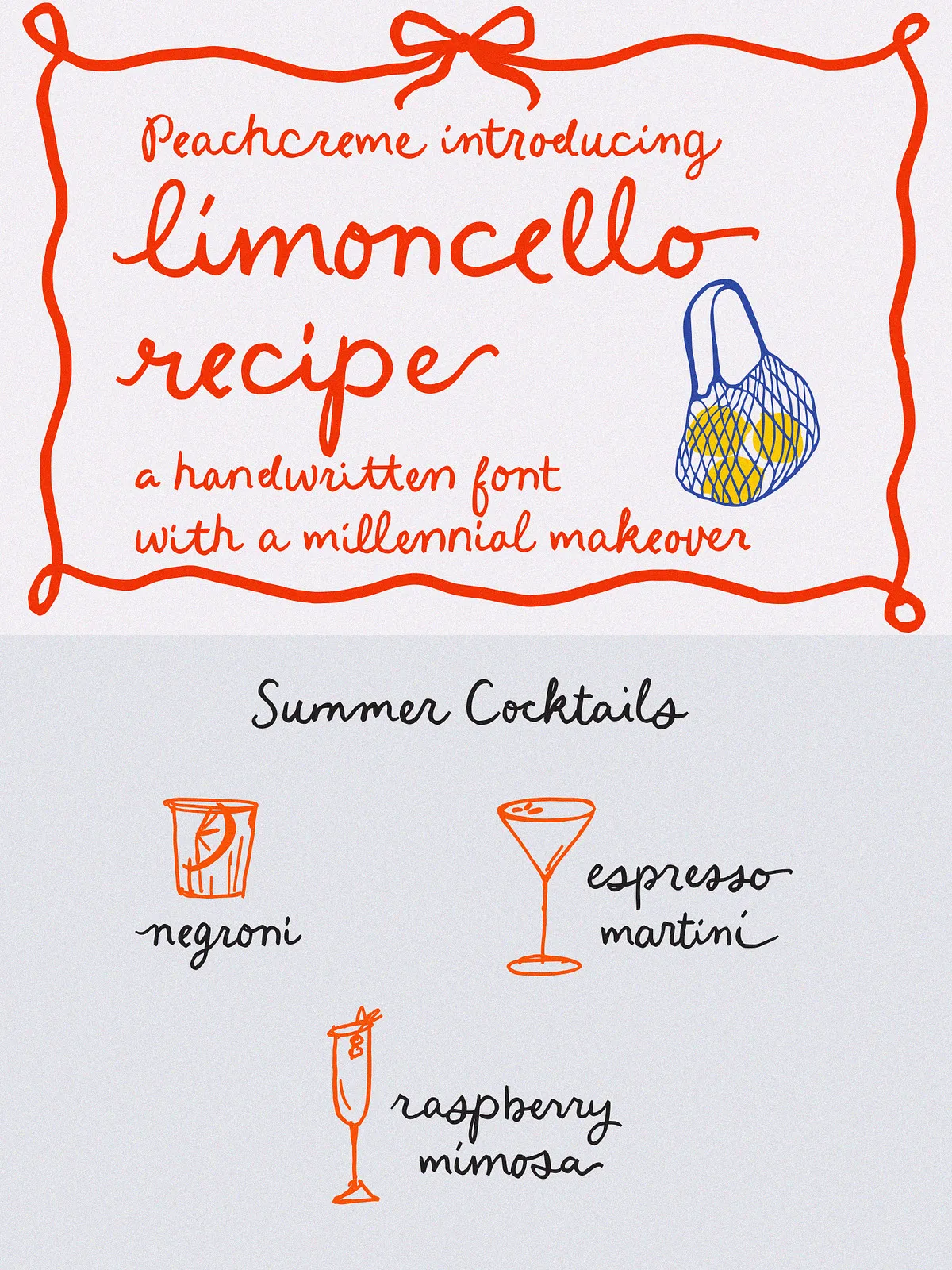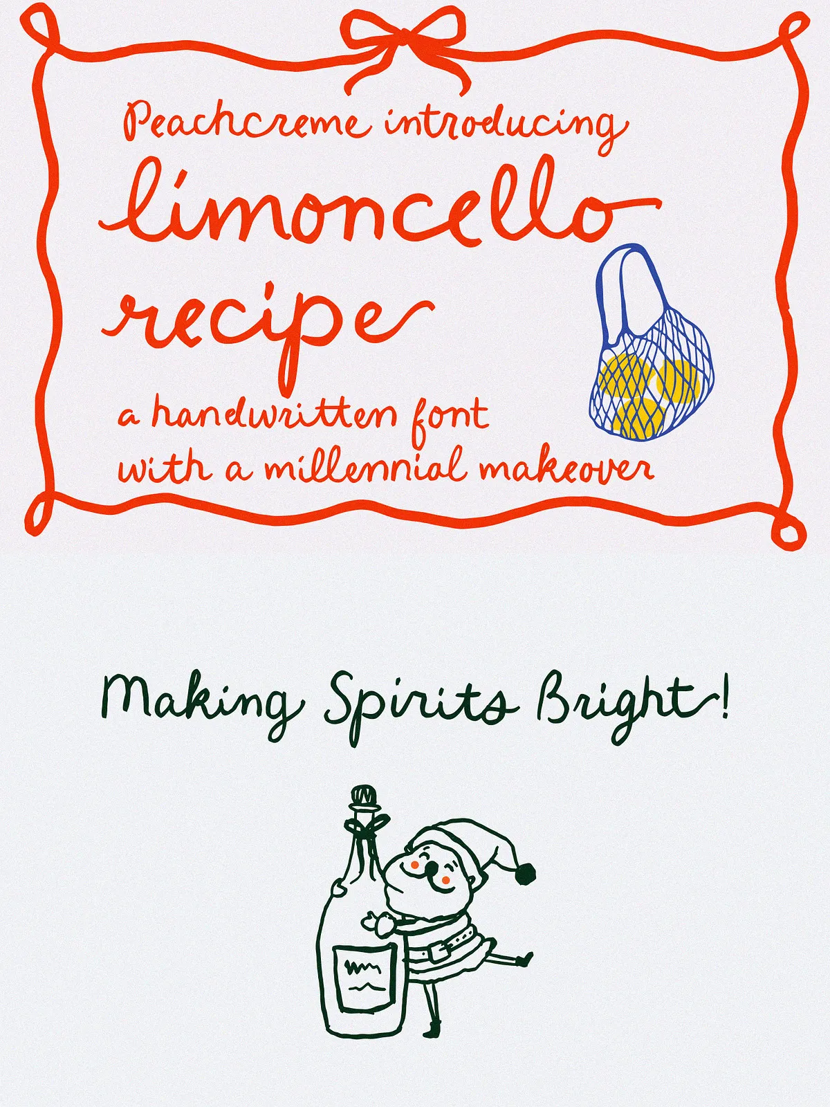 Limoncello Recipe captures the essence of authentic handwriting with its perfectly imperfect strokes and casual, unrefined style. Inspired by the warm, familiar notes found in a well-used family cookbook, this font brings a personal, approachable feel to any design. Its uneven lines and natural flow evoke the human touch, making your text feel genuine and heartfelt.