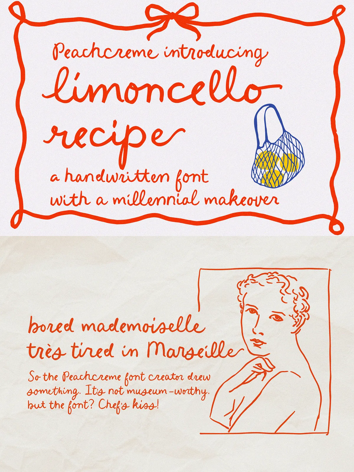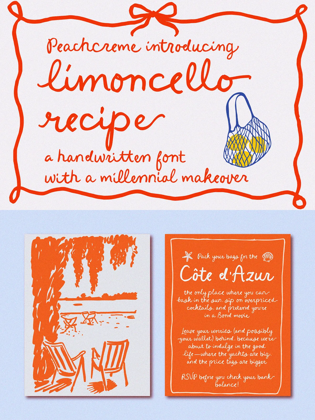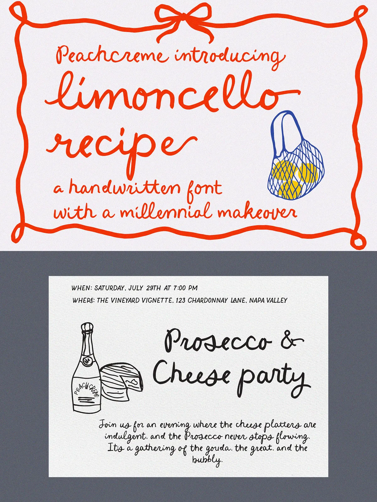 Limoncello Recipe captures the essence of authentic handwriting with its perfectly imperfect strokes and casual, unrefined style. Inspired by the warm, familiar notes found in a well-used family cookbook, this font brings a personal, approachable feel to any design. Its uneven lines and natural flow evoke the human touch, making your text feel genuine and heartfelt.