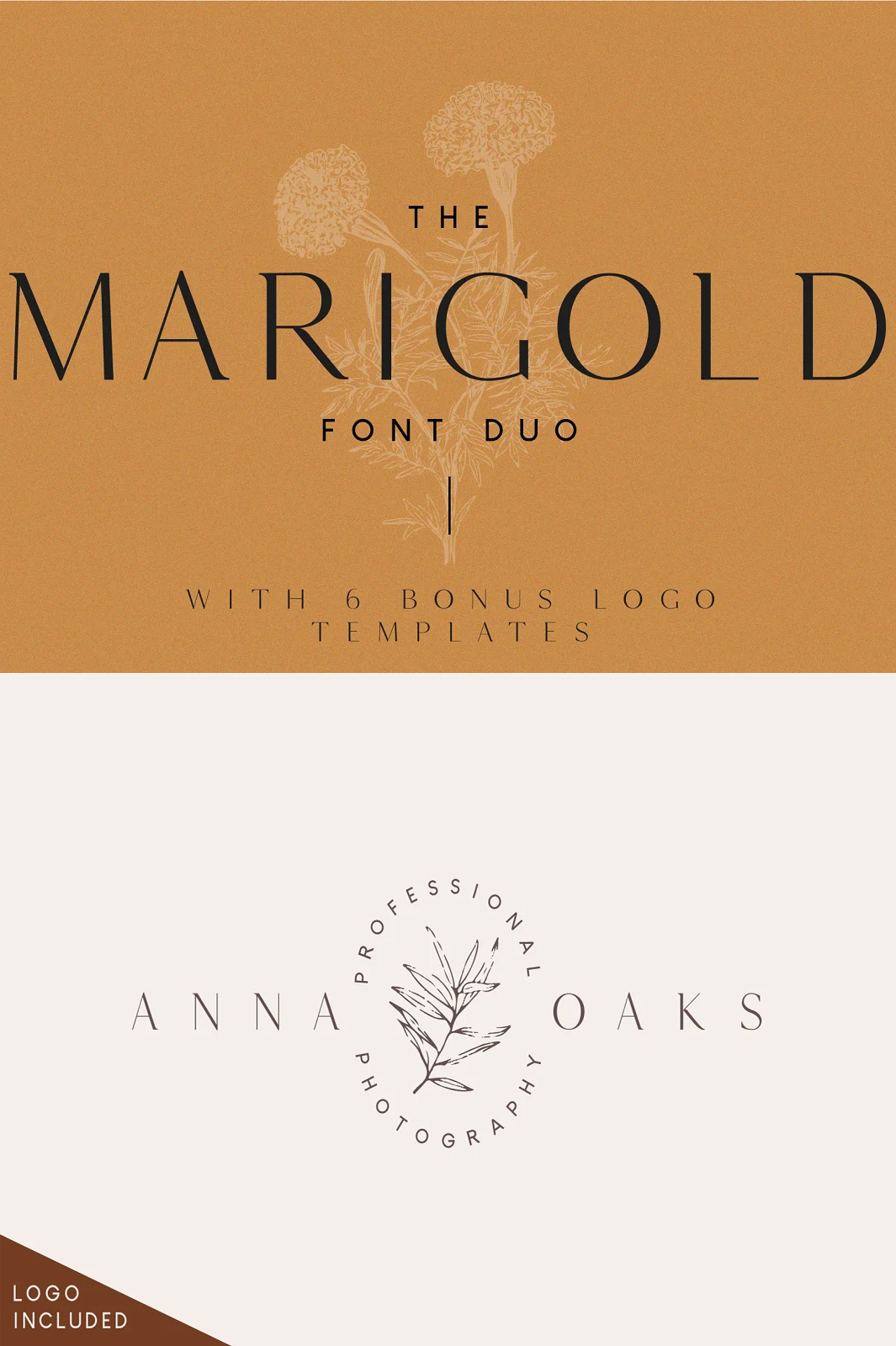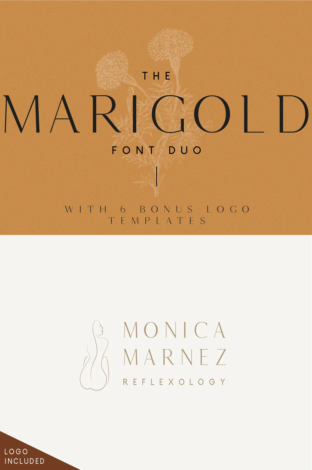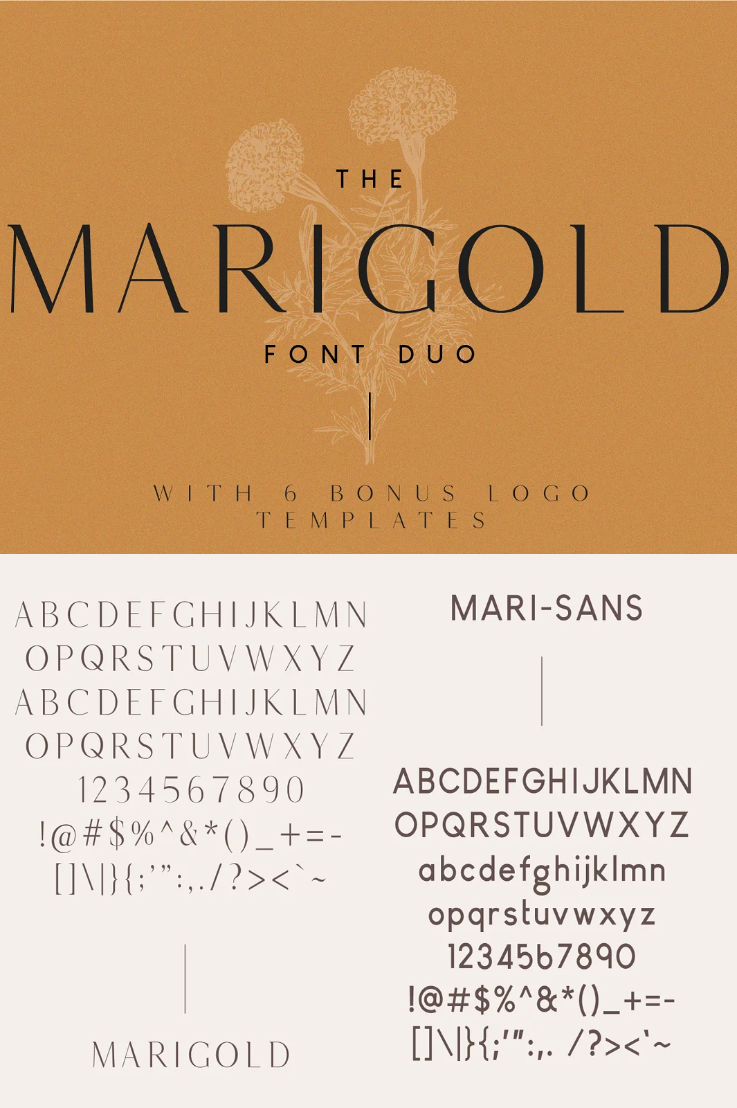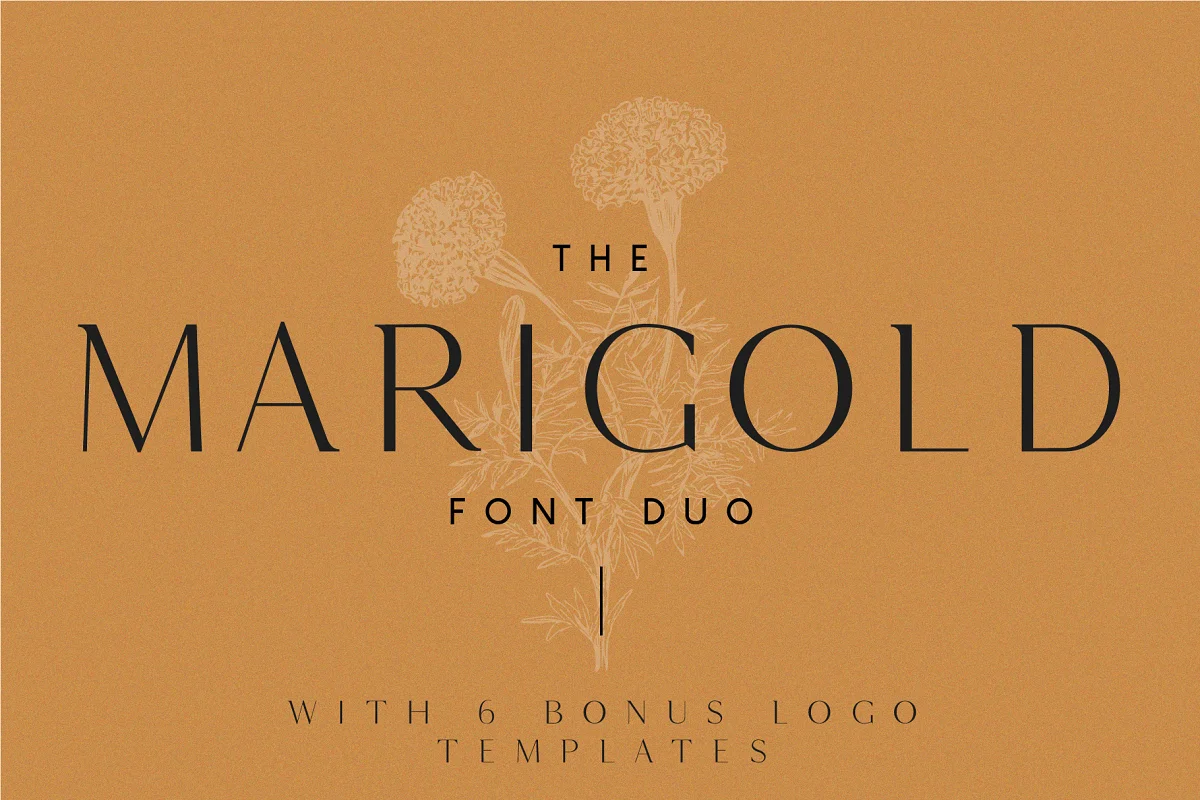 Marigold is a unique font that blends serif and sans serif. It is perfectly paired with Marigold Sans, a minimal tagline and body copy font. I have added 6 bonus editable logos created around this font duo.
