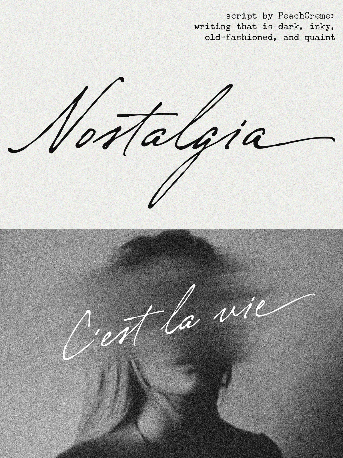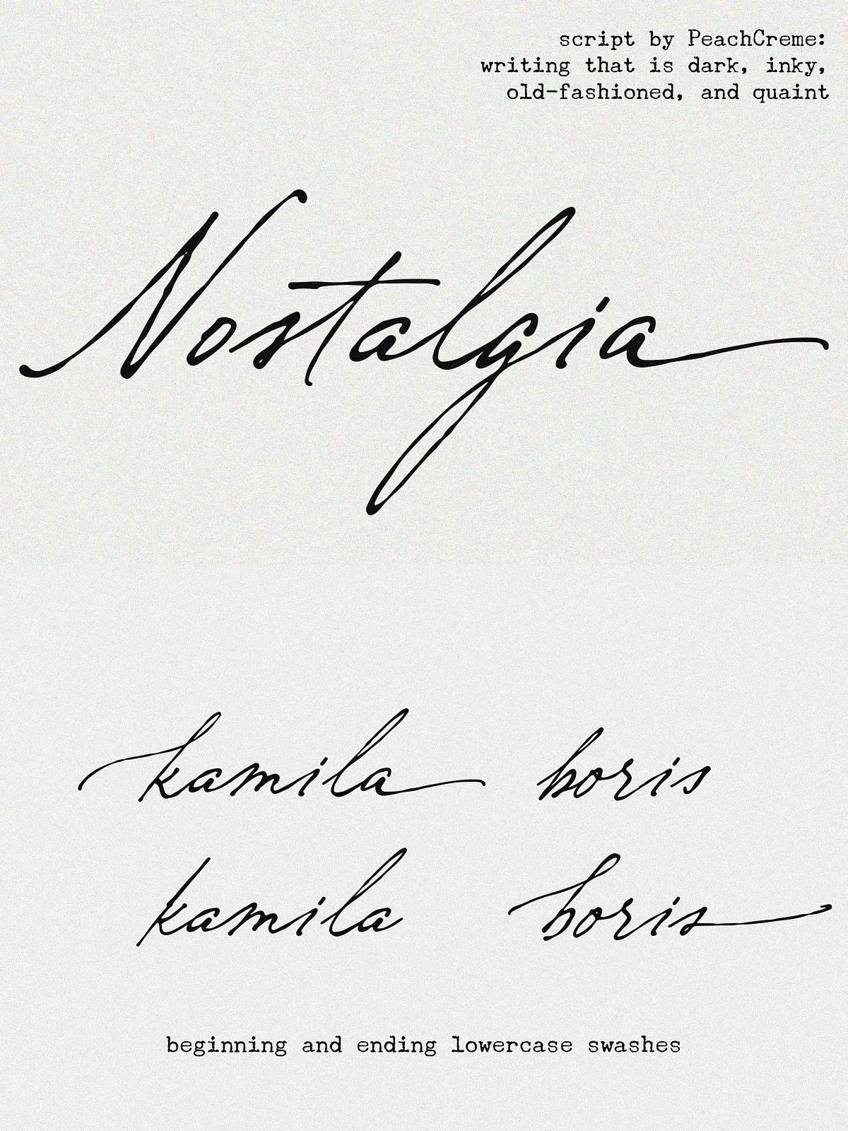 The inspiration behind Nostalgia comes from traditional handwriting styles characterized by fluid strokes and expressive swashes. This font features fantastic starting and ending lowercase swashes that add a graceful, handcrafted touch to your text. The dark vintage style evokes a sense of history and authenticity, making it perfect for projects that require a warm, nostalgic feel.