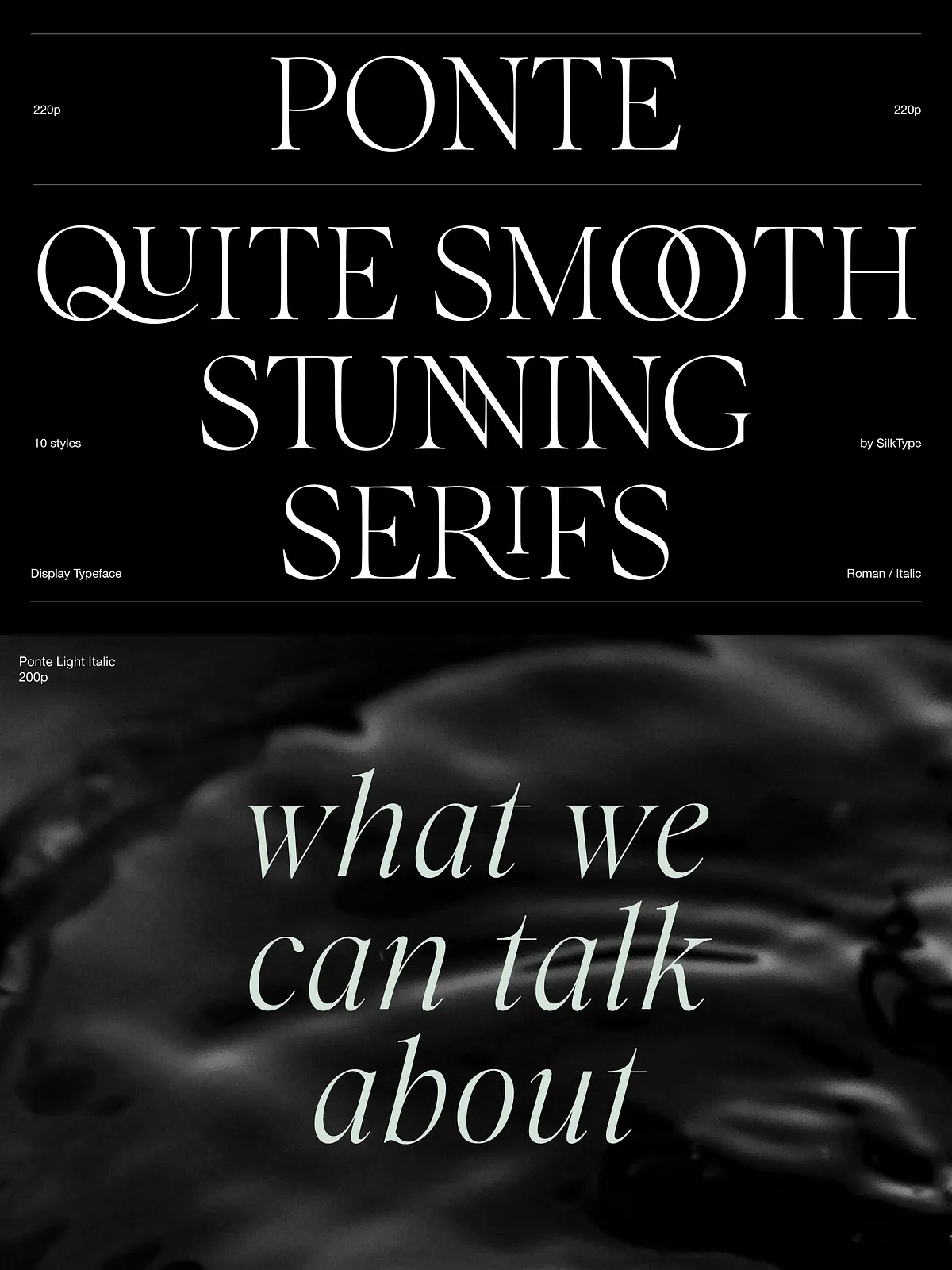 Ponte isn’t just one font—it’s a comprehensive type family of 10 distinct styles, offering unparalleled creative freedom. Choose from five weights: Extra Light, Light, Regular, Medium, and Bold, each available in both roman and italic variants. Whether you need delicate nuance or maximum impact, Ponte adapts seamlessly to your design hierarchy.