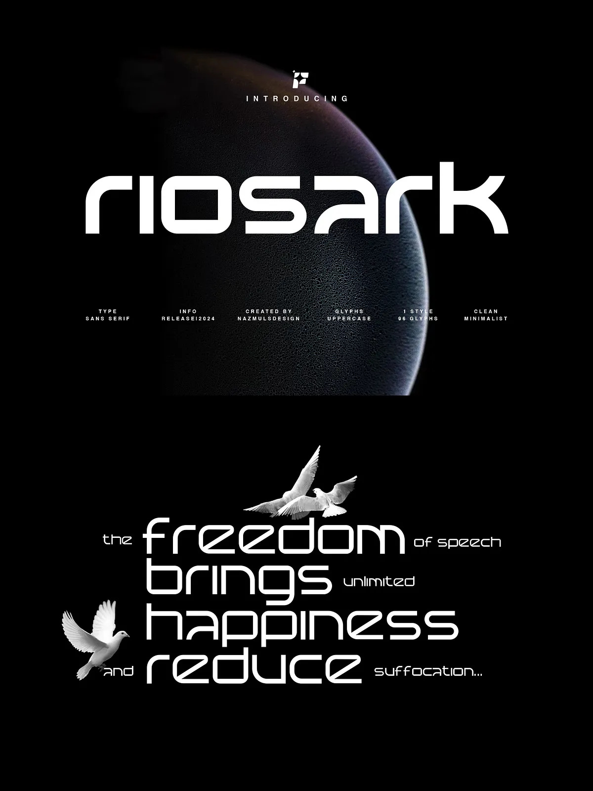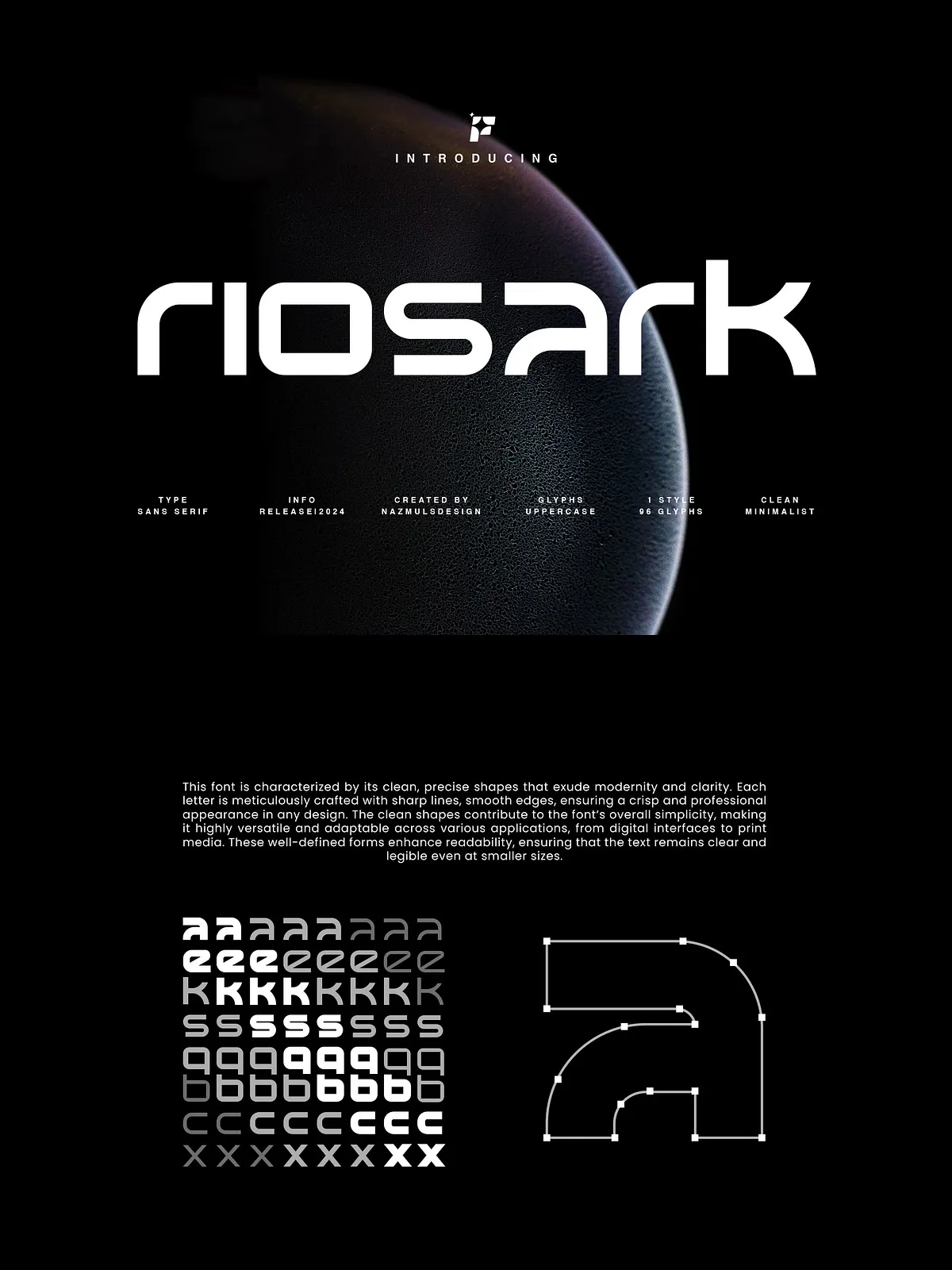 In an age where visual clutter dominates, RIOSARK cuts through with clean, intentional lines and balanced proportions. Its minimalist structure doesn’t sacrifice character—it amplifies it. Each glyph has been engineered for maximum legibility at small sizes and commanding presence at large scales. Whether you’re building a tech startup’s brand identity, crafting a sleek app interface, or designing a high-impact poster, RIOSARK gives you the clarity and strength to stand out.