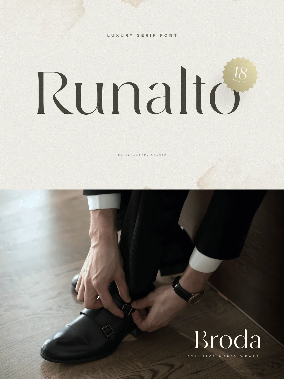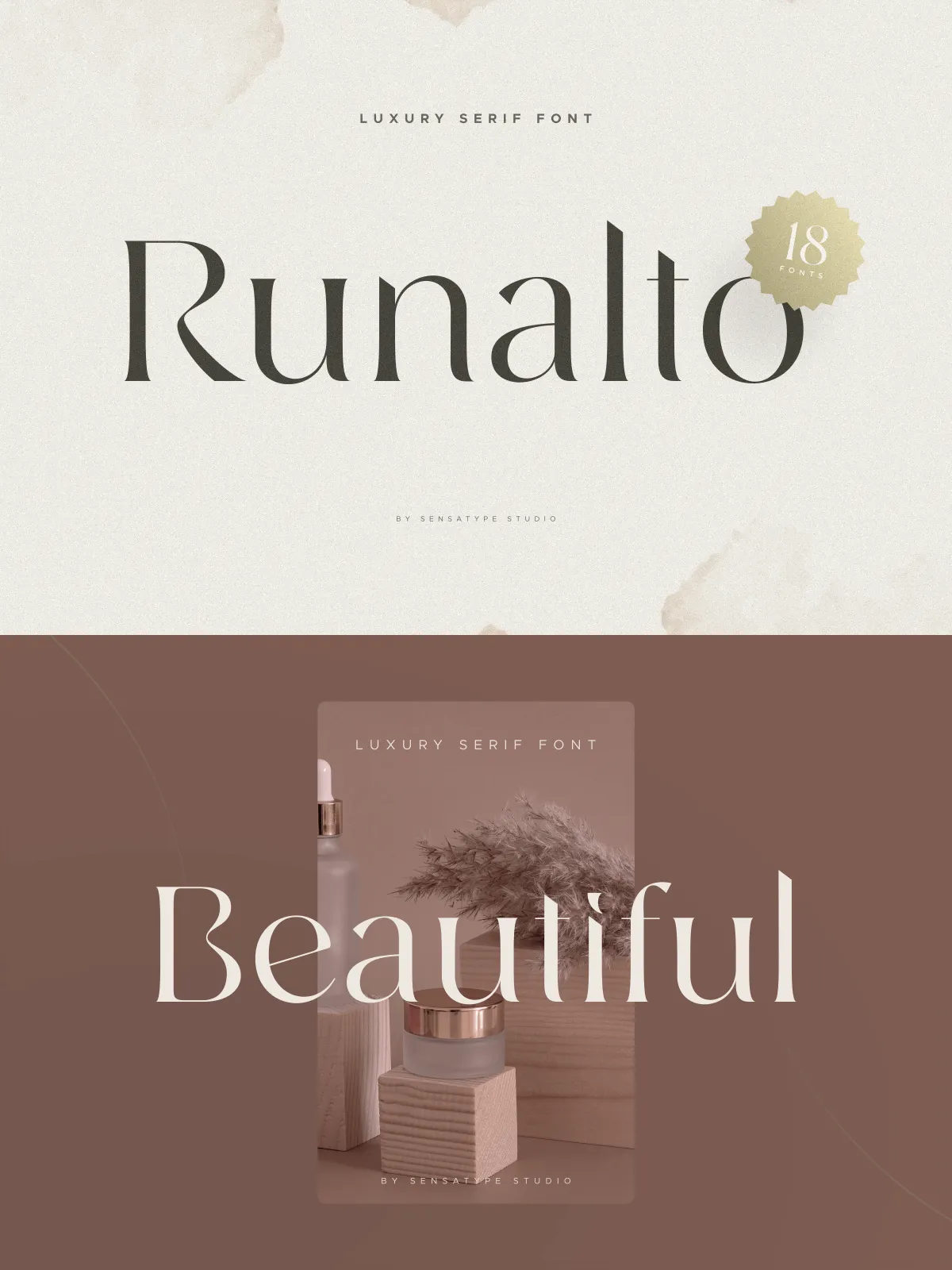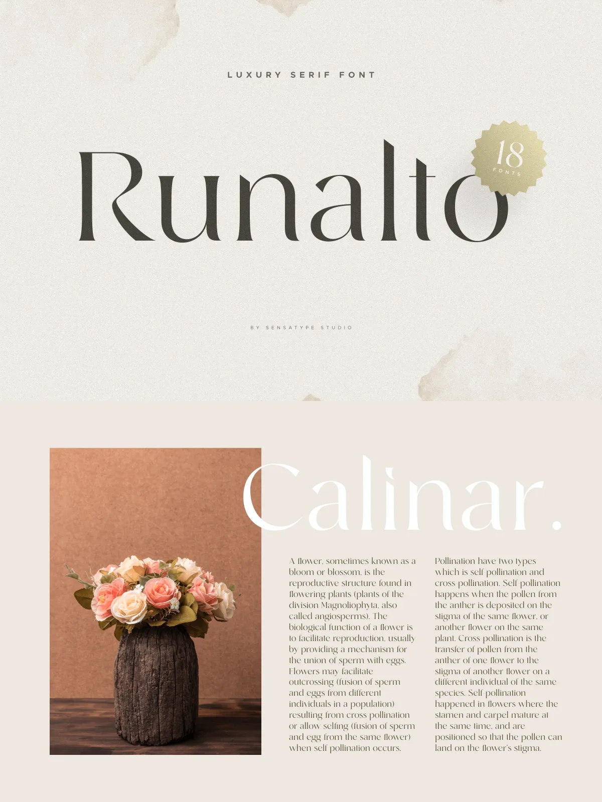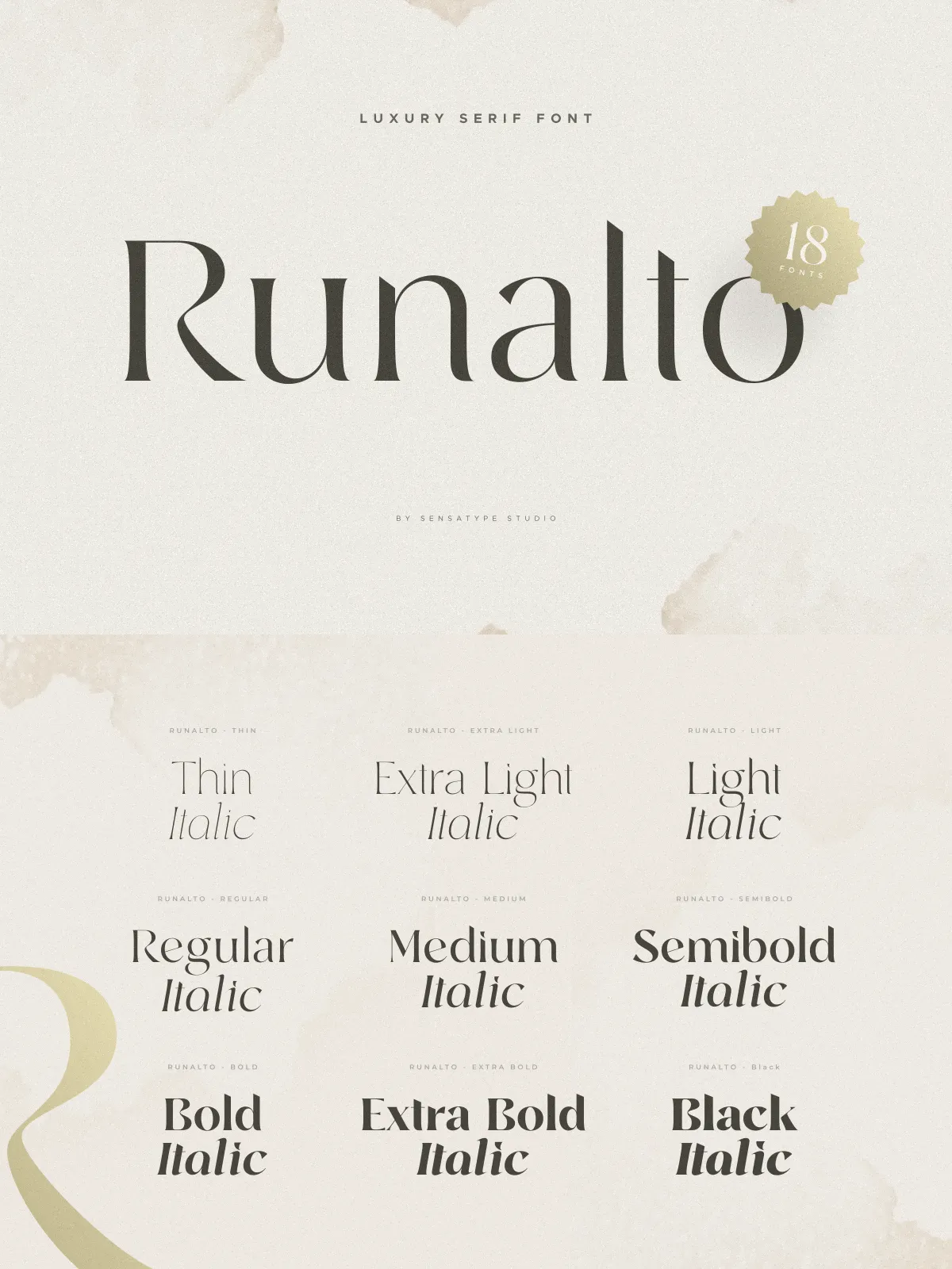 Runalto is a meticulously crafted display serif font that embodies luxury, elegance, and modernity. Designed to stand out with its unique and classy appearance, Runalto is the perfect typographic choice for projects that demand a sophisticated and upscale aesthetic. Whether you are working on magazine layouts, social media graphics, branding, logos, or any creative endeavor that requires a touch of luxury, Runalto delivers a refined and polished look that elevates your design.