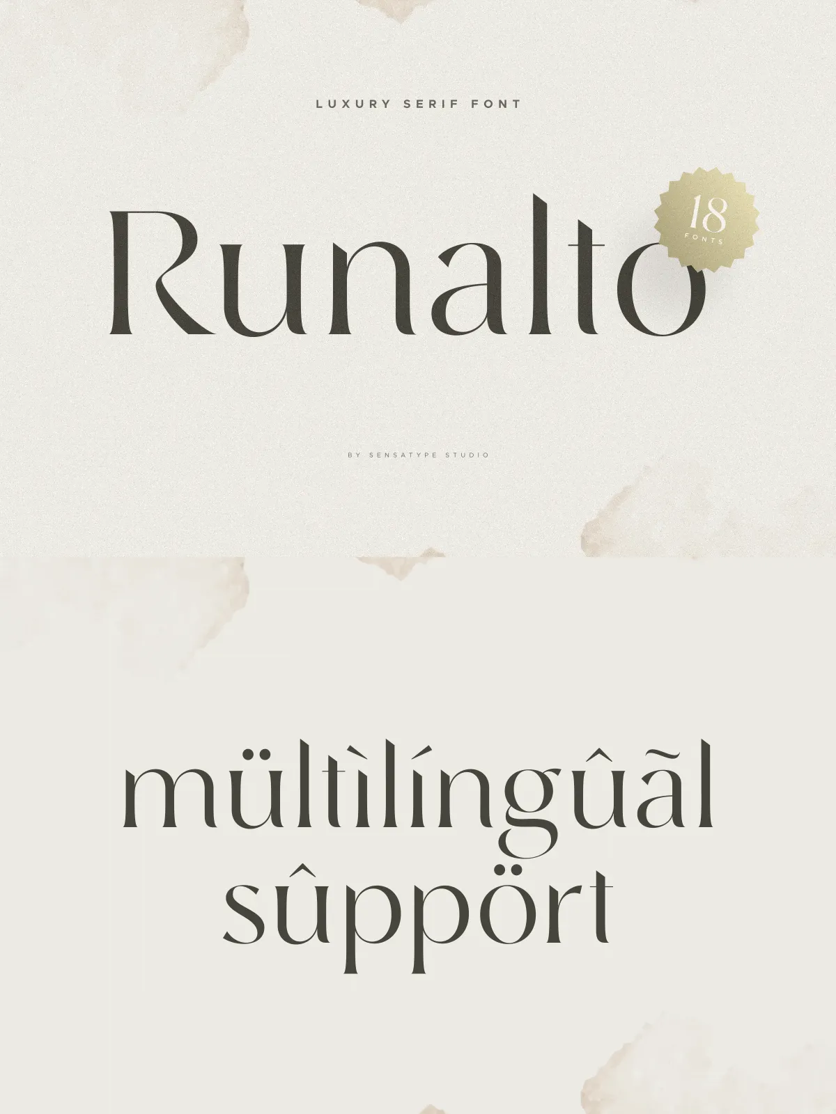 Runalto includes a full set of uppercase and lowercase letters, ensuring flexibility in typographic expression. It also supports a wide range of multilingual characters, making it suitable for international projects and diverse audiences. Additionally, the font contains numerals and punctuation marks, providing all the essential elements needed for complete and polished text compositions.
