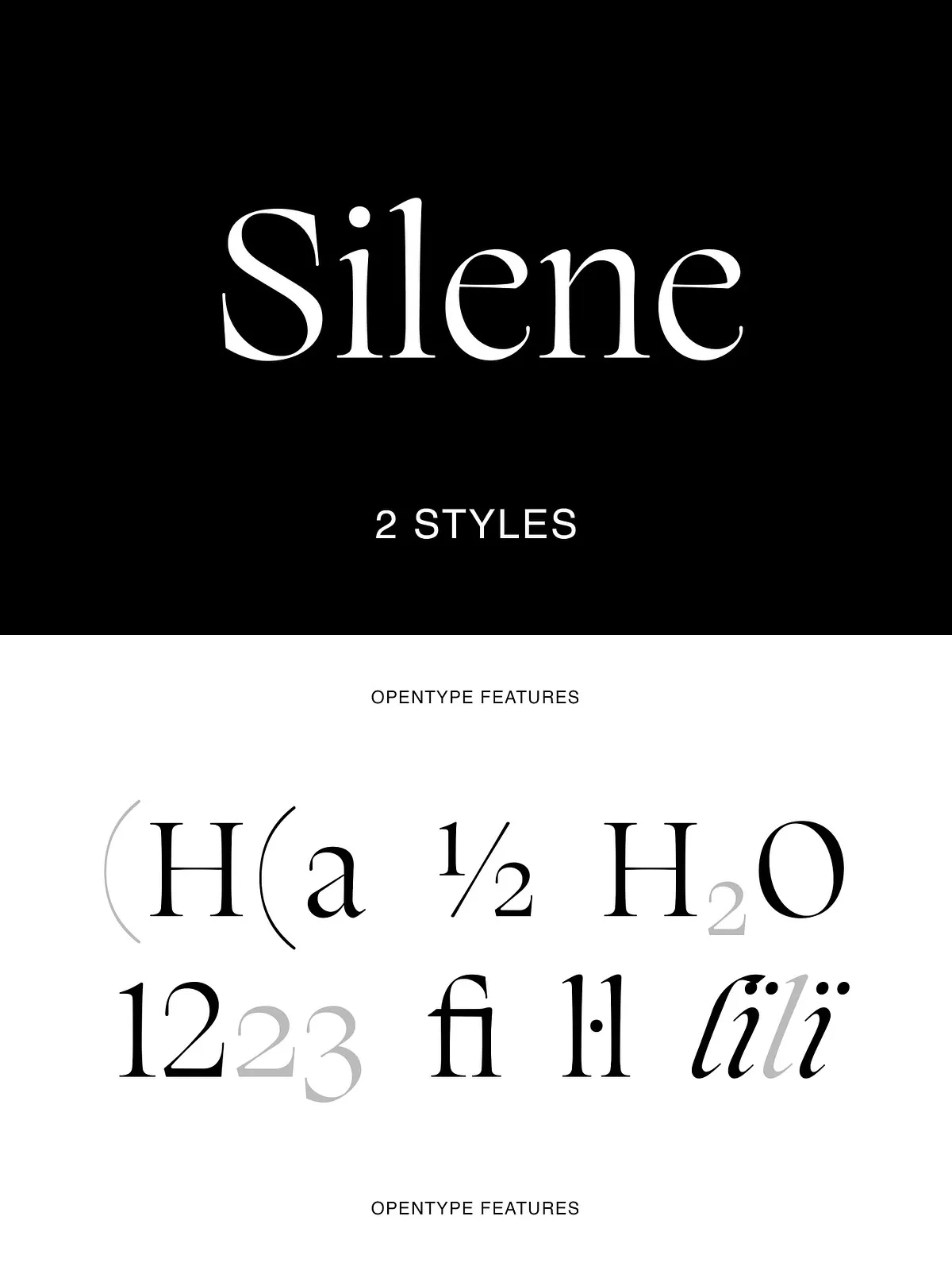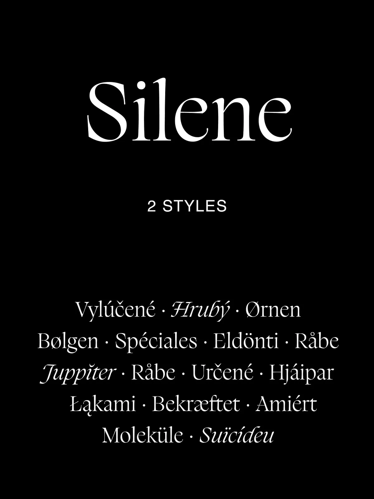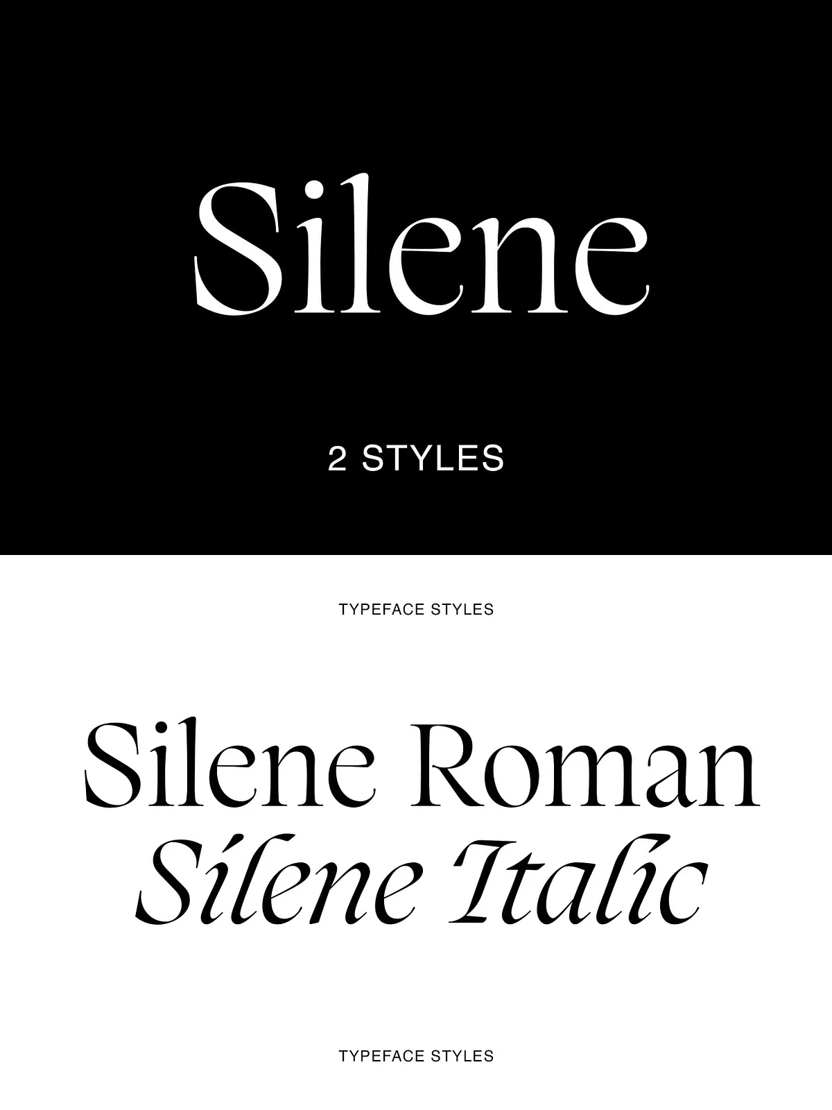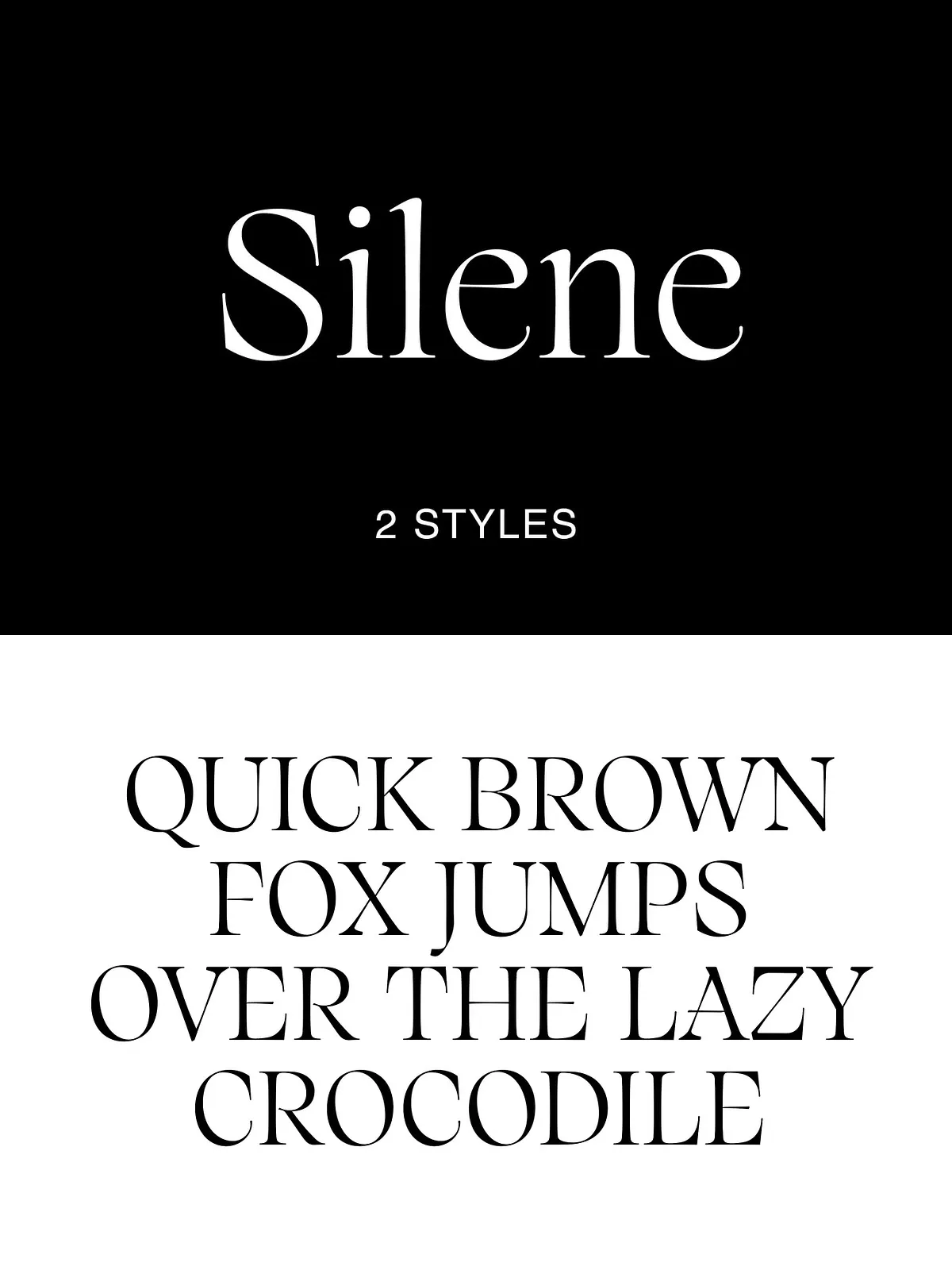 Silene combines a quiet, expansive x-height with sharp terminals and dramatic stroke contrast, creating a dynamic visual rhythm. The diagonal stress in the letterforms adds subtle motion and energy, making every word feel intentional and expressive. Whether you’re setting a fashion editorial headline or designing a luxury product label, Silene commands attention with quiet sophistication.