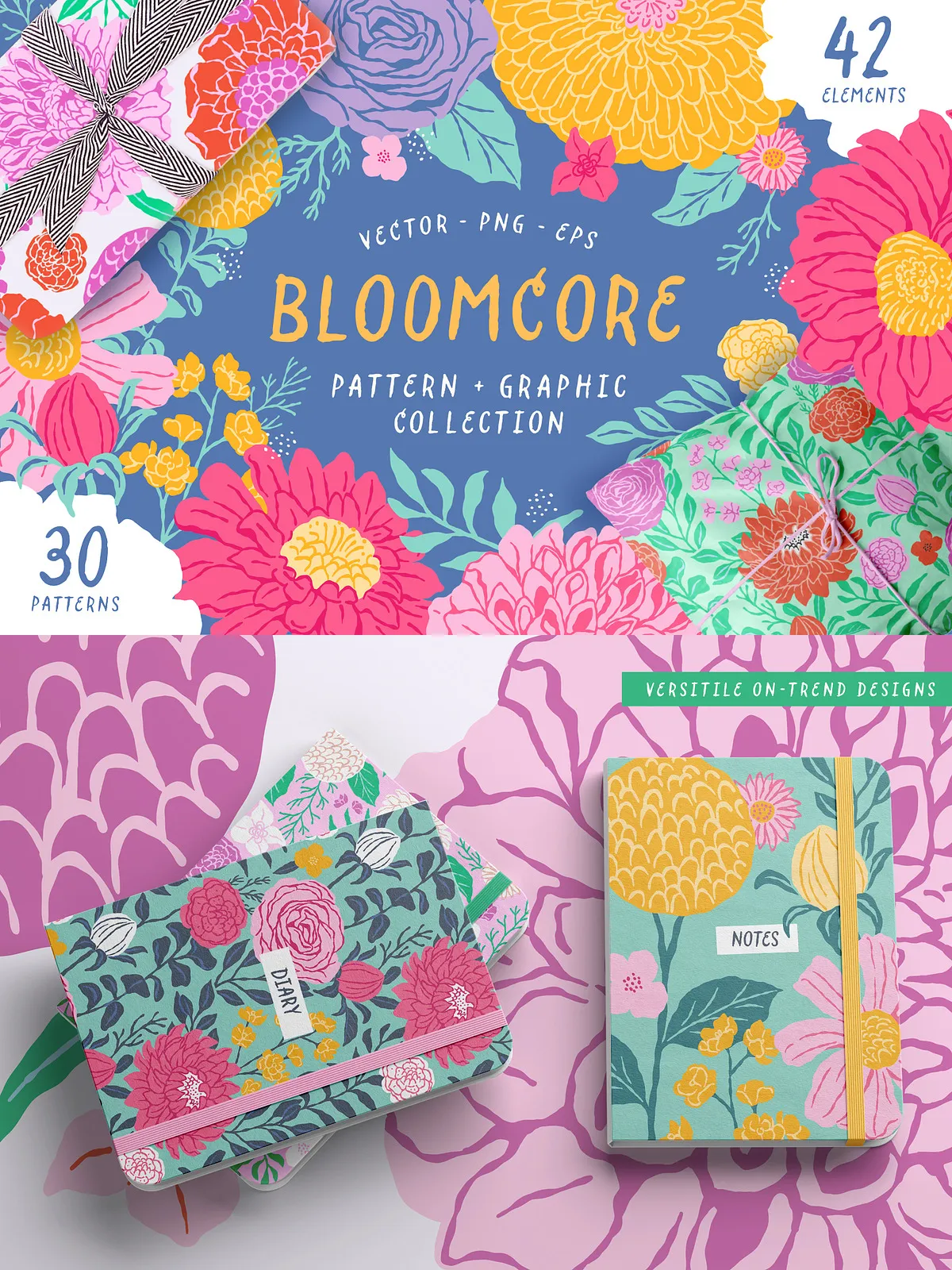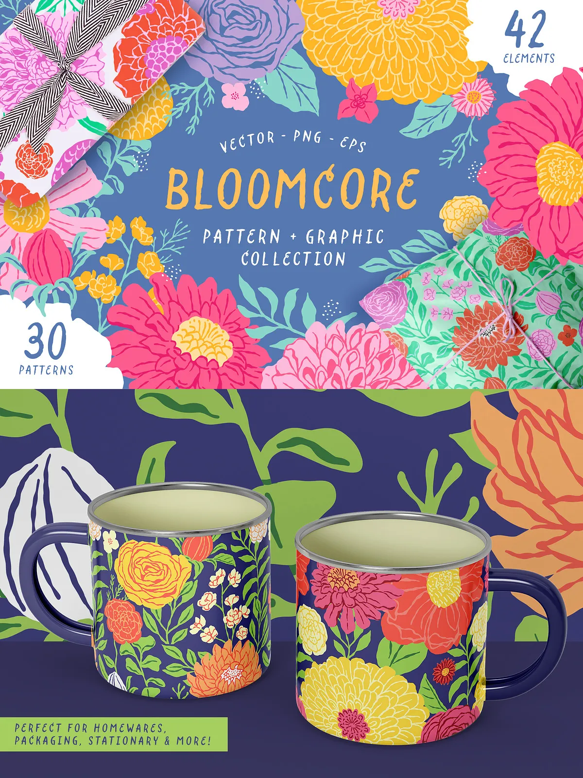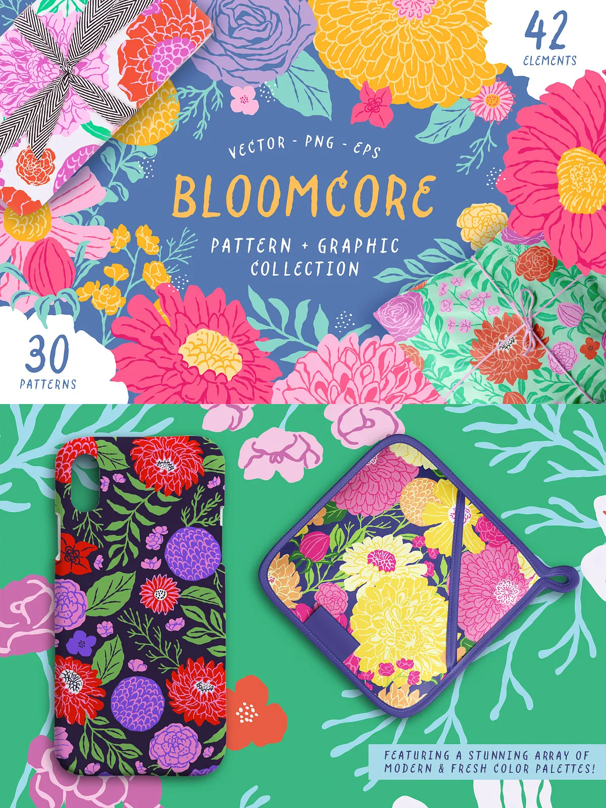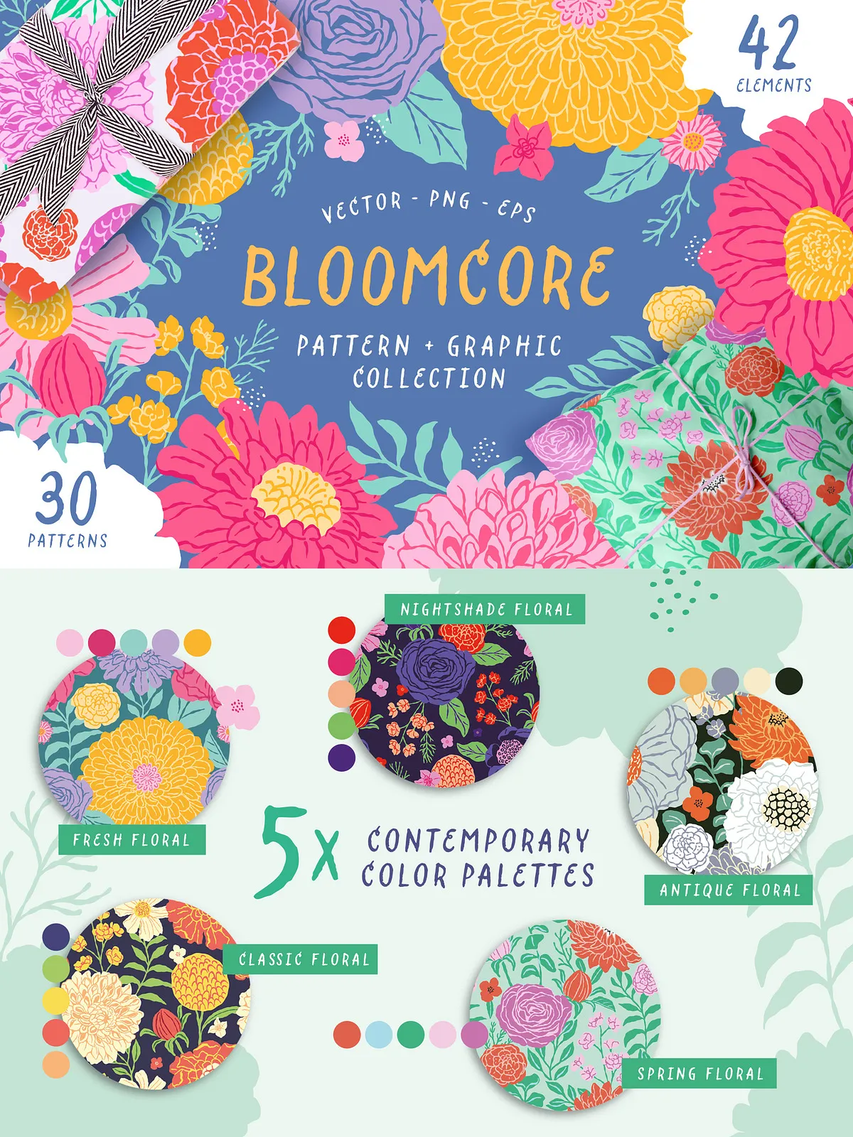 Bloomcore includes six beautifully designed repeating patterns that combine with the five color palettes to create 30 distinct and harmonious pattern variations. Designers and artists can mix and match the florals, stems, and leaves to craft unique compositions, giving endless creative possibilities for product packaging, stationery, textiles, and more.