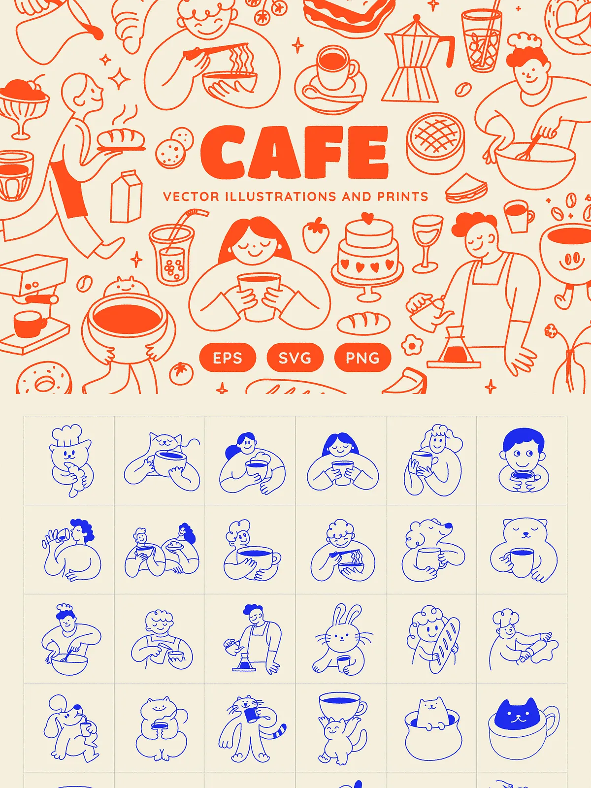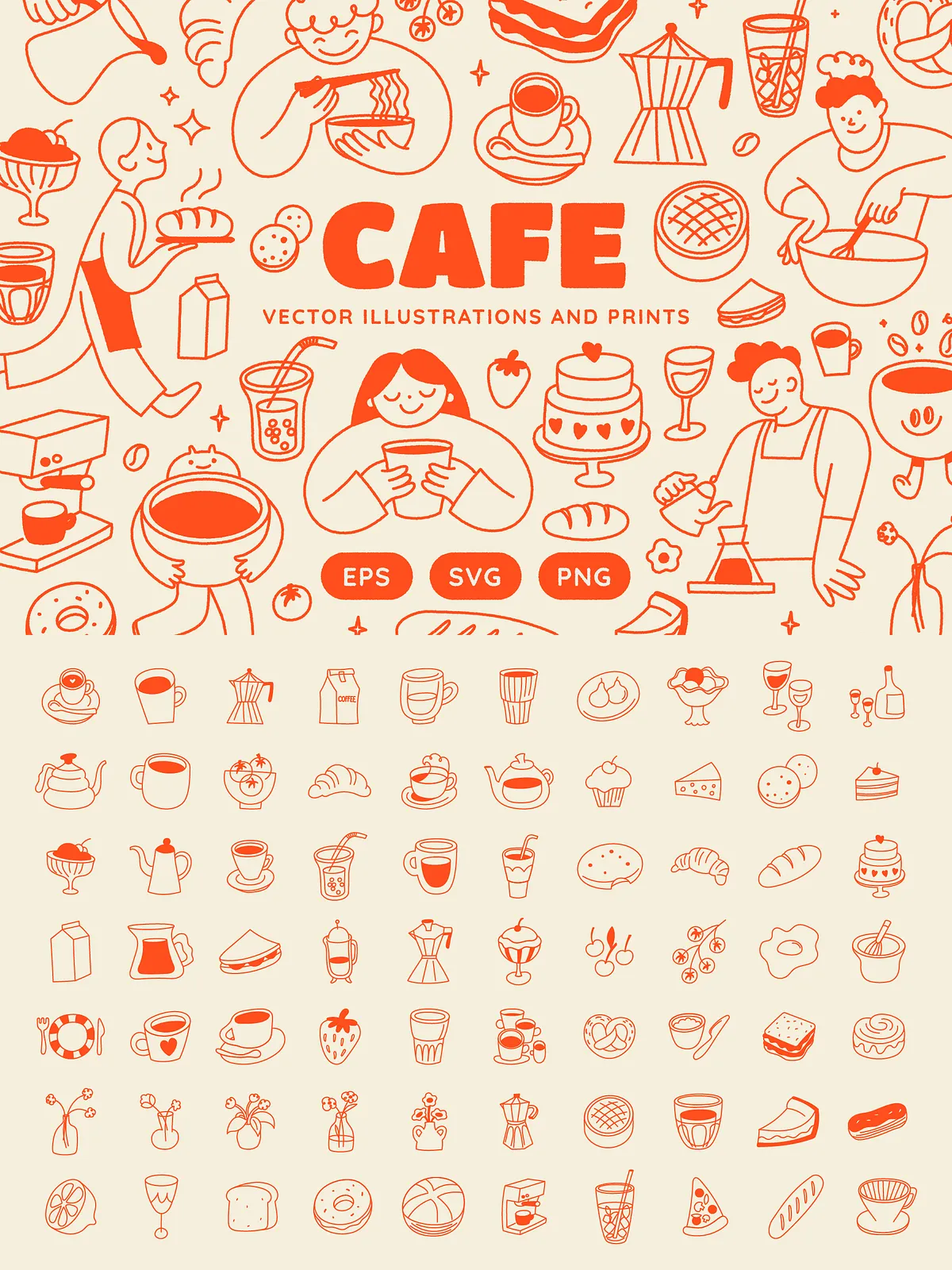 • 140 Unique Hand-Drawn Vector Illustrations: Covering a wide range of concepts including baristas, waiters, bakers, animals (cats, dogs, foxes), food & drink icons (coffee, matcha, wine, pizza, sandwiches, bagels, gelato), fresh fruits, flowers, breakfast items, and casual brunch scenes.