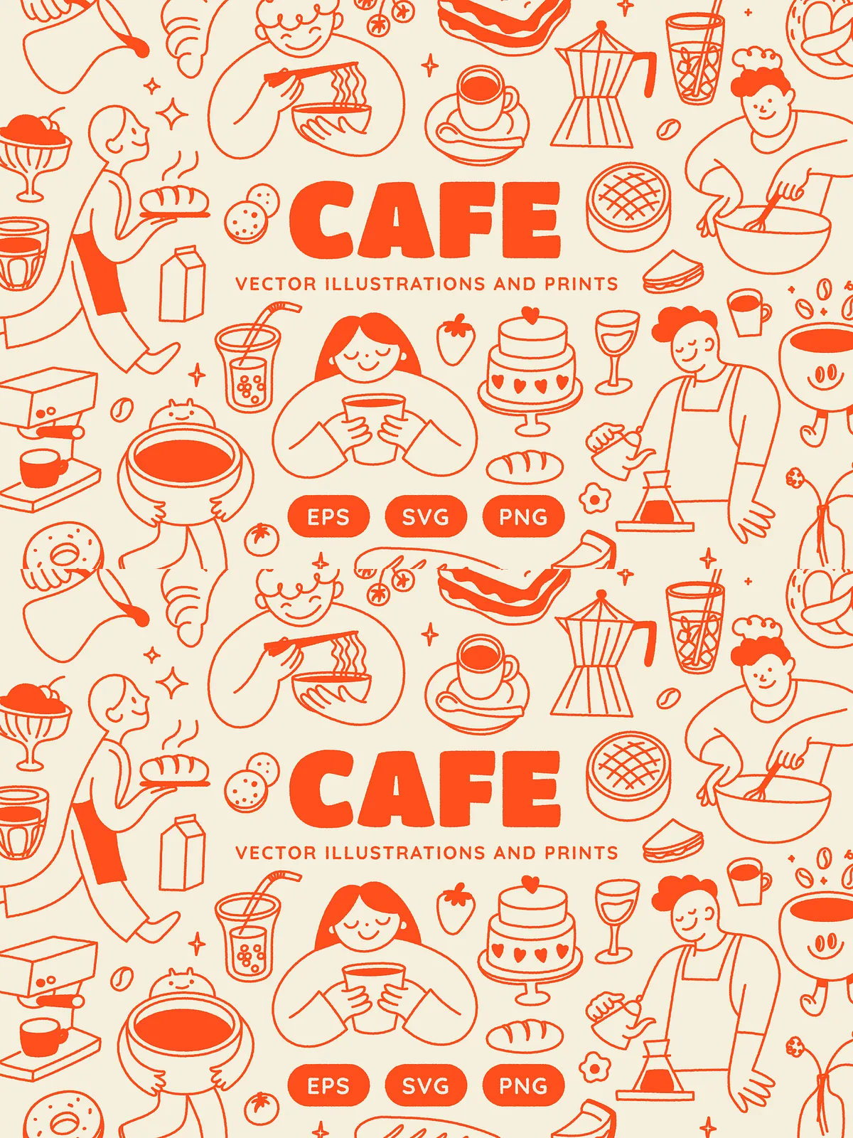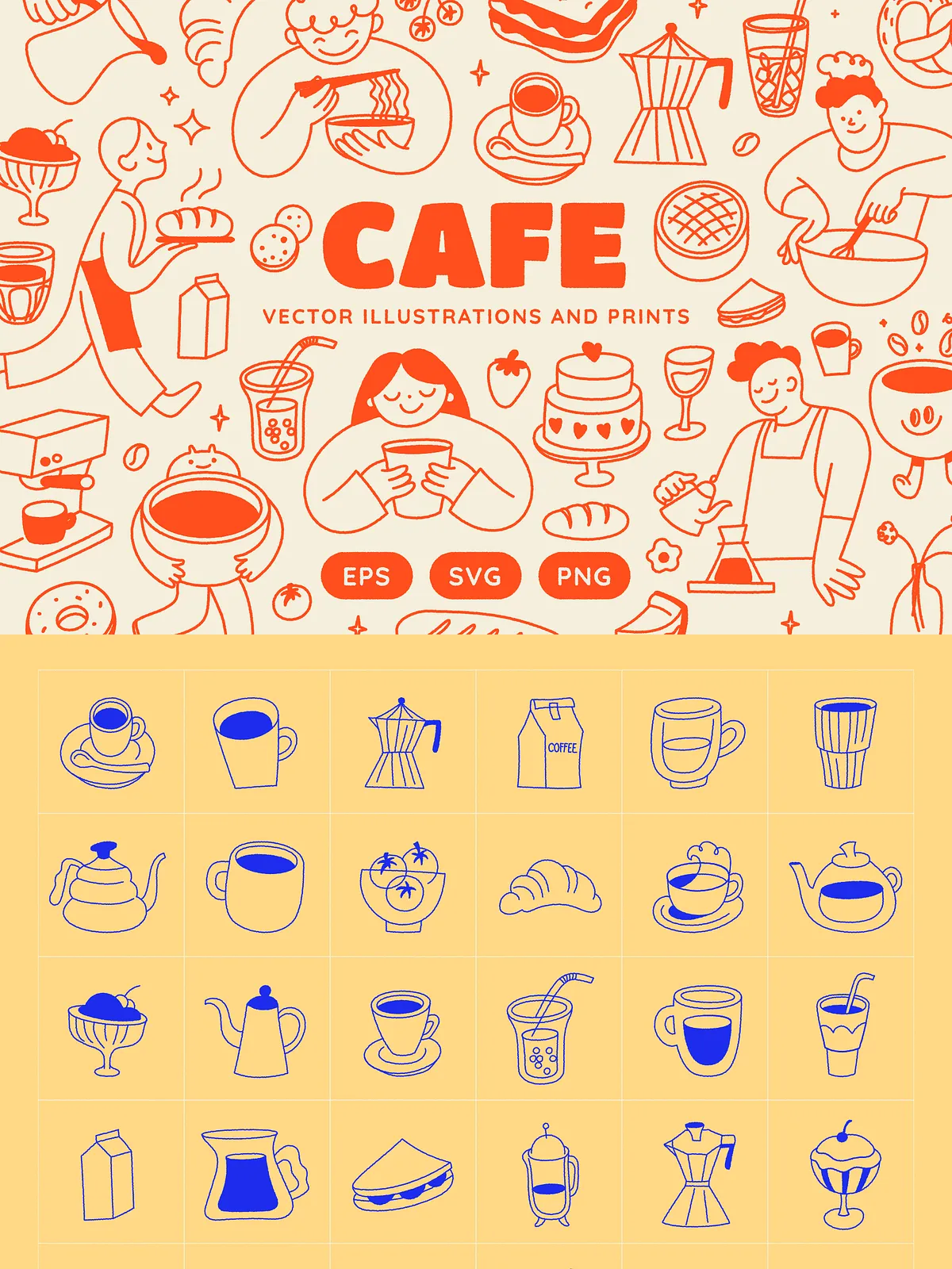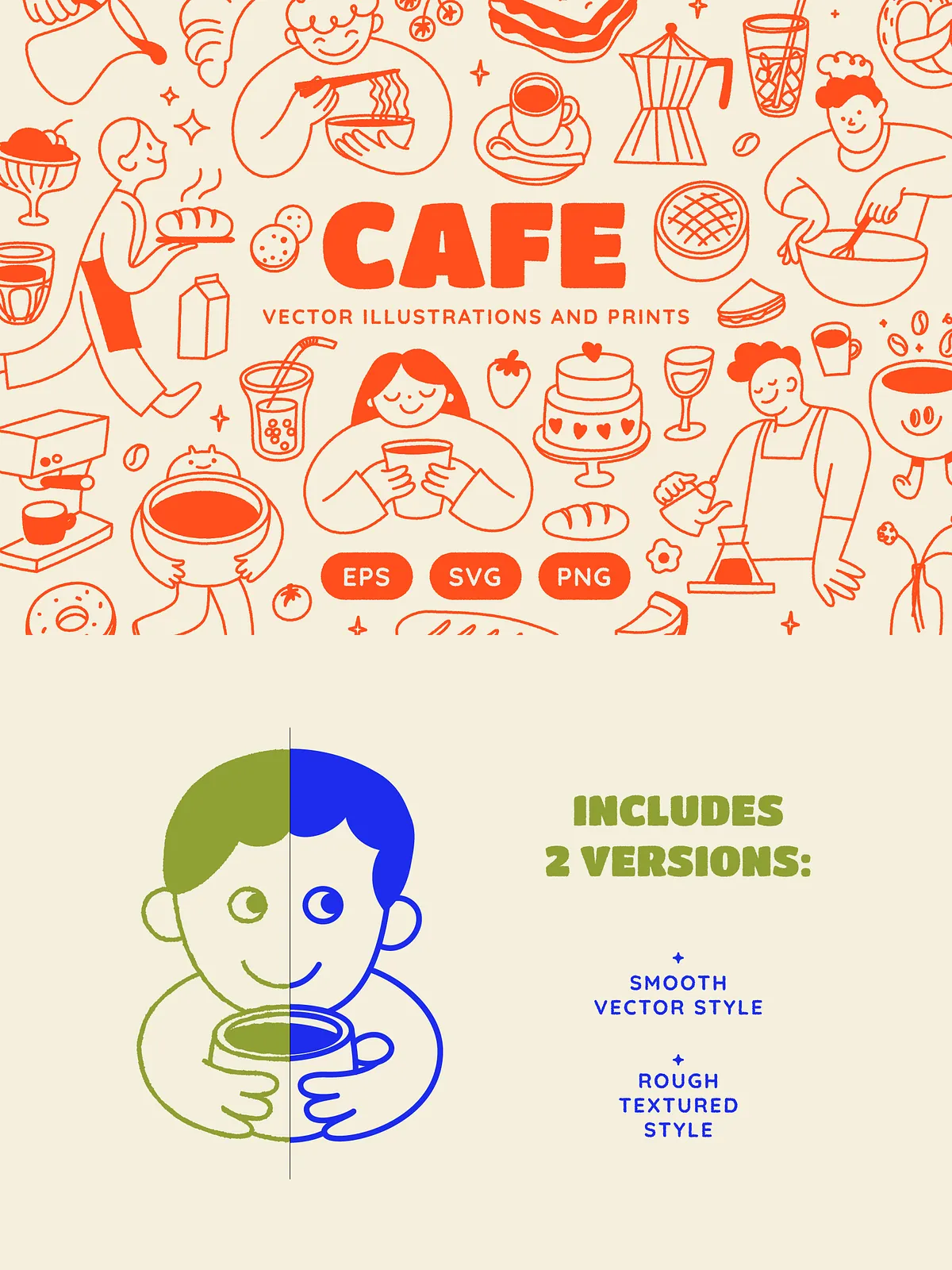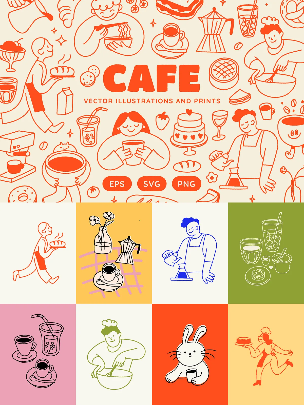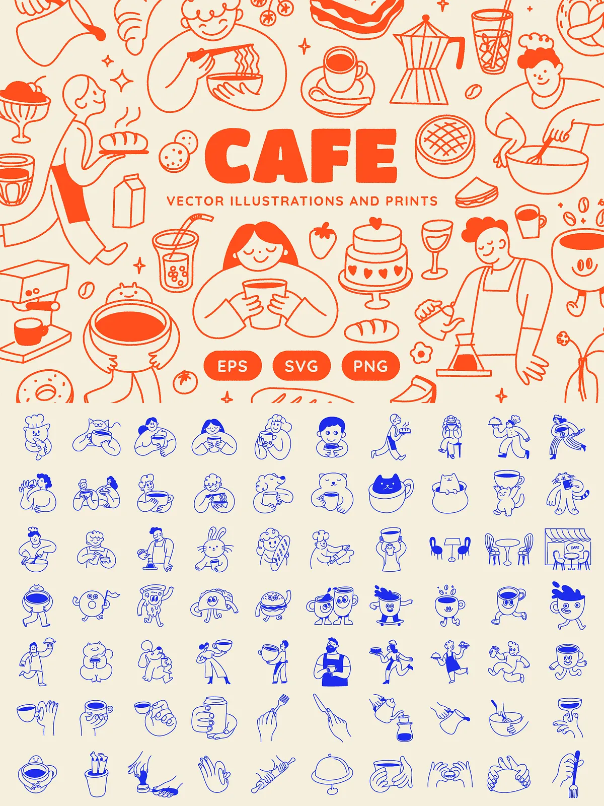 Built from careful sketching and thoughtful composition, each illustration captures the authentic spirit of café culture — from smiling baristas pouring latte art to cheerful animals enjoying a bagel breakfast, and from steaming cups of matcha to fresh-baked pastries under soft morning light. The collection features 140 unique, fully vector-based elements, all crafted for maximum scalability, editability, and seamless integration into your design workflow.