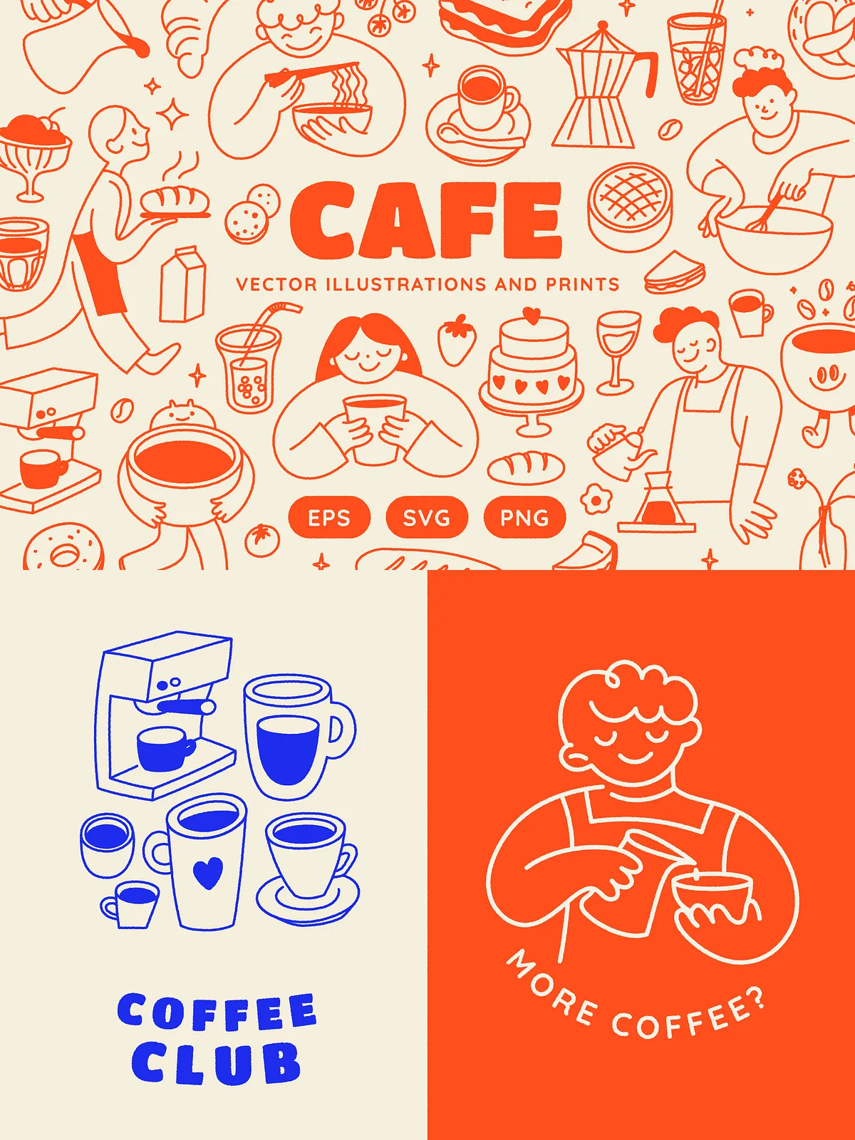 • Packaging & Label Design: Apply the illustrations to coffee bags, gift boxes, drink wraps, and bottle labels for eye-catching, on-trend packaging with instant brand recognition.