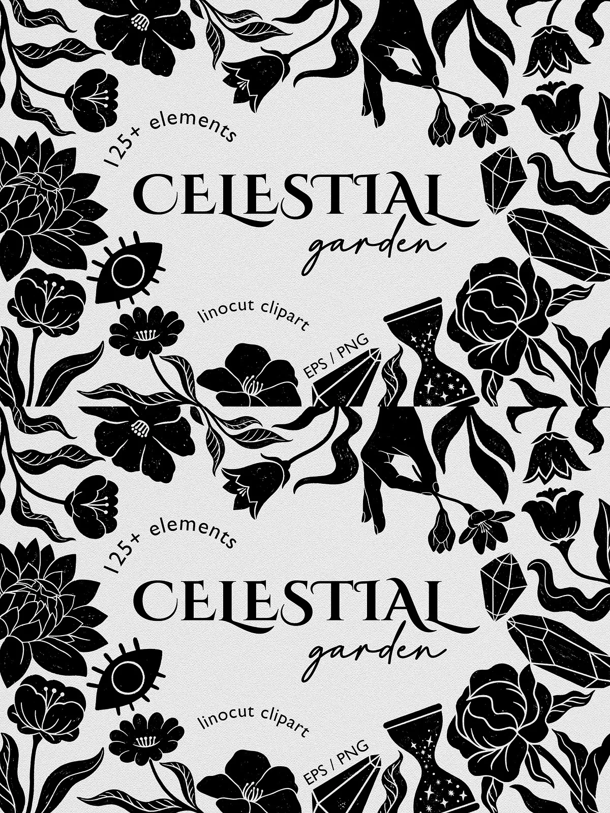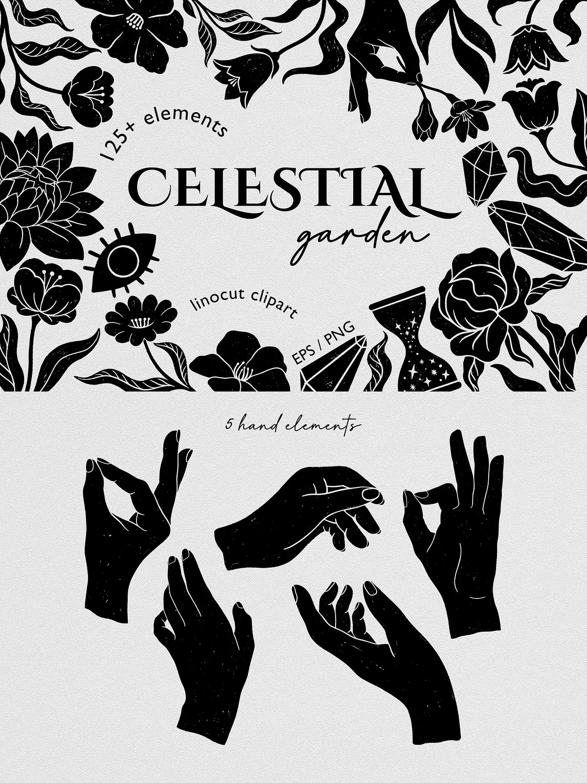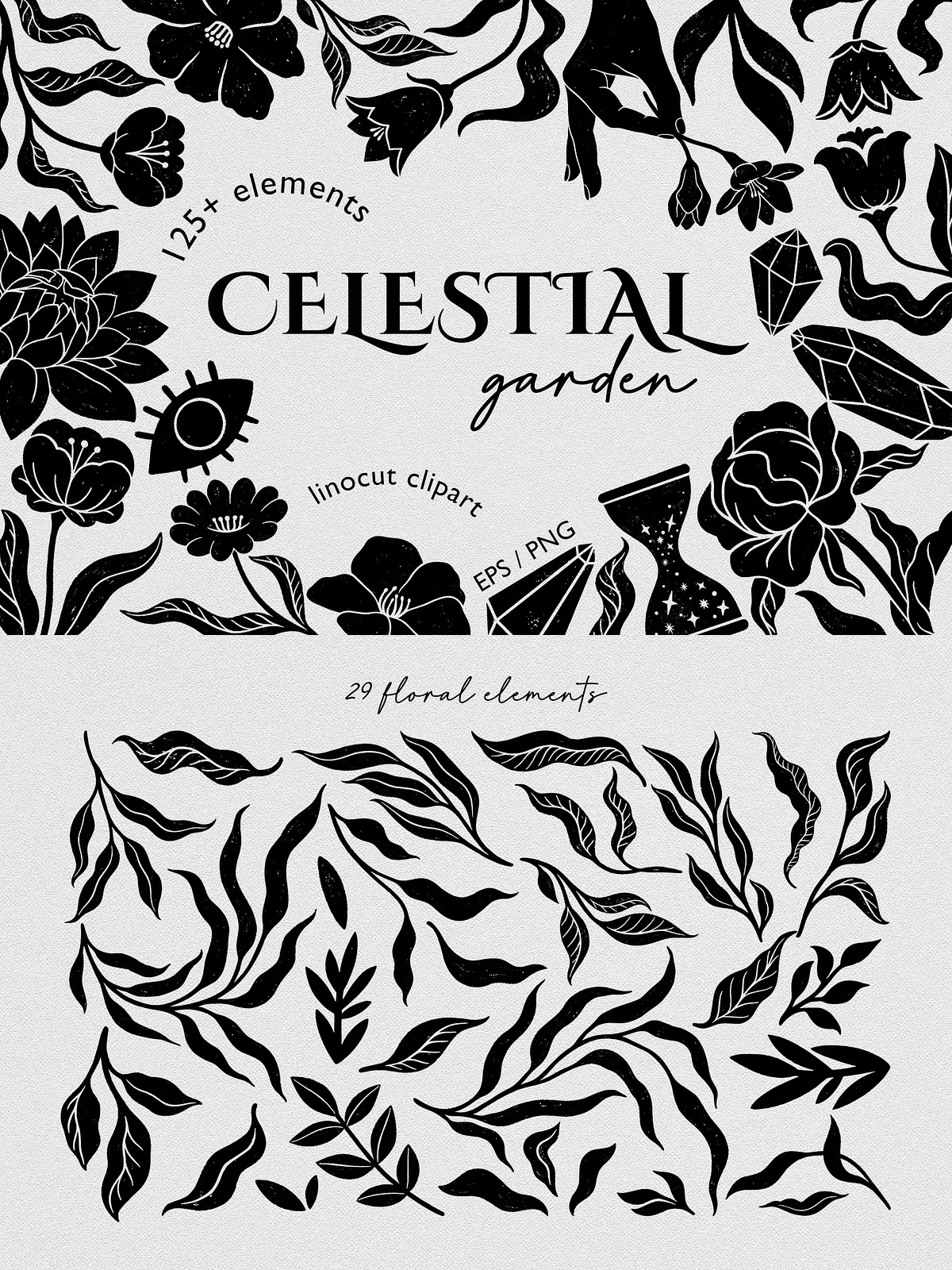 Transform your creative projects with our Celestial Garden Collection – a comprehensive set of 125+ hand-drawn floral elements featuring authentic linocut textures. This premium design resource combines cosmic-inspired motifs with timeless artistic techniques, offering unparalleled versatility for modern designers seeking to create sophisticated, nature-infused visuals.