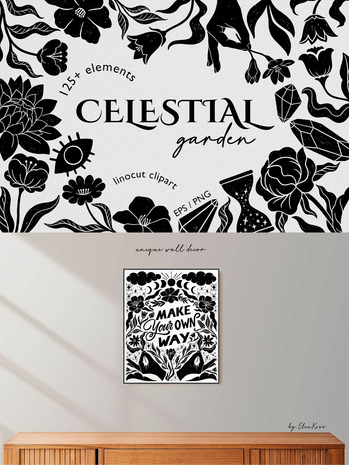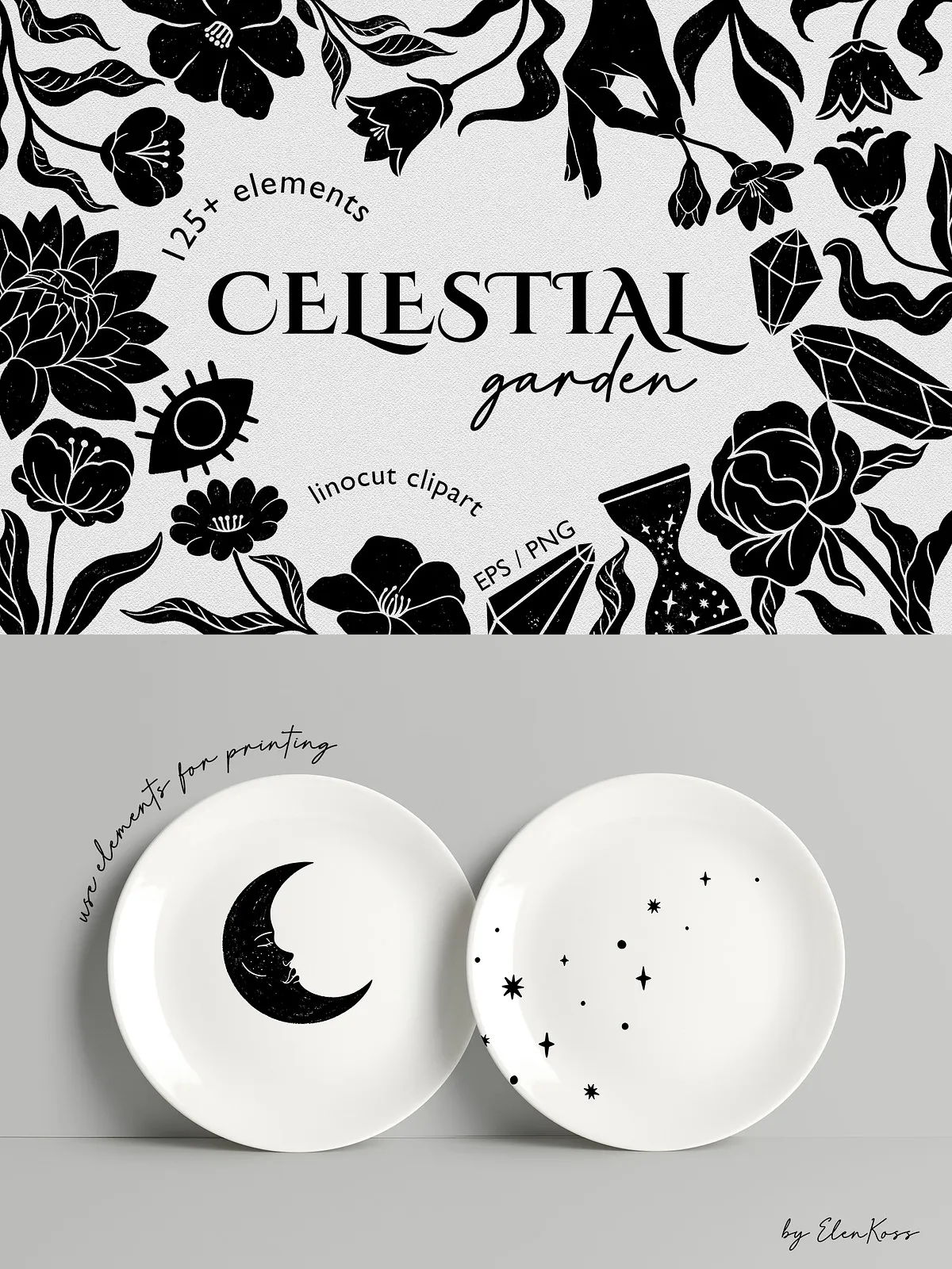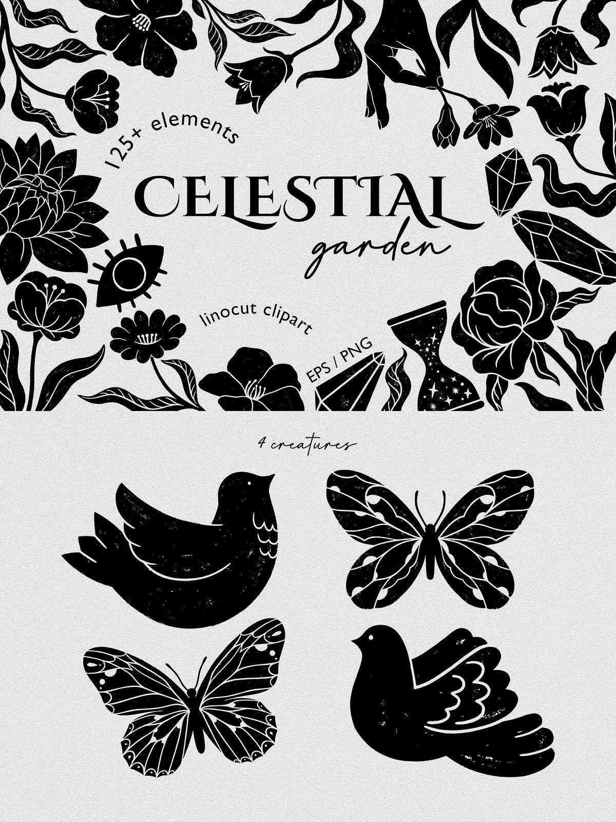Transform your creative projects with our Celestial Garden Collection – a comprehensive set of 125+ hand-drawn floral elements featuring authentic linocut textures. This premium design resource combines cosmic-inspired motifs with timeless artistic techniques, offering unparalleled versatility for modern designers seeking to create sophisticated, nature-infused visuals.