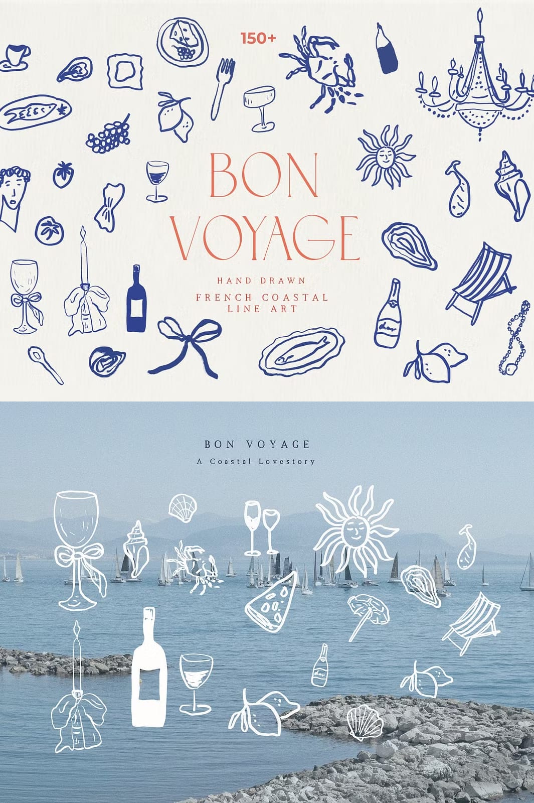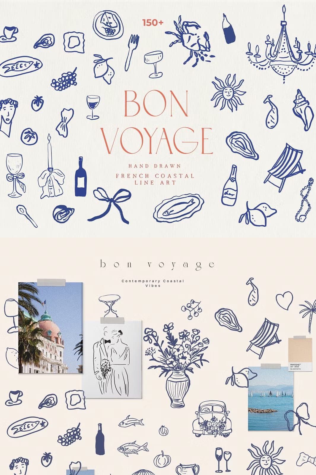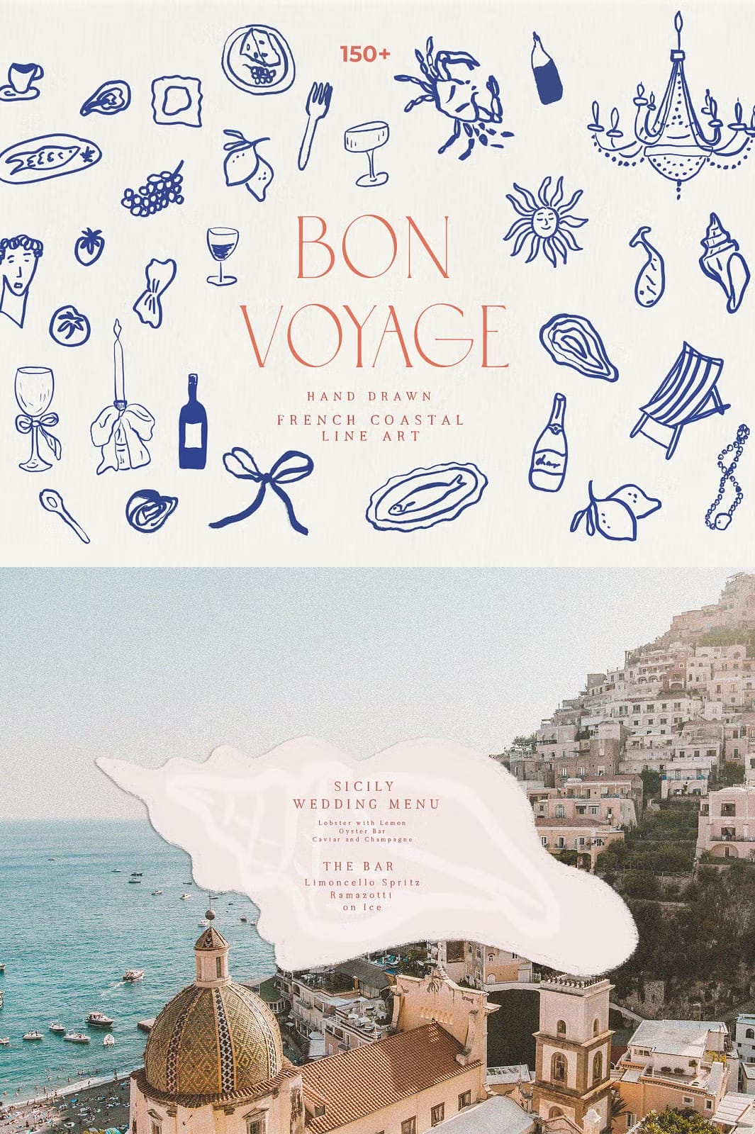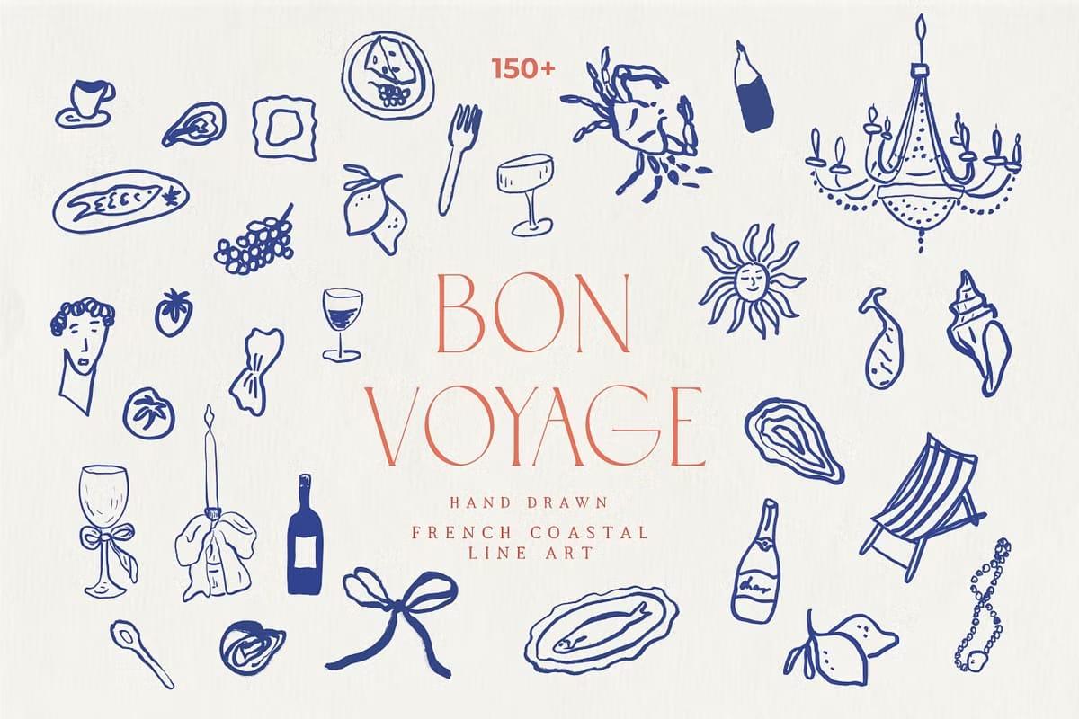 Discover the handmade Bon Voyage collection and get inspired by the essence of a French summer and coastal lifestyle. Entirely hand drawn and crafted by hand, this beautiful collection transports a distinct Dolce Vita Mediterranean vibe. The unique line art drawings bring a handcrafted elegance perfect for weddings, home decor, packaging and branding. Enrich your offerings with this captivating set, and let your customers experience the handcrafted beauty and romance of the Mediterranean.