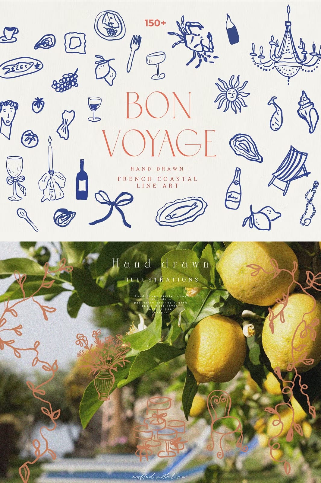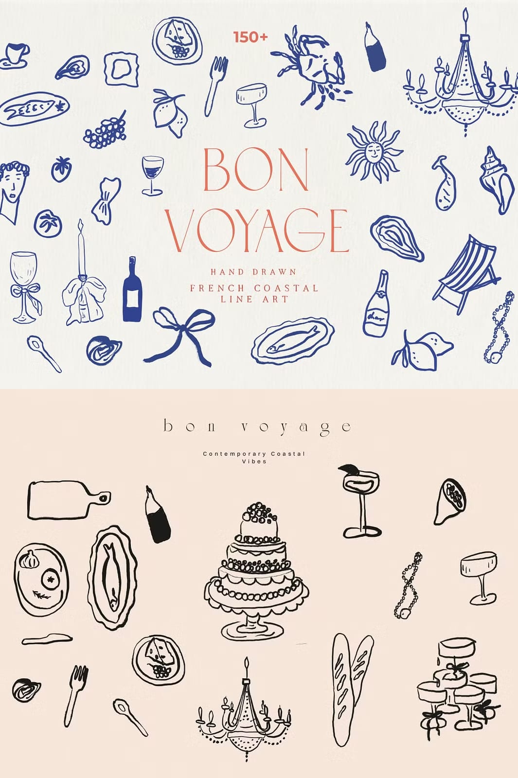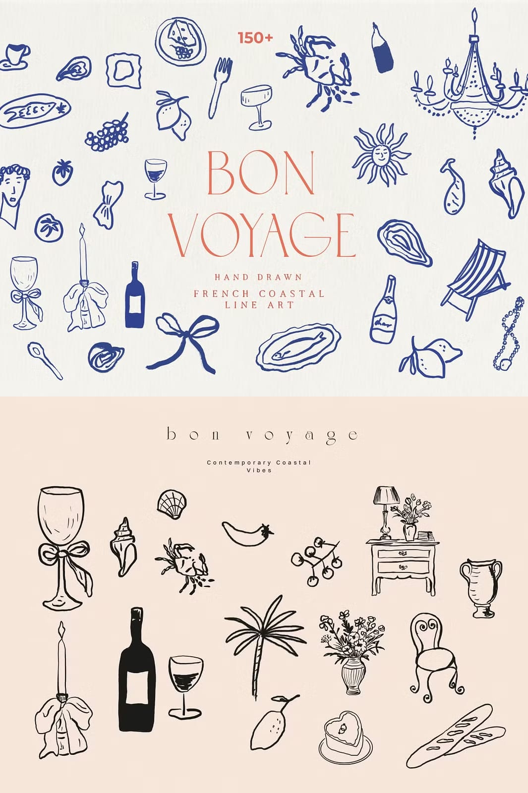Discover the handmade Bon Voyage collection and get inspired by the essence of a French summer and coastal lifestyle. Entirely hand drawn and crafted by hand, this beautiful collection transports a distinct Dolce Vita Mediterranean vibe. The unique line art drawings bring a handcrafted elegance perfect for weddings, home decor, packaging and branding. Enrich your offerings with this captivating set, and let your customers experience the handcrafted beauty and romance of the Mediterranean.