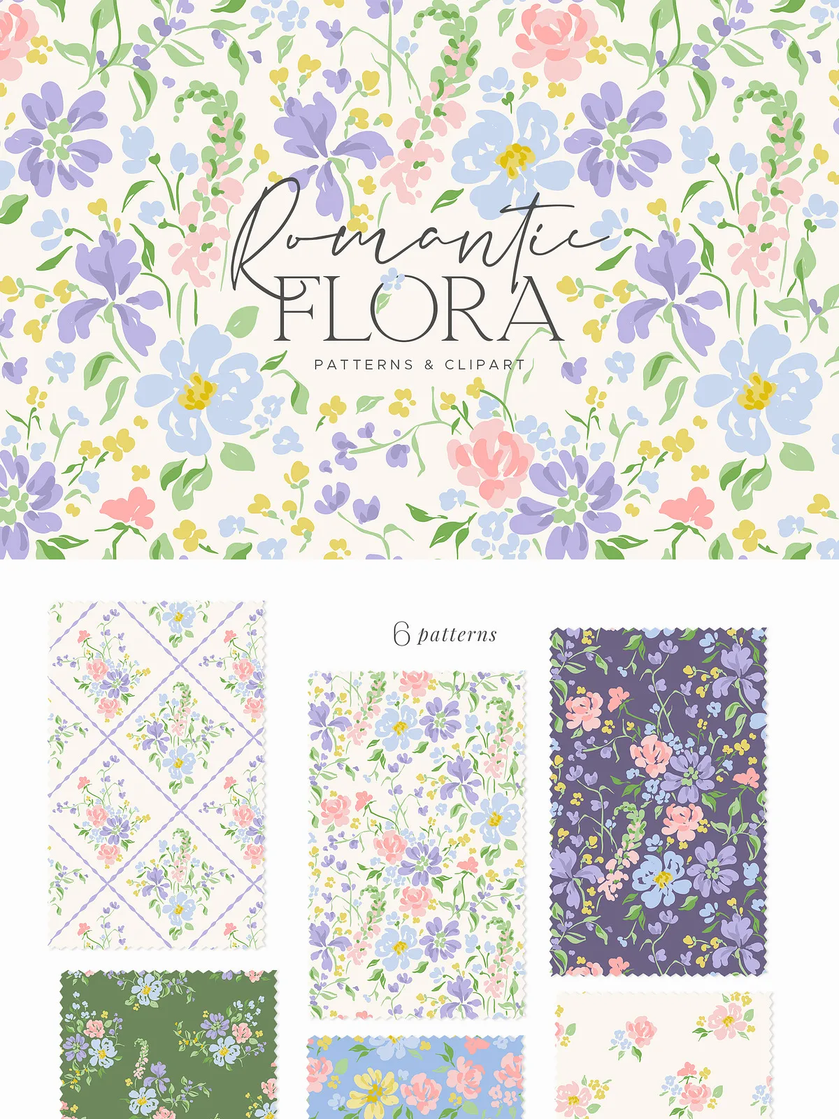- 6 seamless floral patterns: Create elegant backdrops or repeated design surfaces with these smooth, tileable patterns, supplied in AI, EPS, and high-resolution JPG formats.