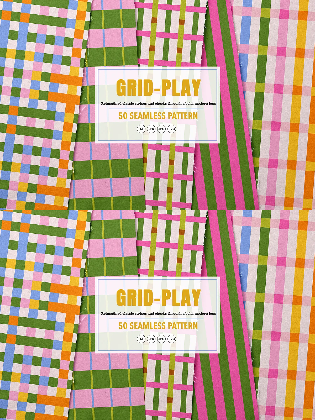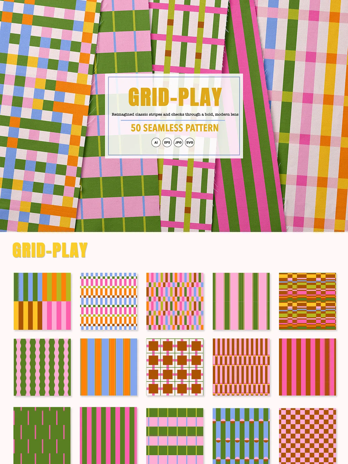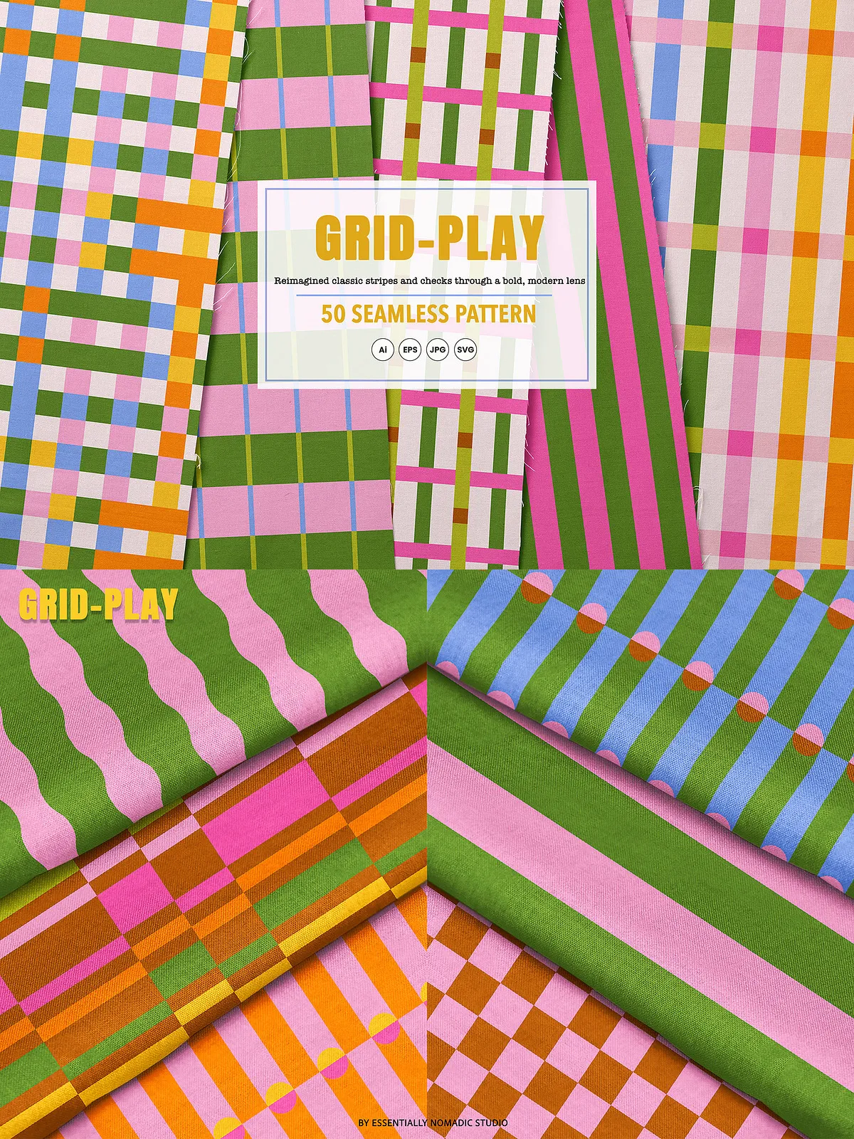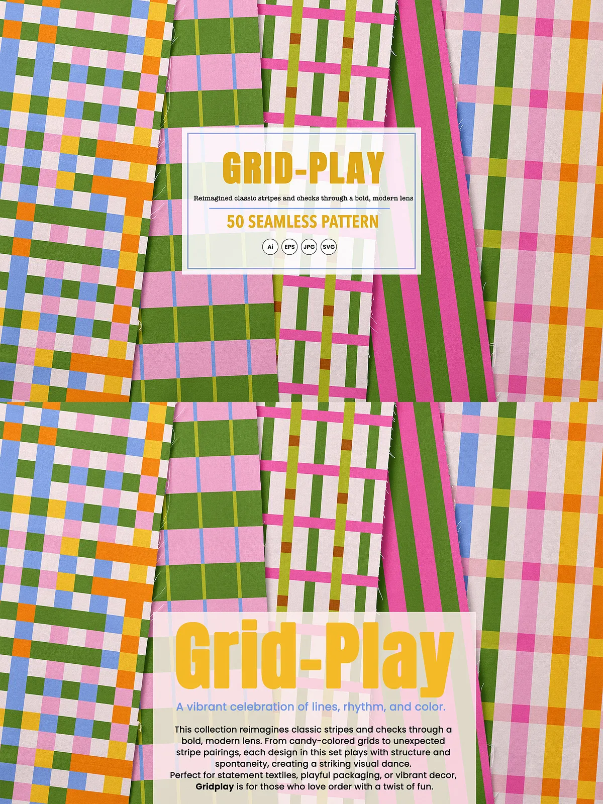 Step into the future of pattern design with “Grid Play” — a fearless, vibrant collection that dares to break the rules. This isn’t your average set of stripes and plaids. Instead, it’s a full-throttle celebration of rhythm, motion, and fearless color that transforms classic forms into modern masterpieces. With sharp lines, wavy distortions, broken repeats, and playful clashes of green, pink, orange, yellow, and blue, this collection is engineered to grab attention and keep it.