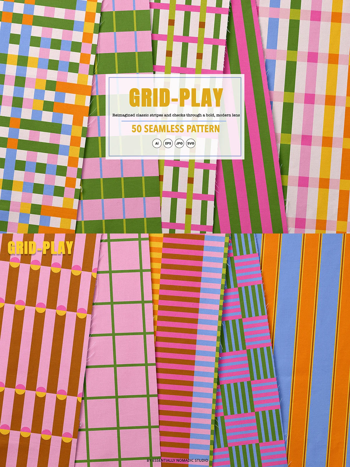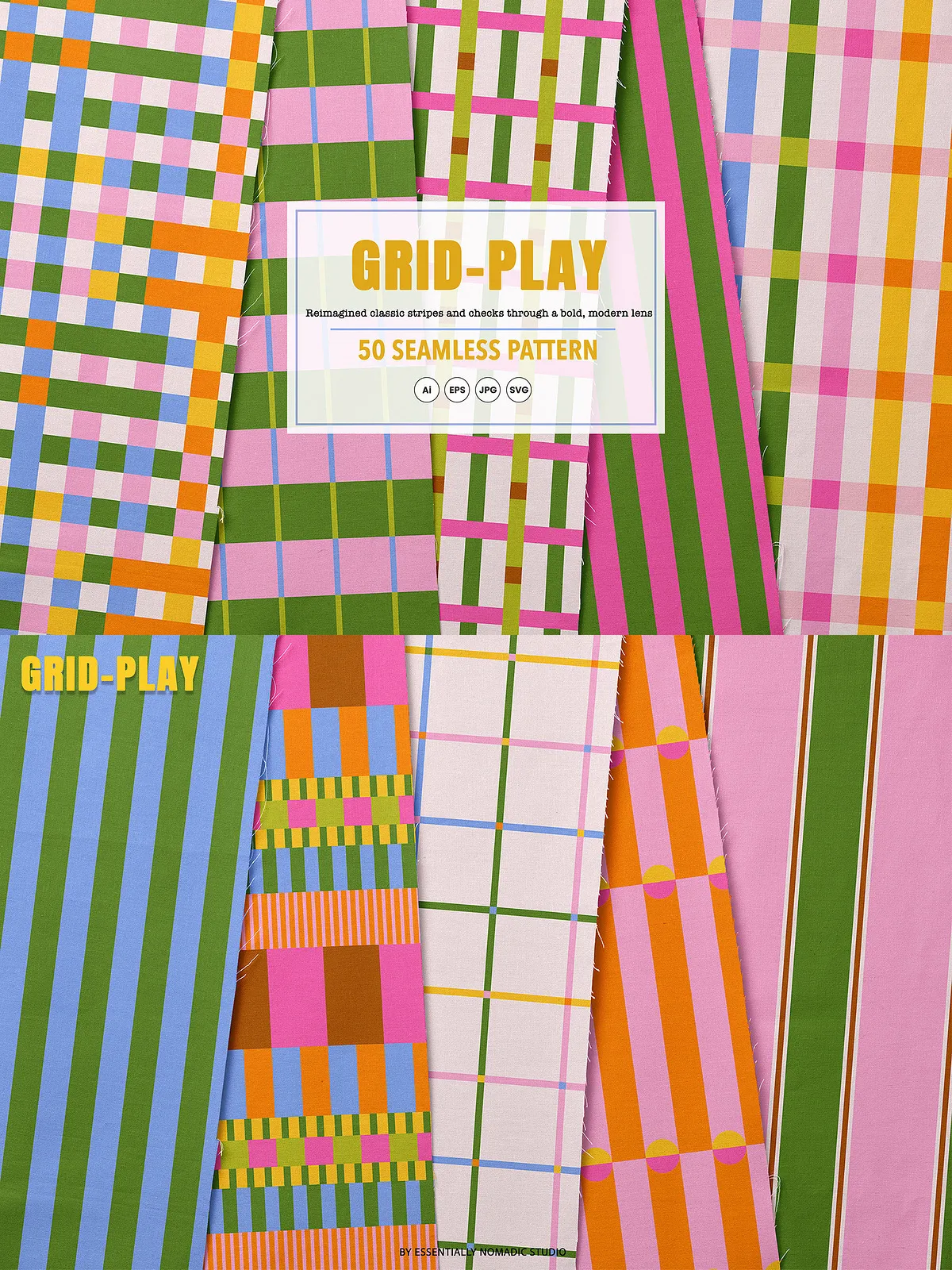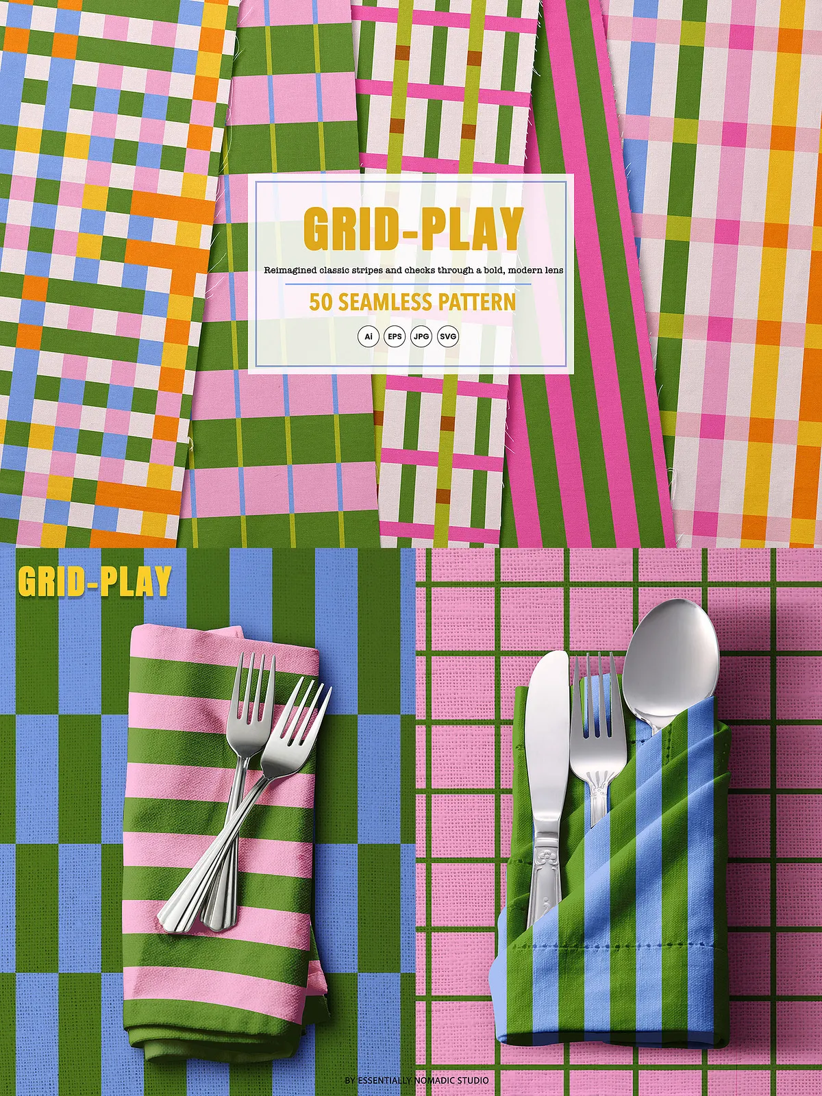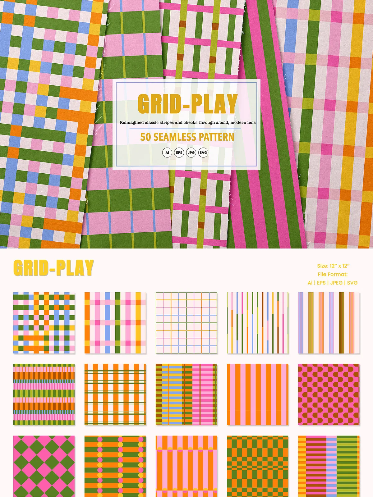 Step into the future of pattern design with “Grid Play” — a fearless, vibrant collection that dares to break the rules. This isn’t your average set of stripes and plaids. Instead, it’s a full-throttle celebration of rhythm, motion, and fearless color that transforms classic forms into modern masterpieces. With sharp lines, wavy distortions, broken repeats, and playful clashes of green, pink, orange, yellow, and blue, this collection is engineered to grab attention and keep it.