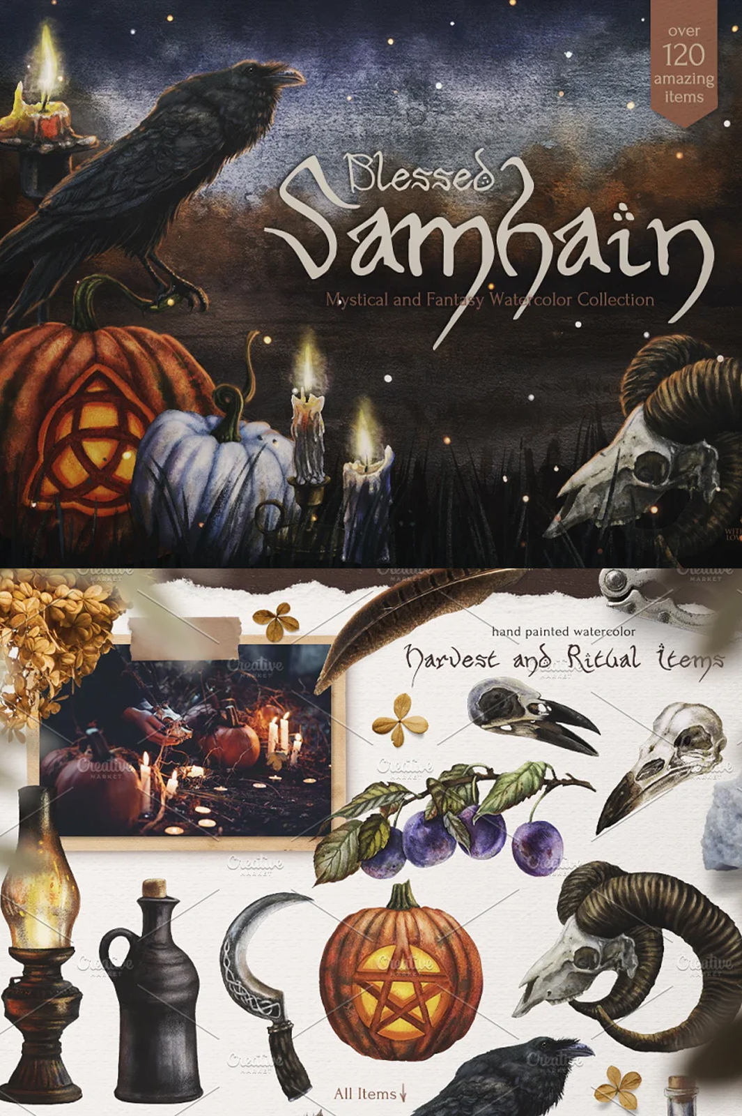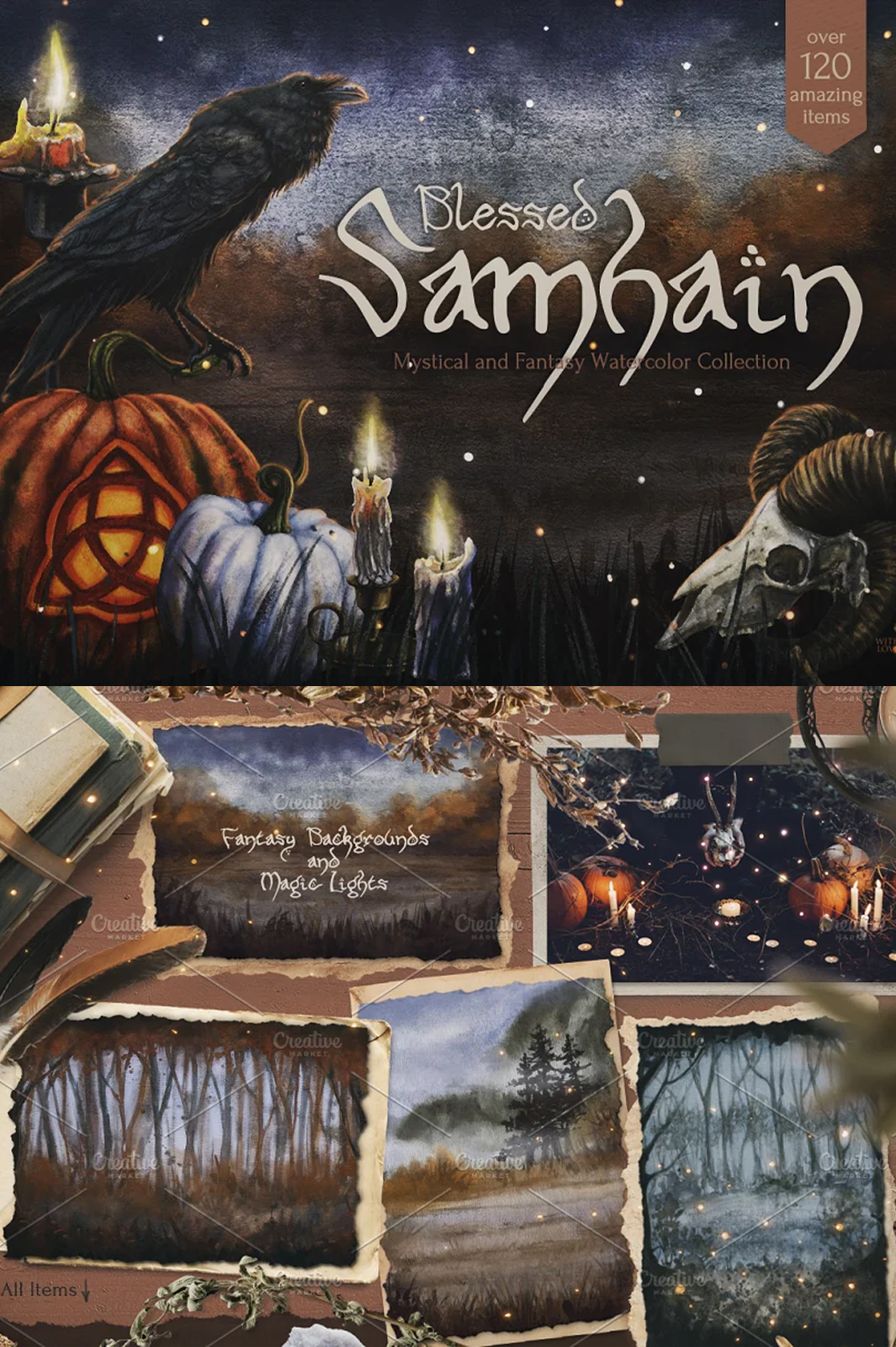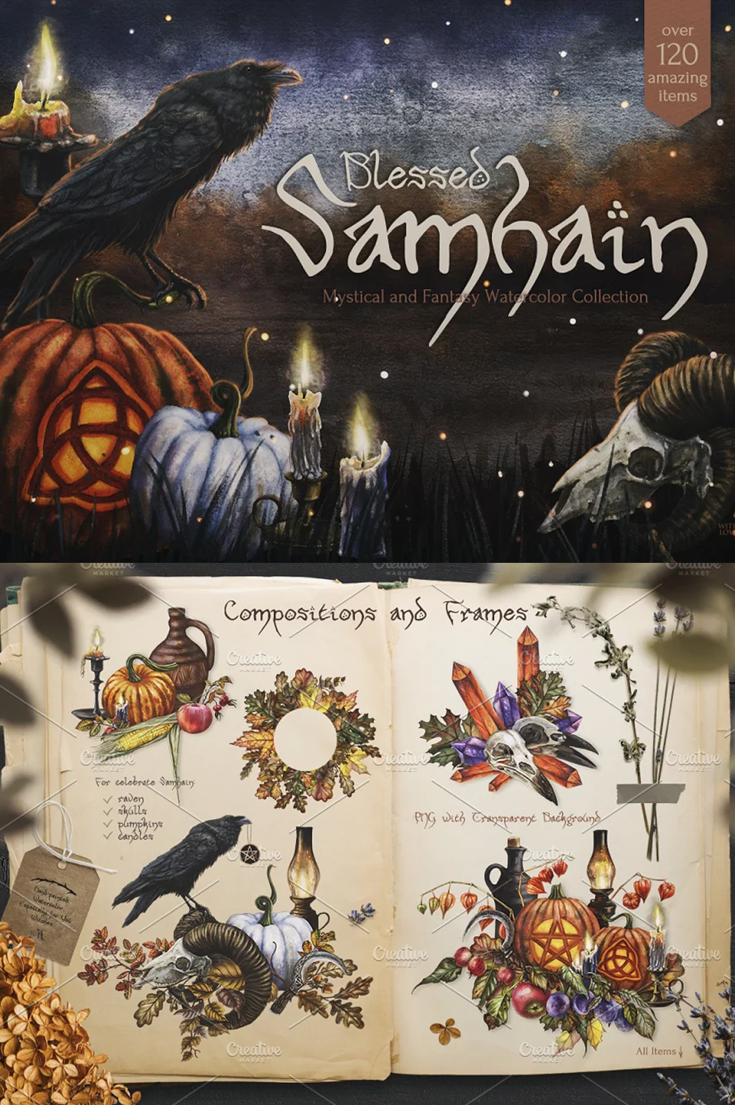 All 122 items are made with soul and love, it’s filled with the warm flame of candles and the cold darkness of long autumn nights. Here you will find gifts of the harvest season, pottery and ritual objects. Illustrations, textures, backgrounds, seamless patterns, overlays and wreaths are designed to help you involve yourself in the enchanting and mystical Samhain atmosphere.