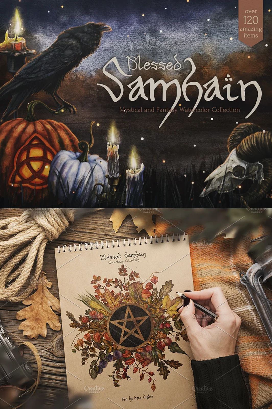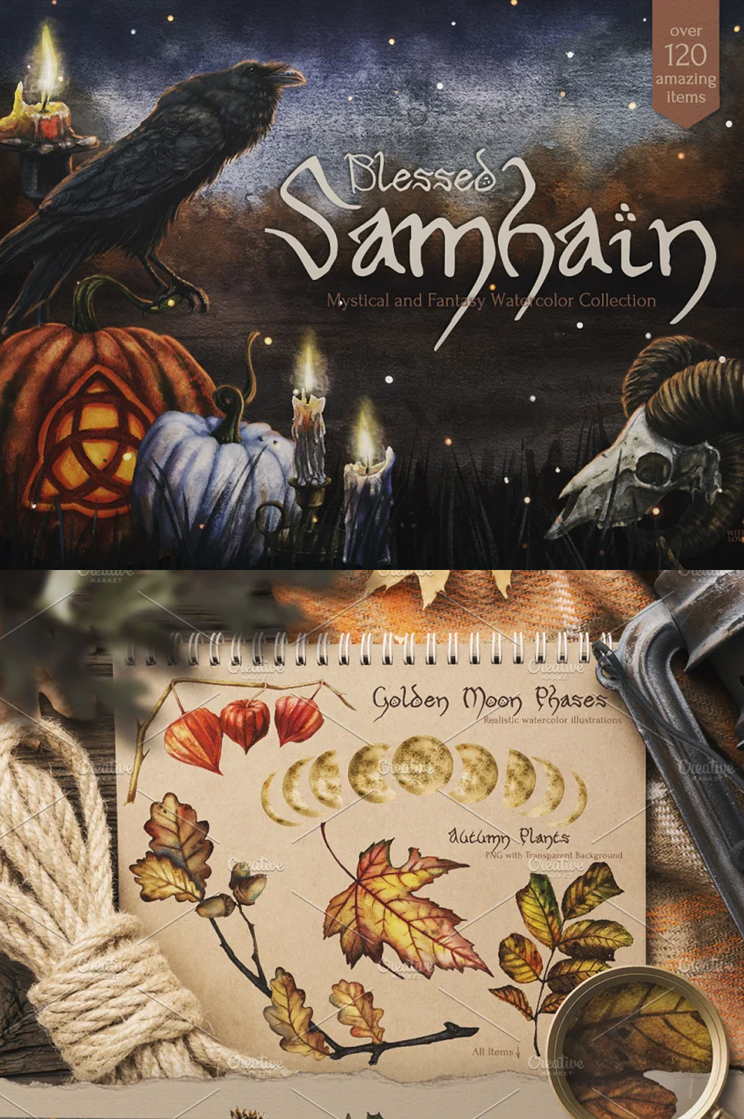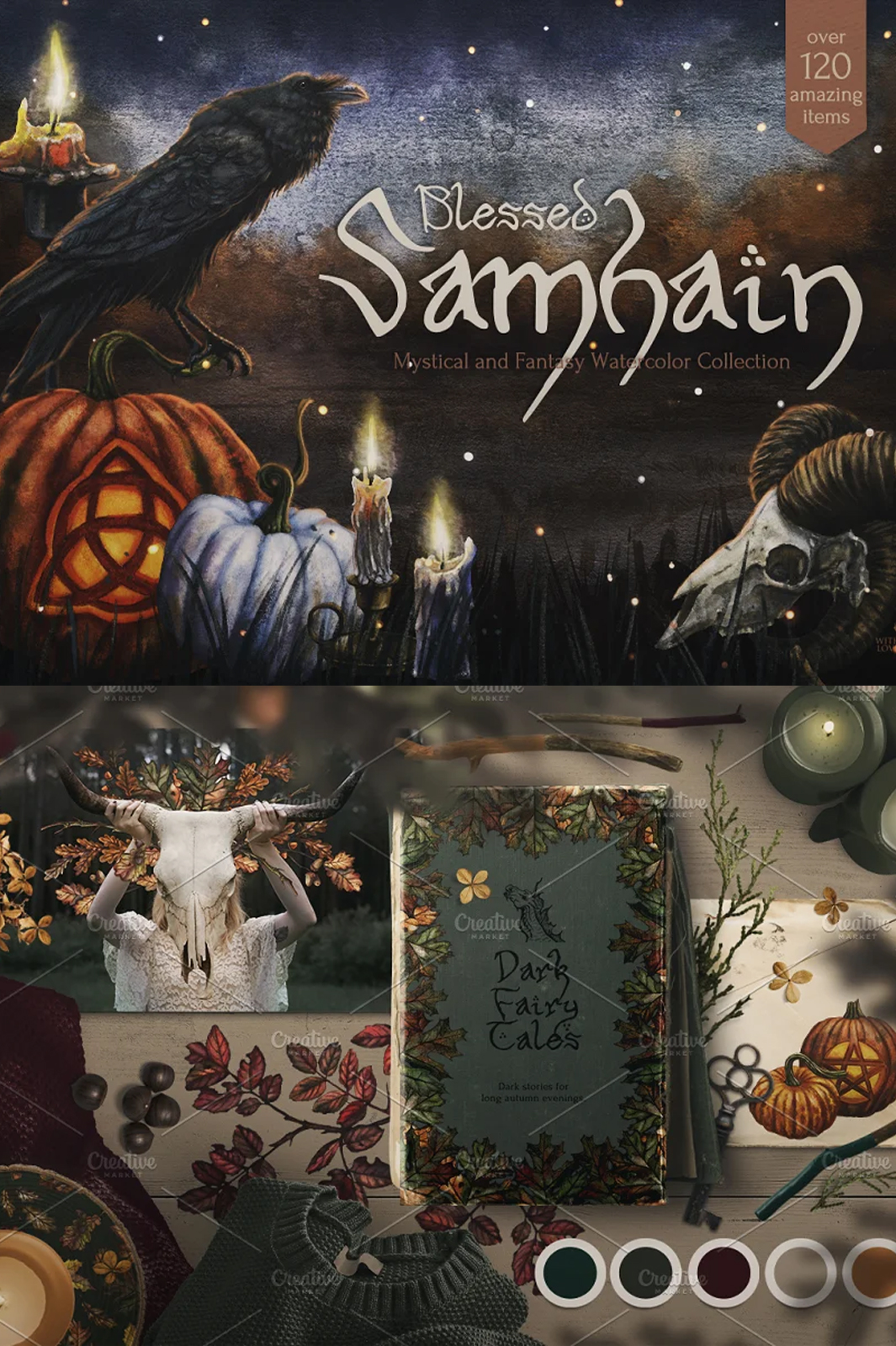 All 122 items are made with soul and love, it’s filled with the warm flame of candles and the cold darkness of long autumn nights. Here you will find gifts of the harvest season, pottery and ritual objects. Illustrations, textures, backgrounds, seamless patterns, overlays and wreaths are designed to help you involve yourself in the enchanting and mystical Samhain atmosphere.