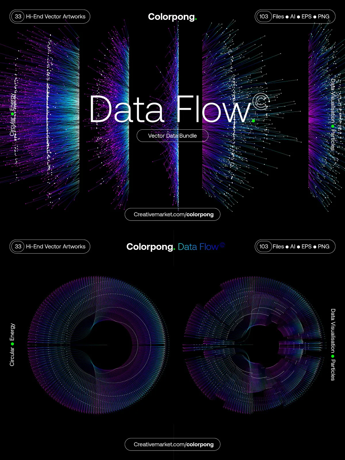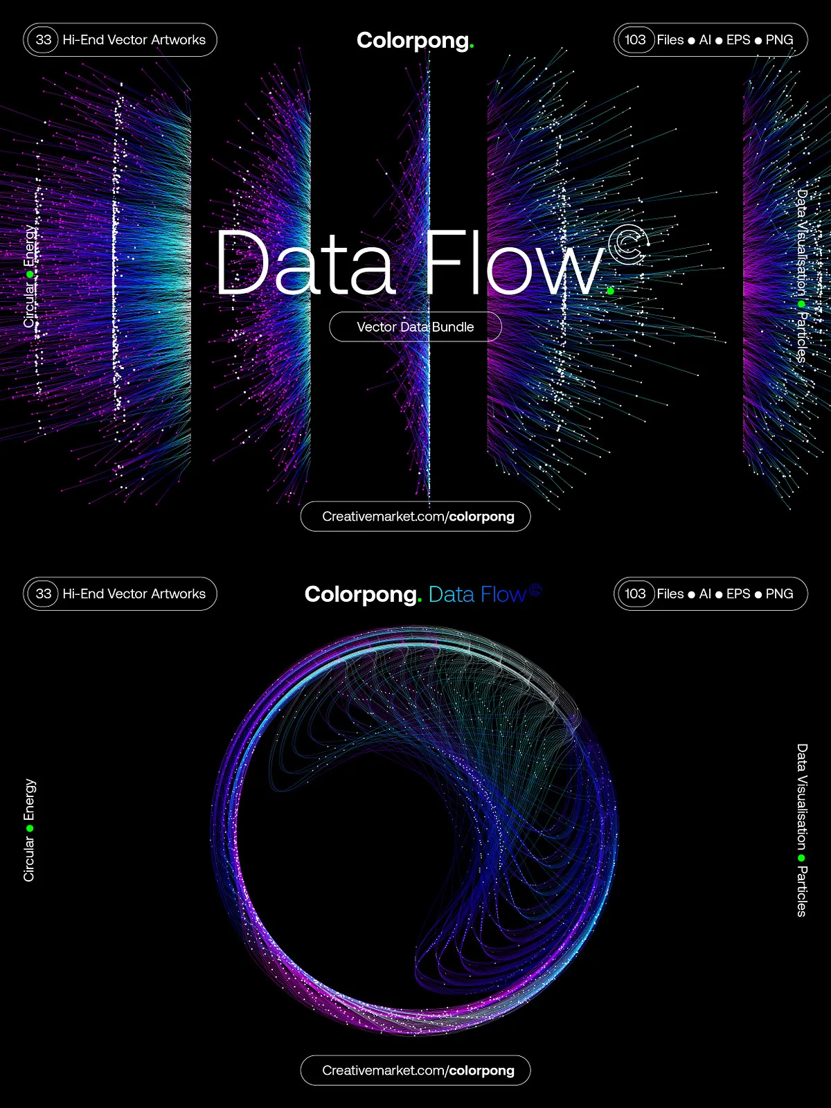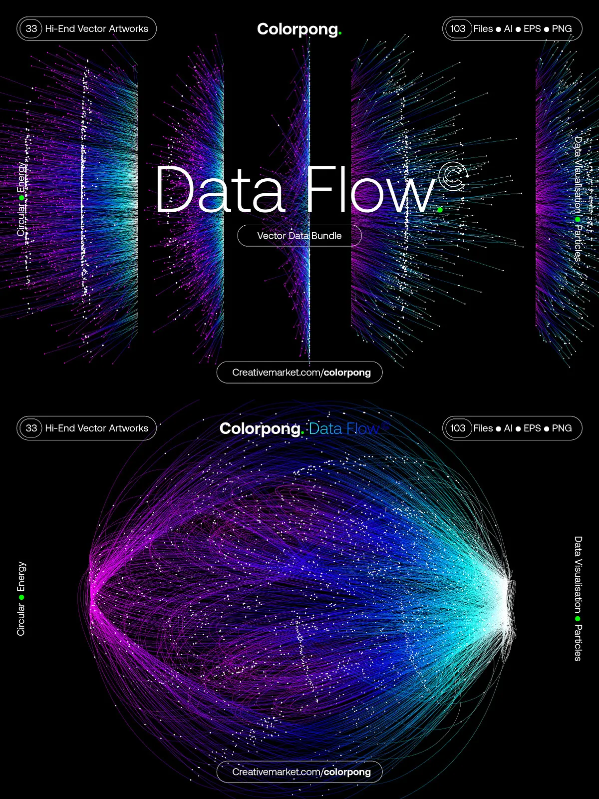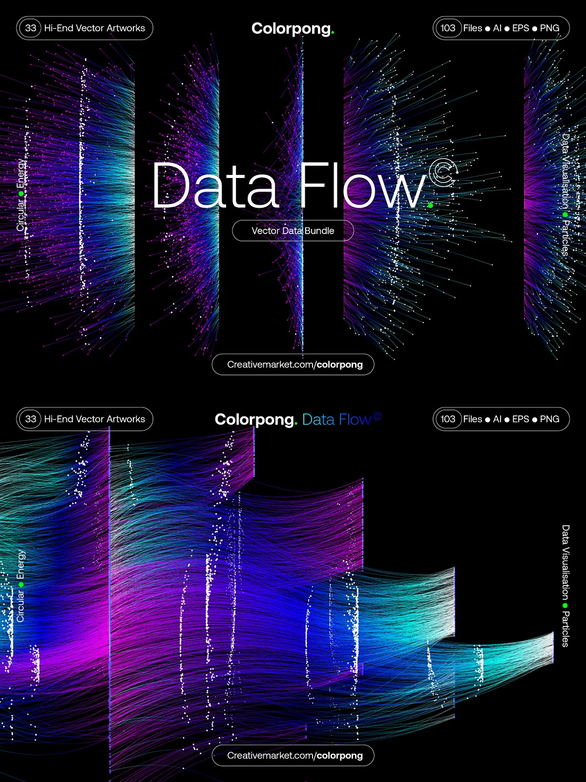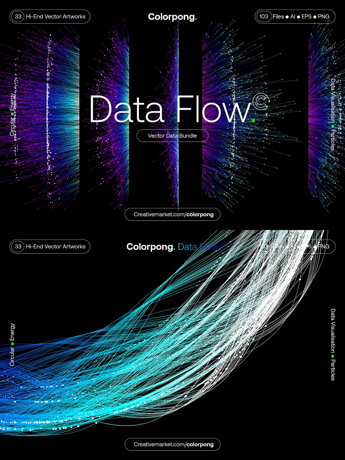 Step into the future of digital design with Colorpong: Data Flow, a bold and innovative vector bundle that transforms abstract data into mesmerizing visual experiences. Containing **33 fully editable, high-energy vector illustrations**, this collection brings life to information through dynamic lines, pulsating gradients, and vibrant graphical systems that scream energy, movement, and modernity.