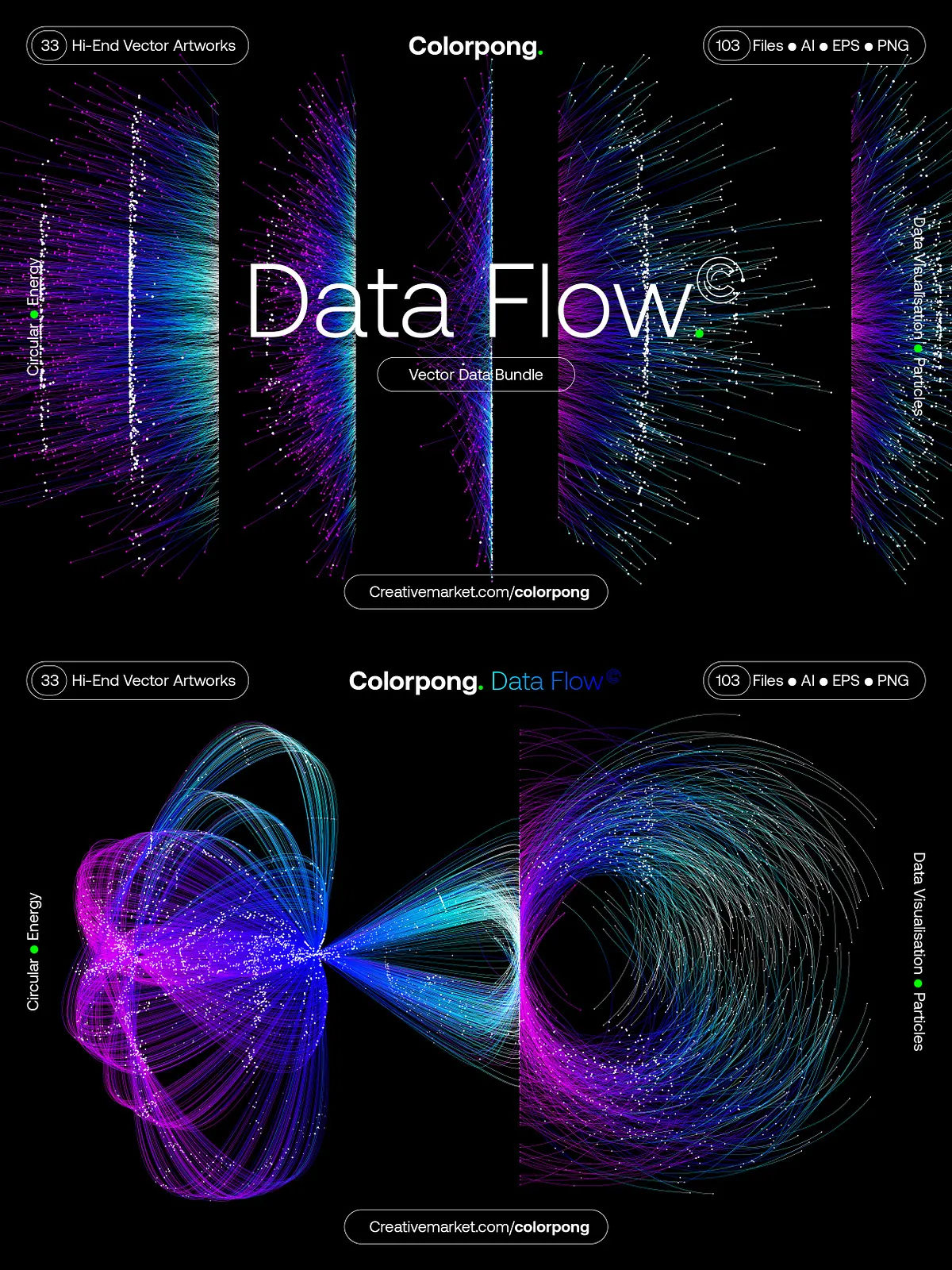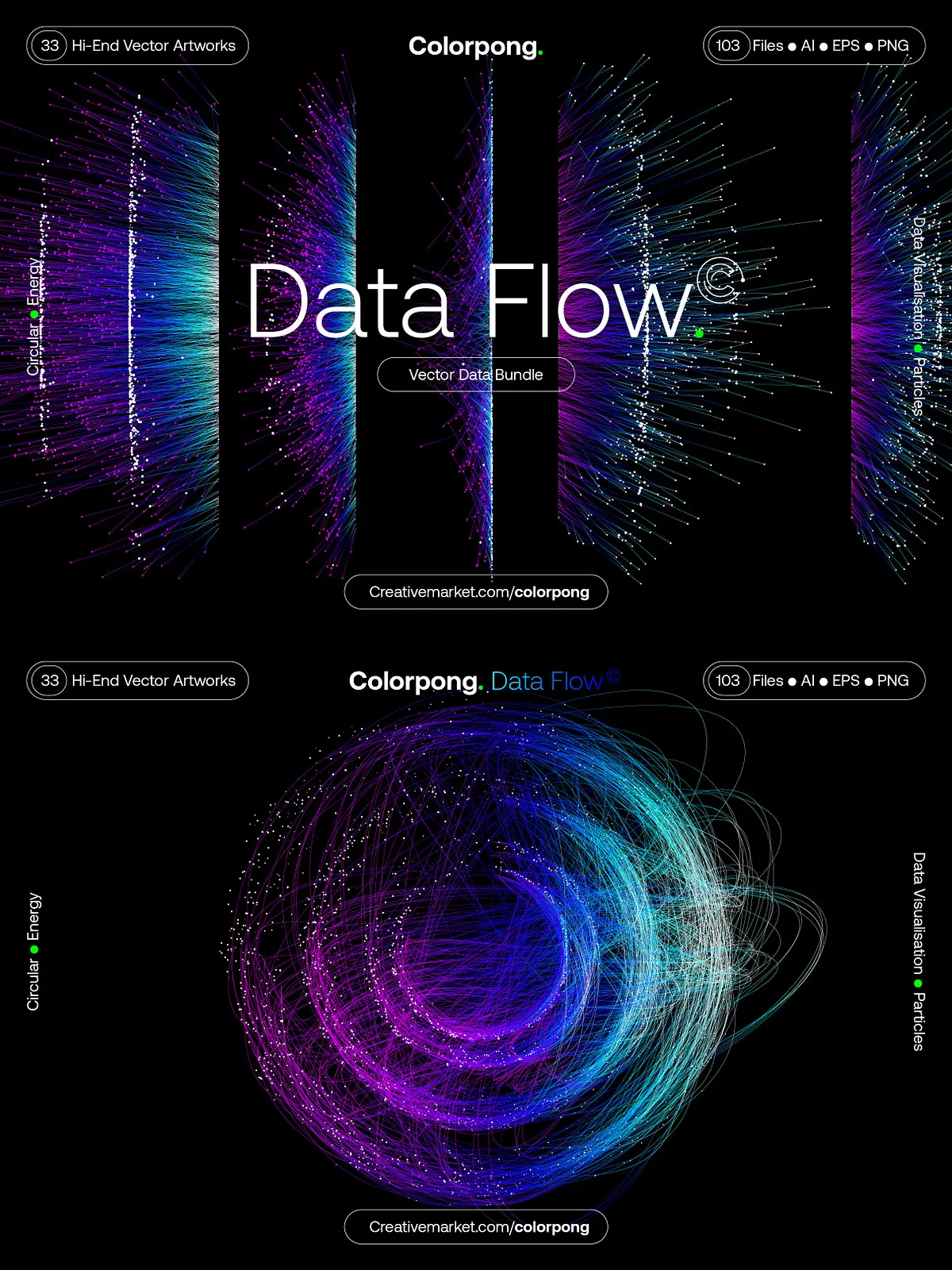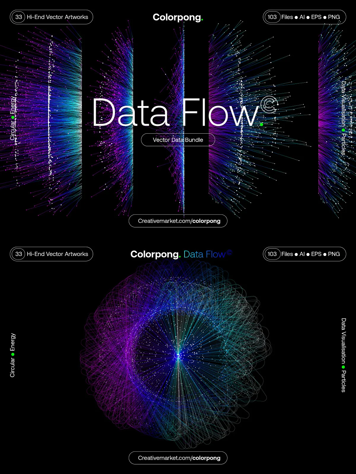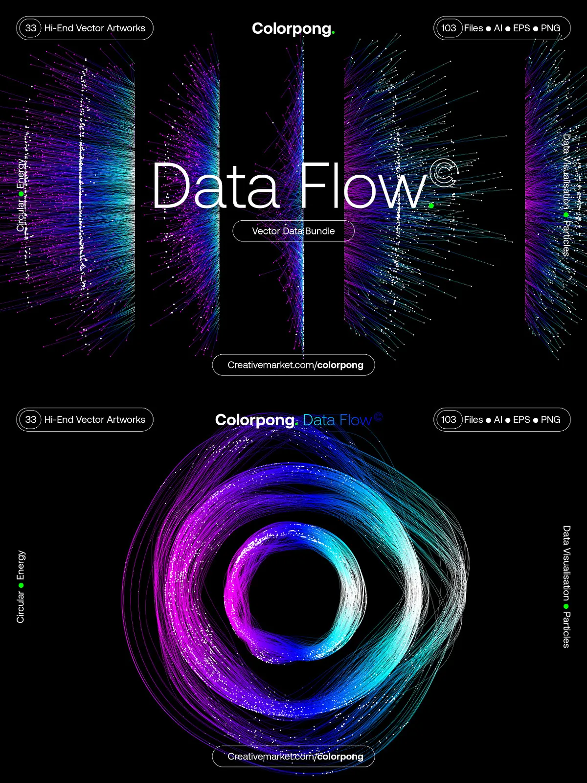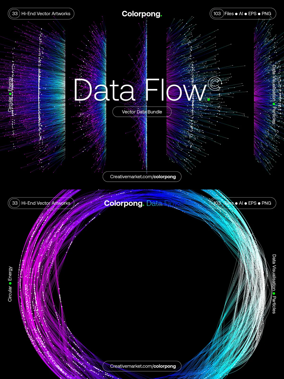 Step into the future of digital design with Colorpong: Data Flow, a bold and innovative vector bundle that transforms abstract data into mesmerizing visual experiences. Containing **33 fully editable, high-energy vector illustrations**, this collection brings life to information through dynamic lines, pulsating gradients, and vibrant graphical systems that scream energy, movement, and modernity.