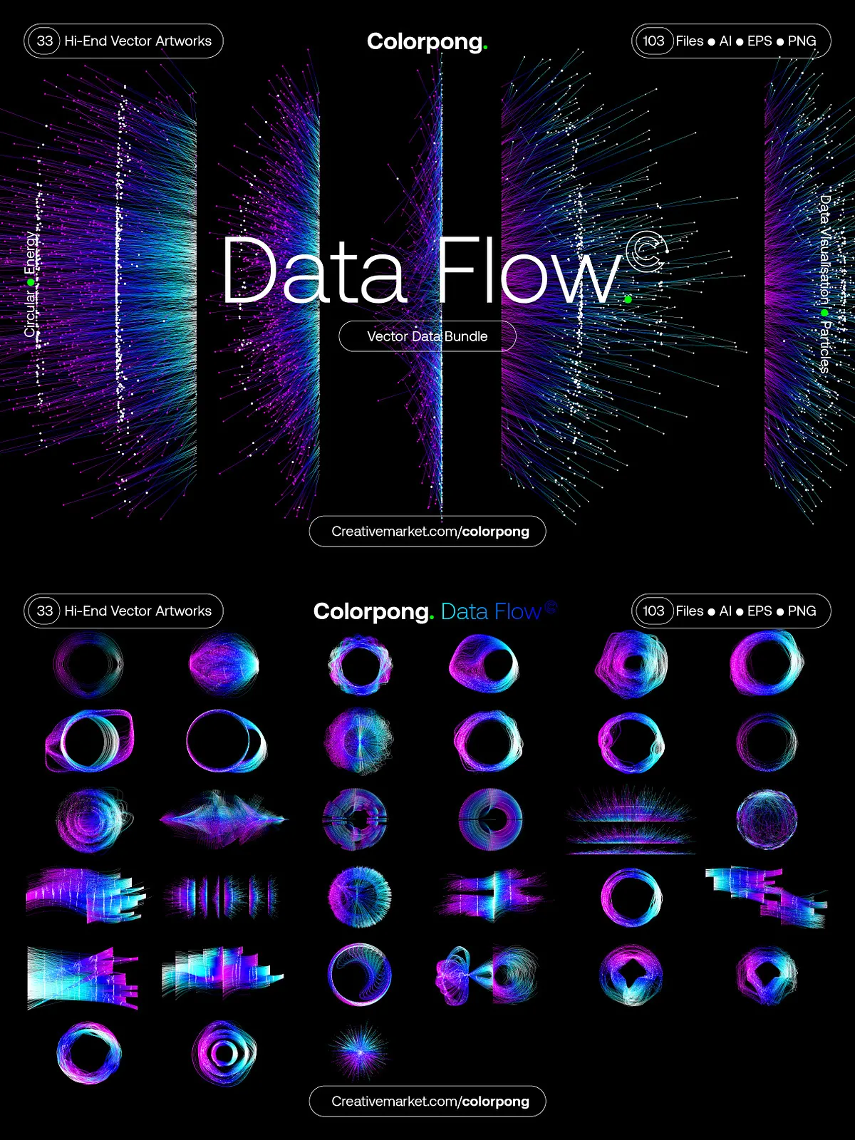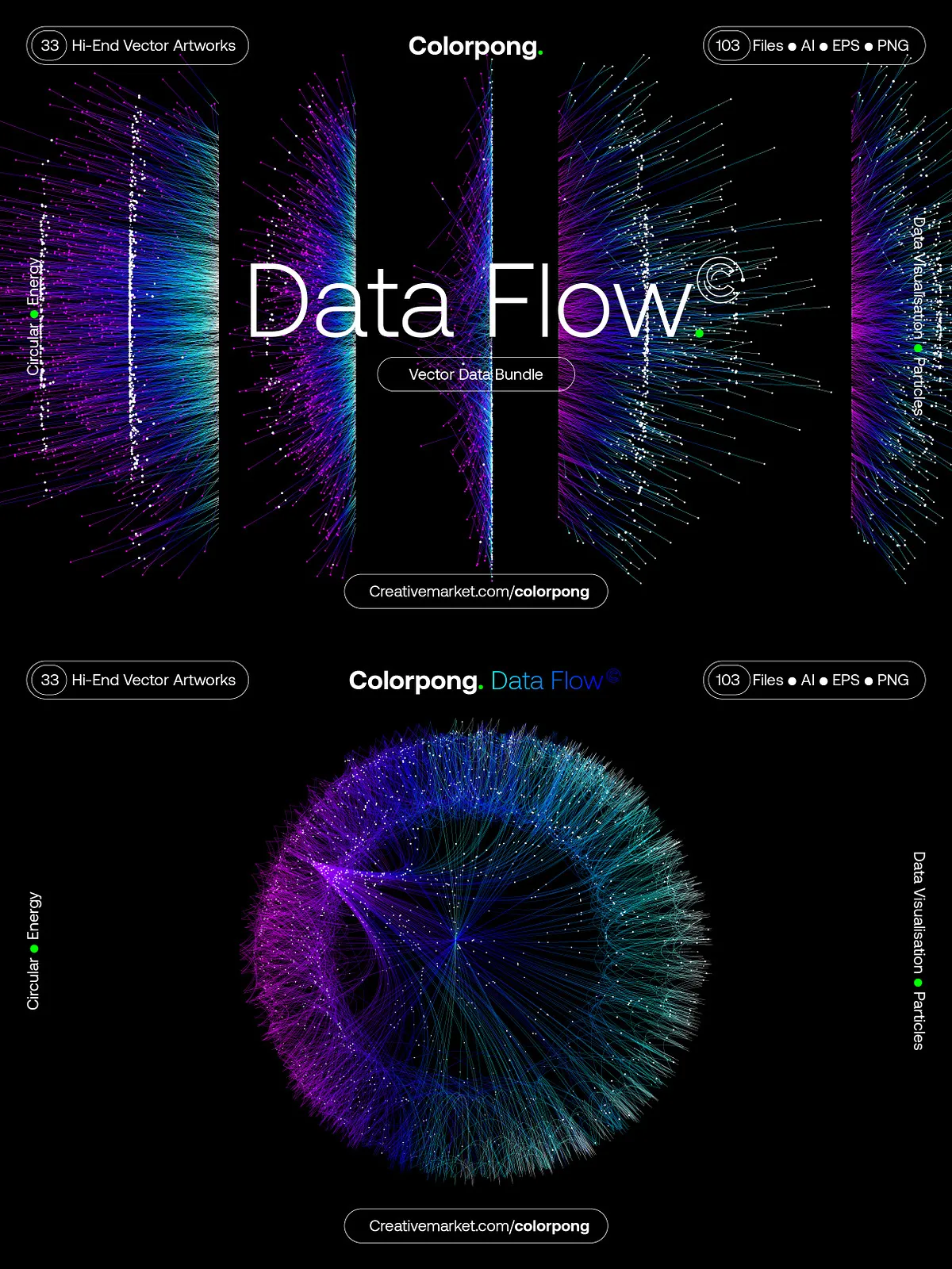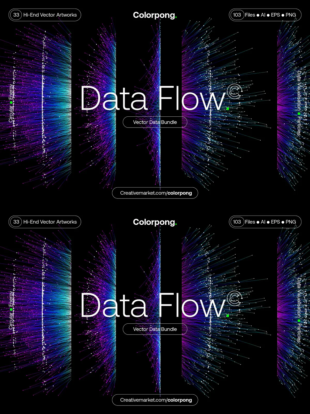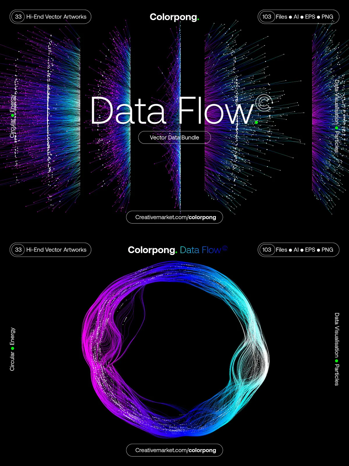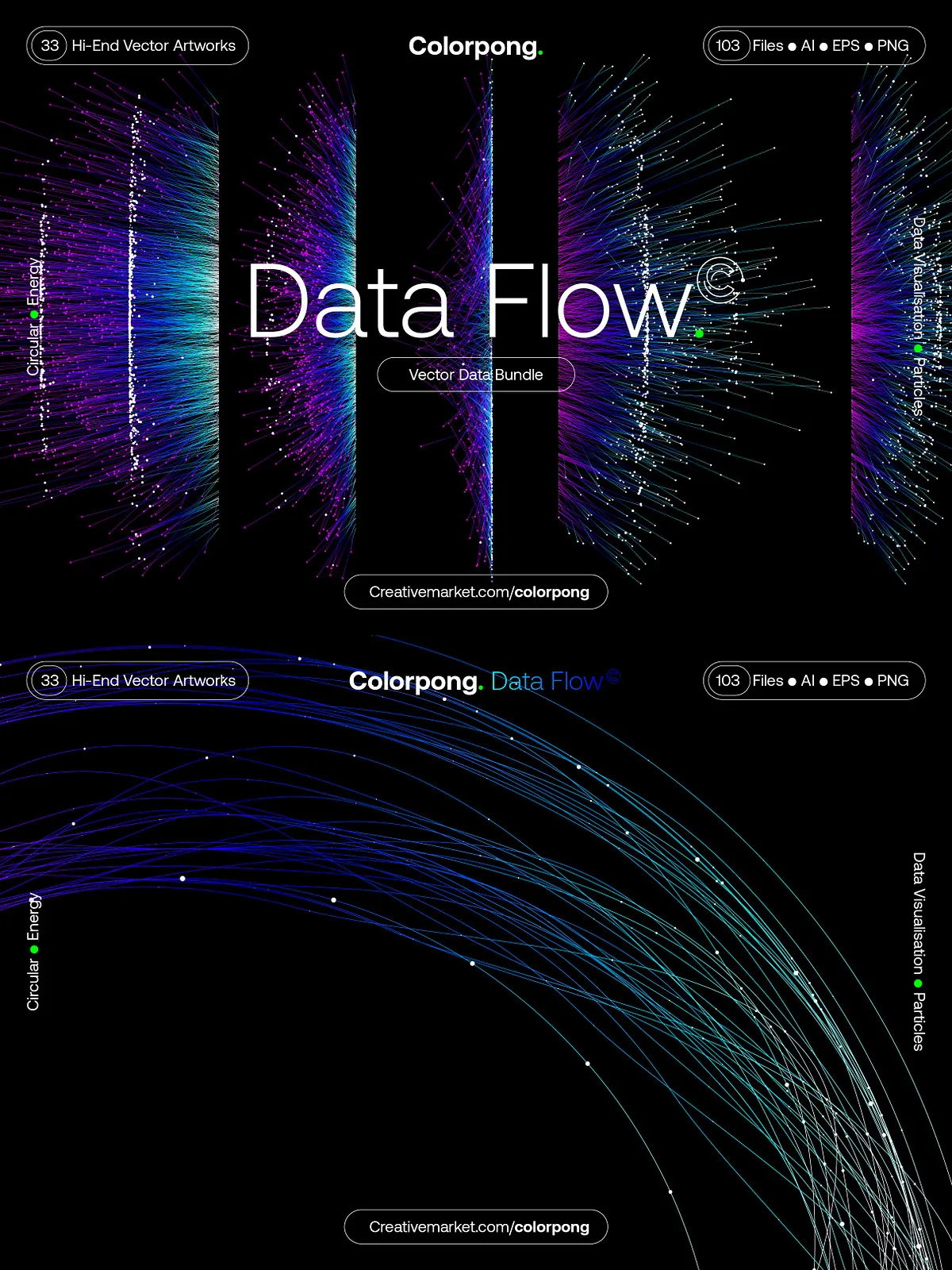 Step into the future of digital design with Colorpong: Data Flow, a bold and innovative vector bundle that transforms abstract data into mesmerizing visual experiences. Containing **33 fully editable, high-energy vector illustrations**, this collection brings life to information through dynamic lines, pulsating gradients, and vibrant graphical systems that scream energy, movement, and modernity.