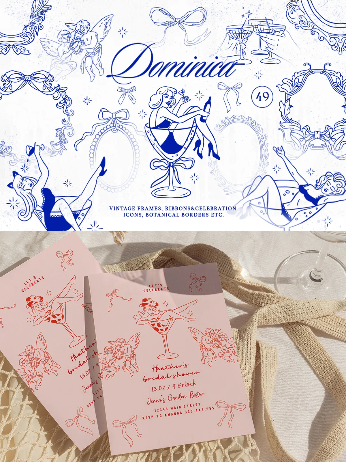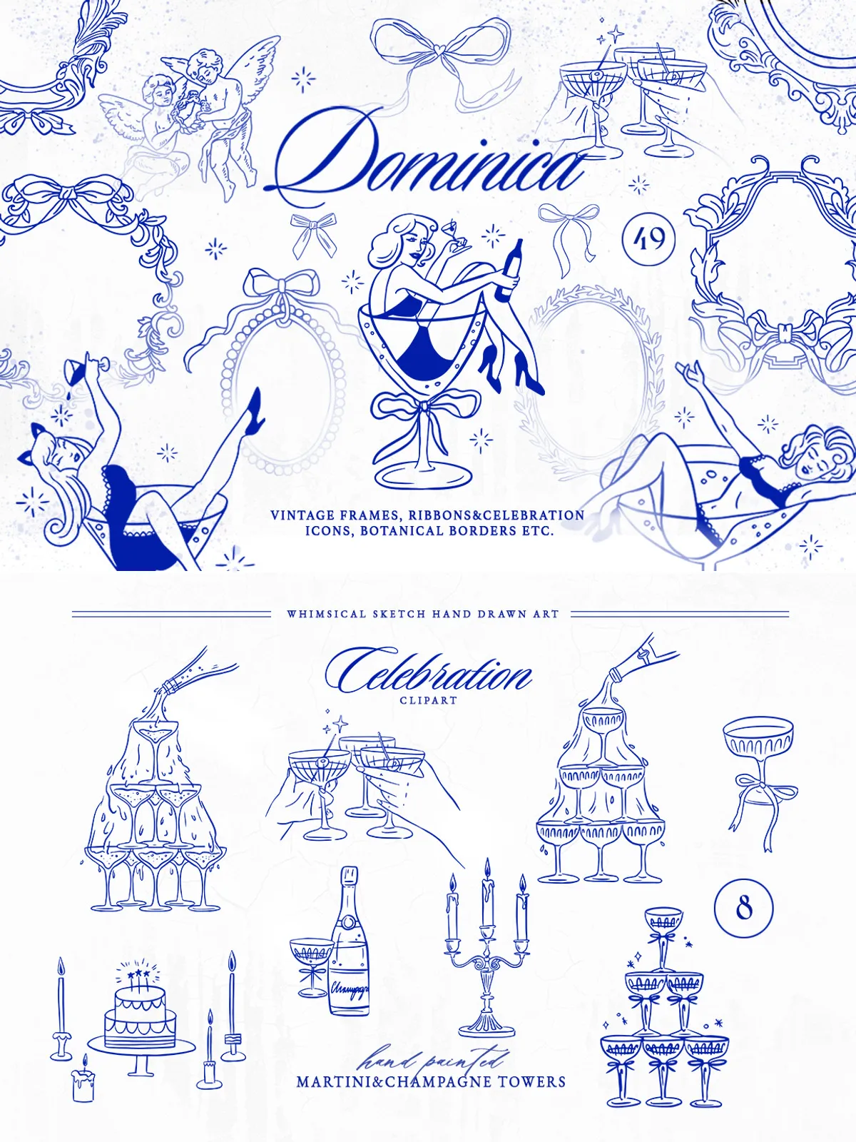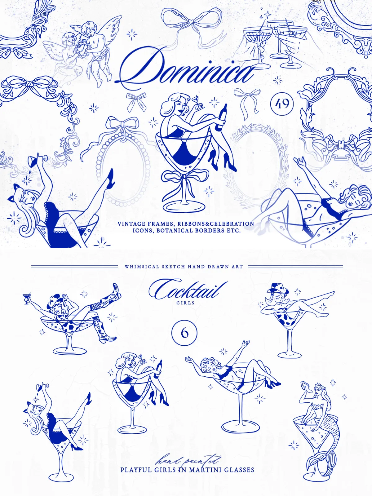 Dynamic illustrations of vintage cocktail girls, stylized with fluid lines and retro attitude. Available in **Blue, Red, and Black**, they bring playful energy to party invitations, club logos, or thematic designs.