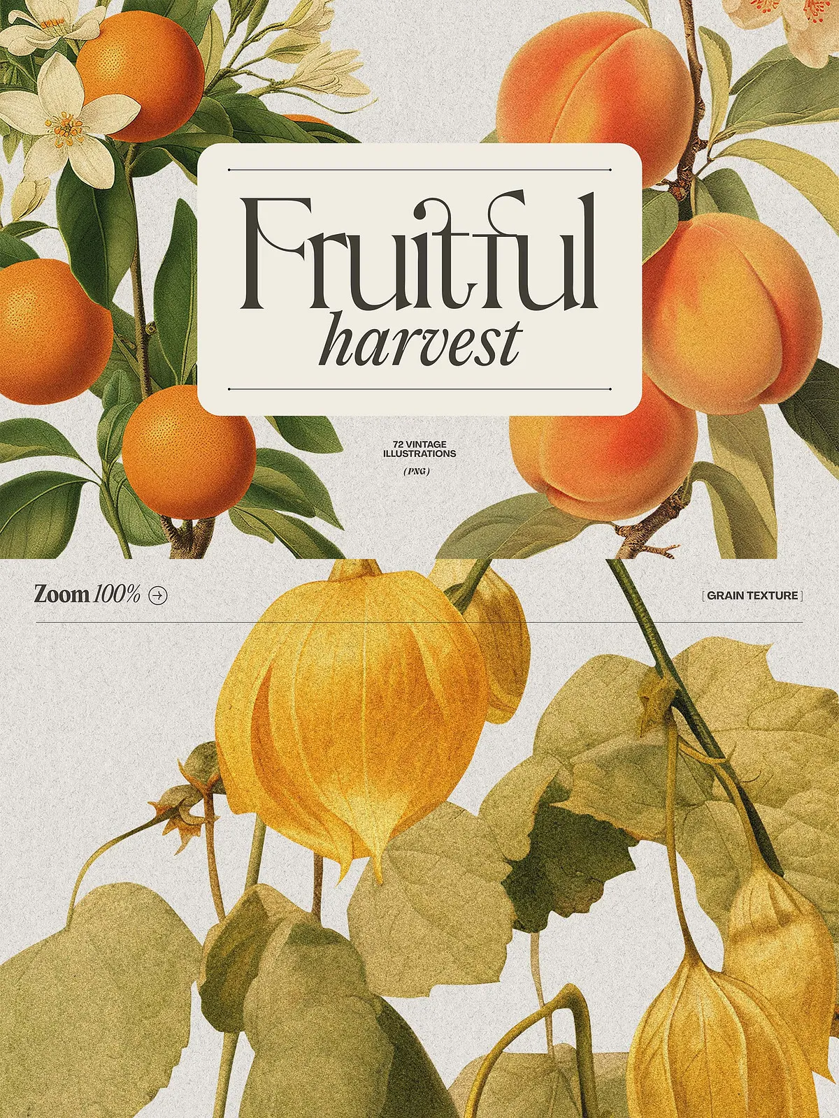 - 72 Unique Botanical Illustrations — A diverse selection of vintage-style fruits and berries, each meticulously detailed with natural textures, delicate lines, and subtle shading that capture the essence of real plant life.