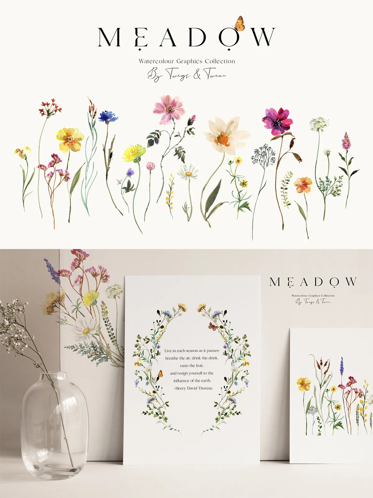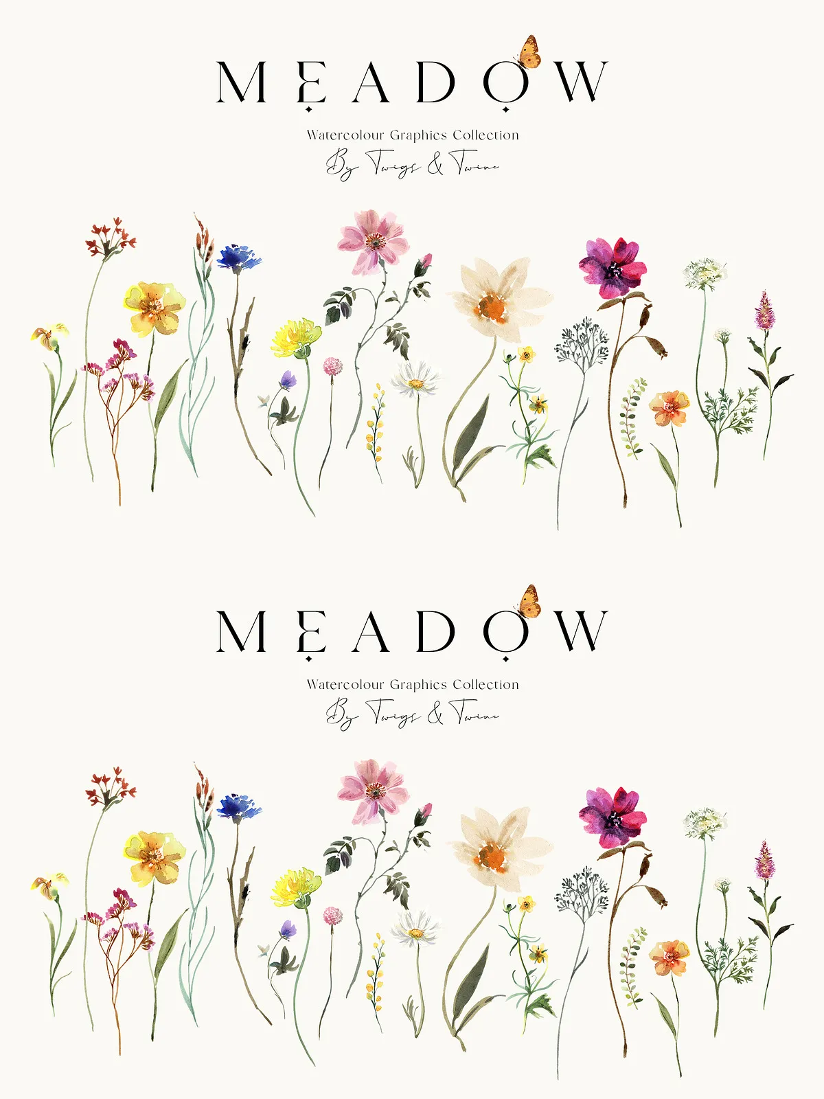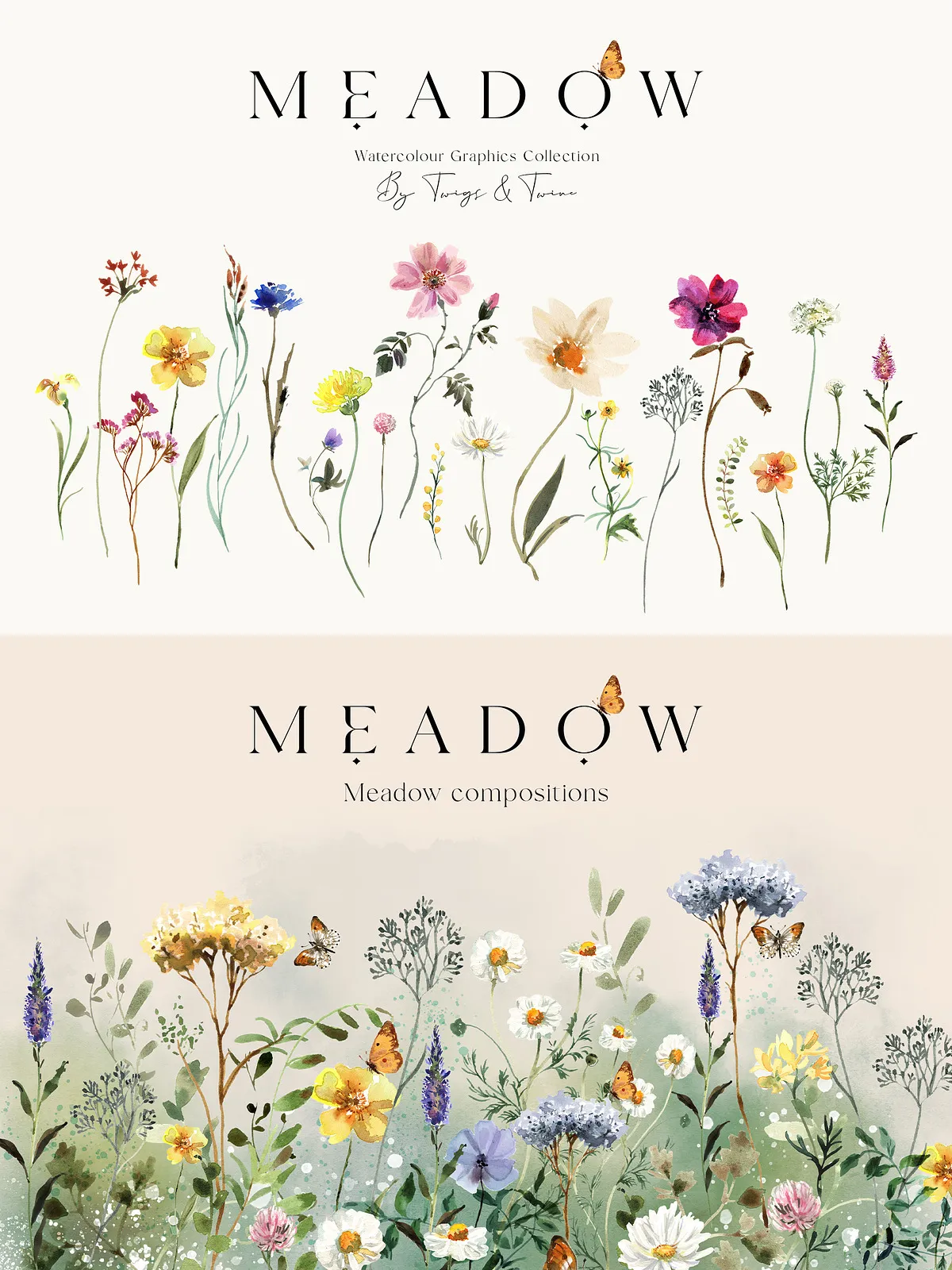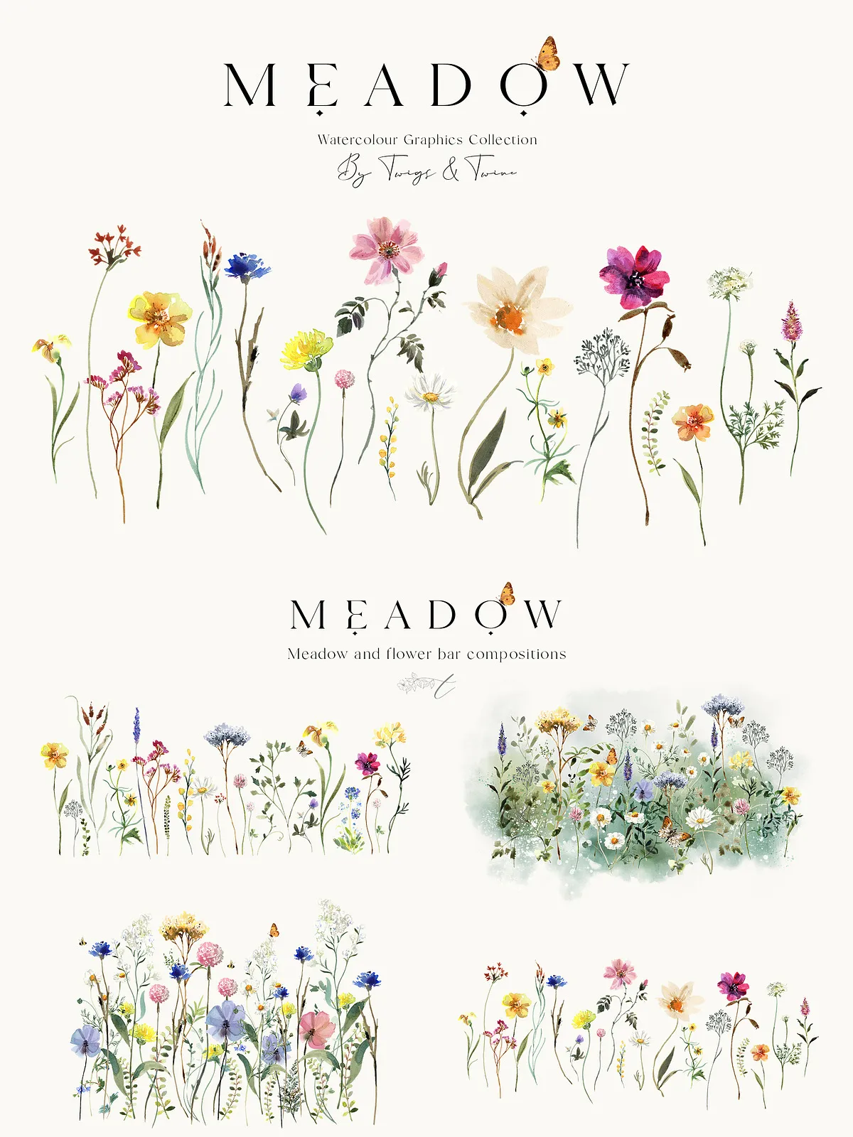 - 5 Meadow Compositions – Full scene illustrations capturing the spirit of a wild meadow — perfect for backgrounds, large-format prints, and immersive design atmospheres.