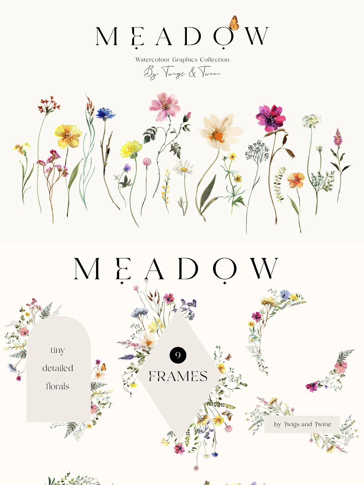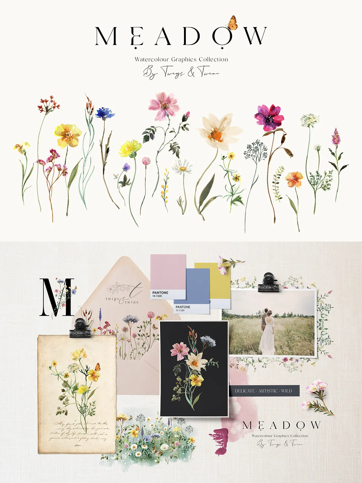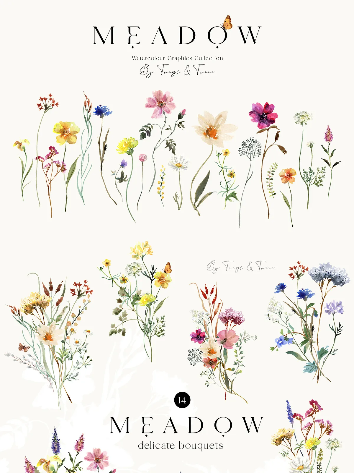 - 5 Meadow Compositions – Full scene illustrations capturing the spirit of a wild meadow — perfect for backgrounds, large-format prints, and immersive design atmospheres.