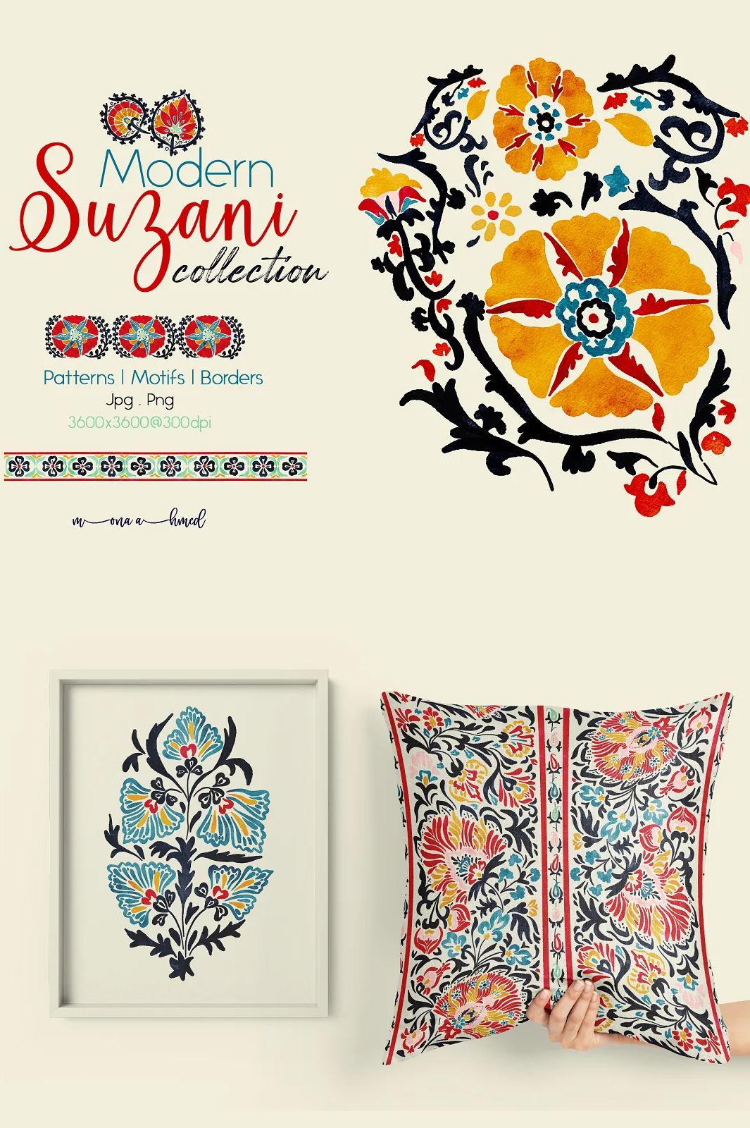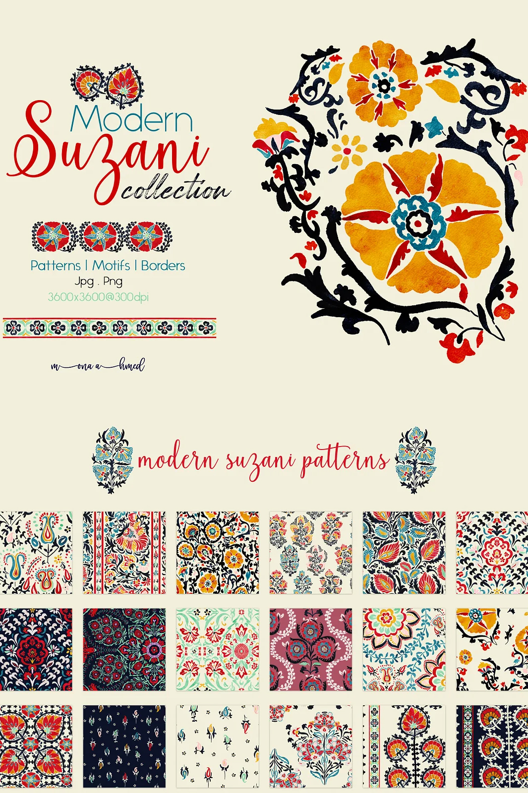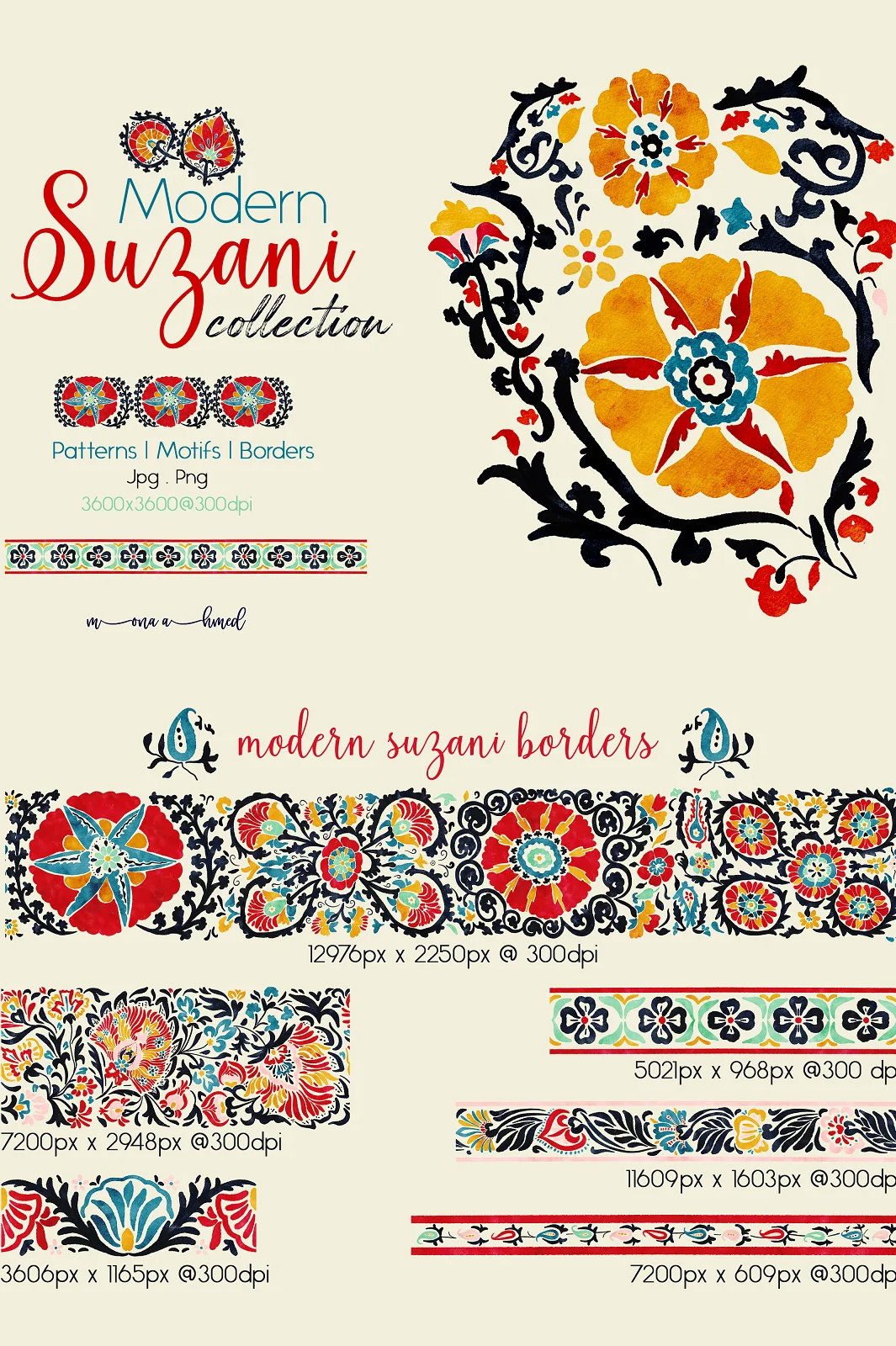 Modern Suzani collection is a set of unique Suzani art, patterns, and borders in a hand painted watercolor style to add elegant and classic touch to your creative project with a bit of modern twist.