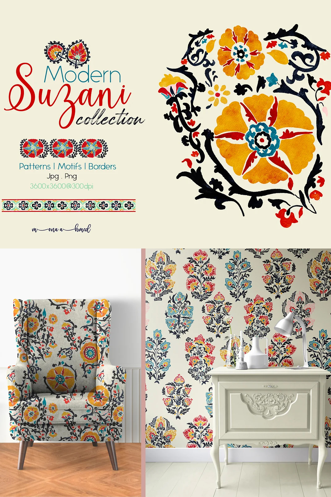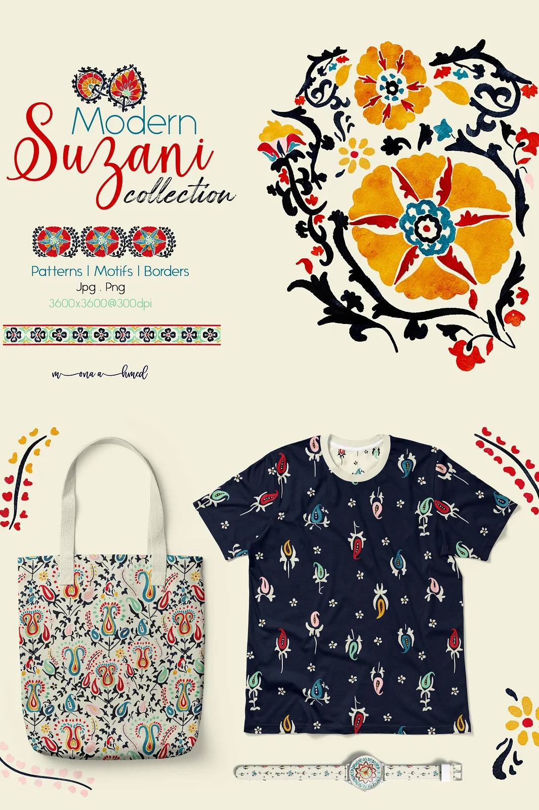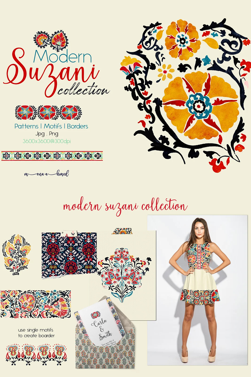 Modern Suzani collection is a set of unique Suzani art, patterns, and borders in a hand painted watercolor style to add elegant and classic touch to your creative project with a bit of modern twist.