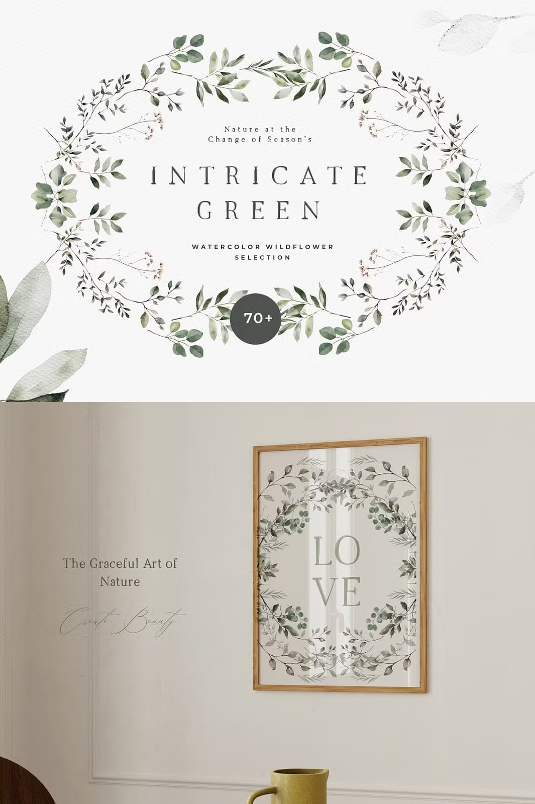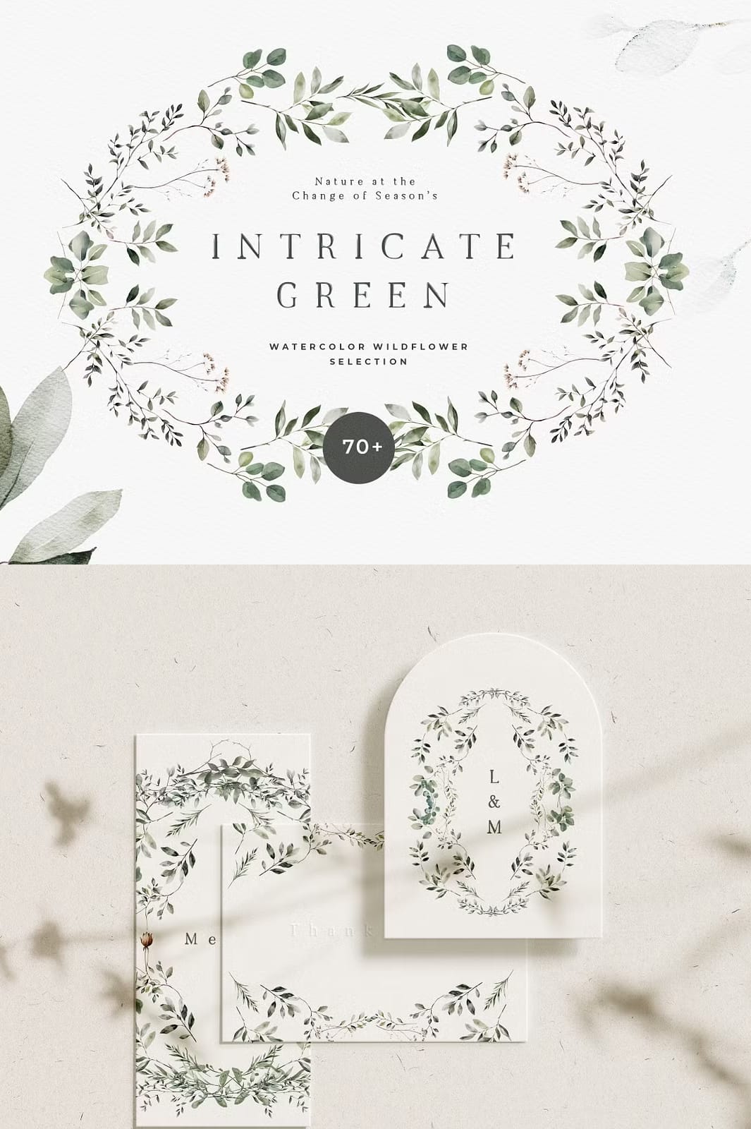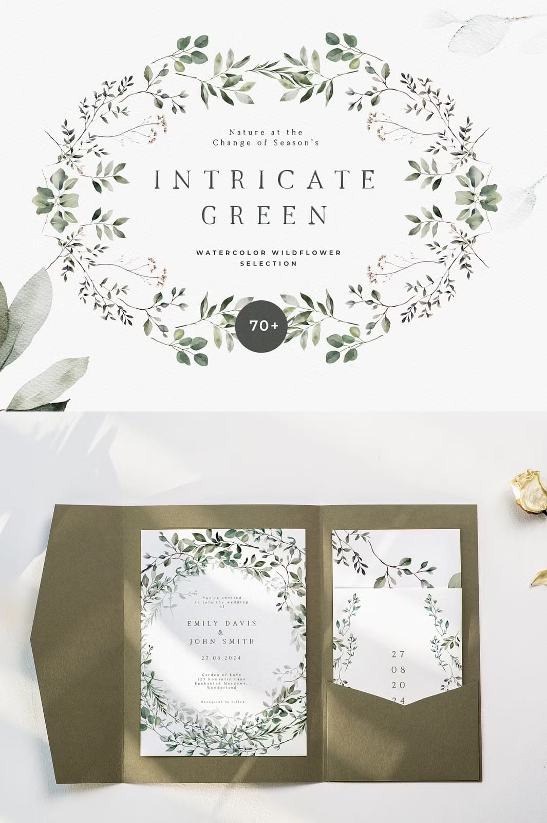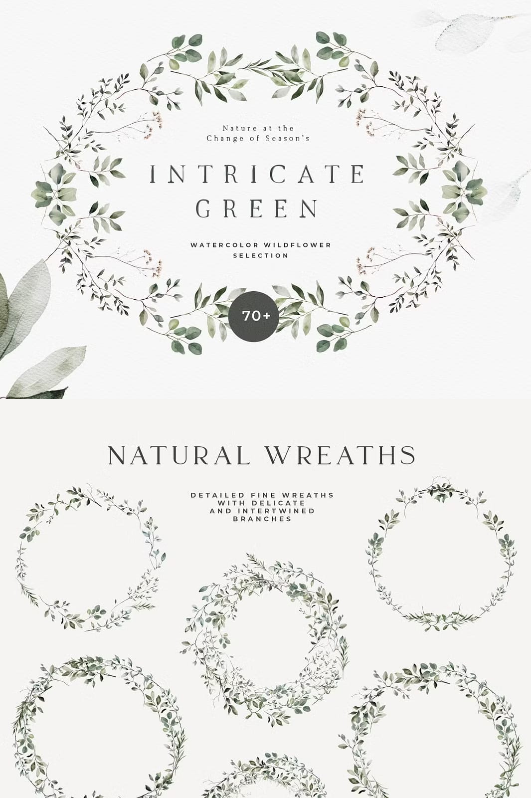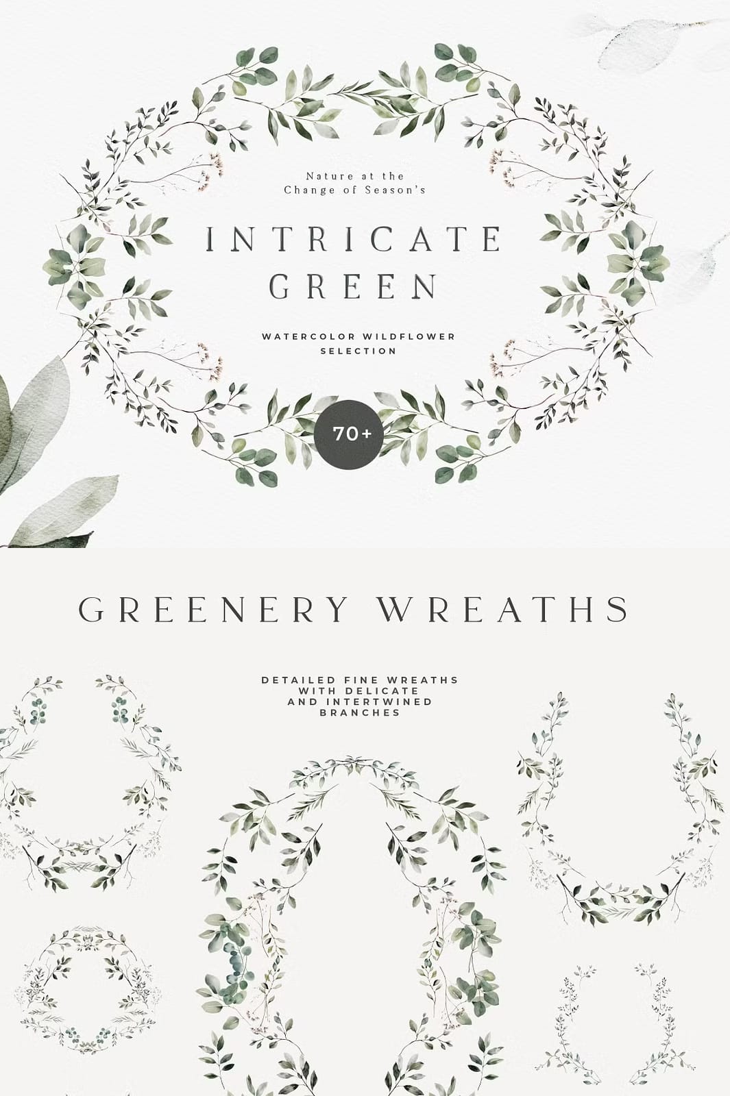 A beautiful trend to elevate your designs in 2024: Intricate greenery, twigs and leaves that artfully intertwine for versatile and delicate designs. These natural and minimalist watercolor wreaths, twigs and patterns add a fresh and simplistic touch of elegance to your wedding invitation, green wedding designs, planner dashboard, prints and posters, textile designs or branding.