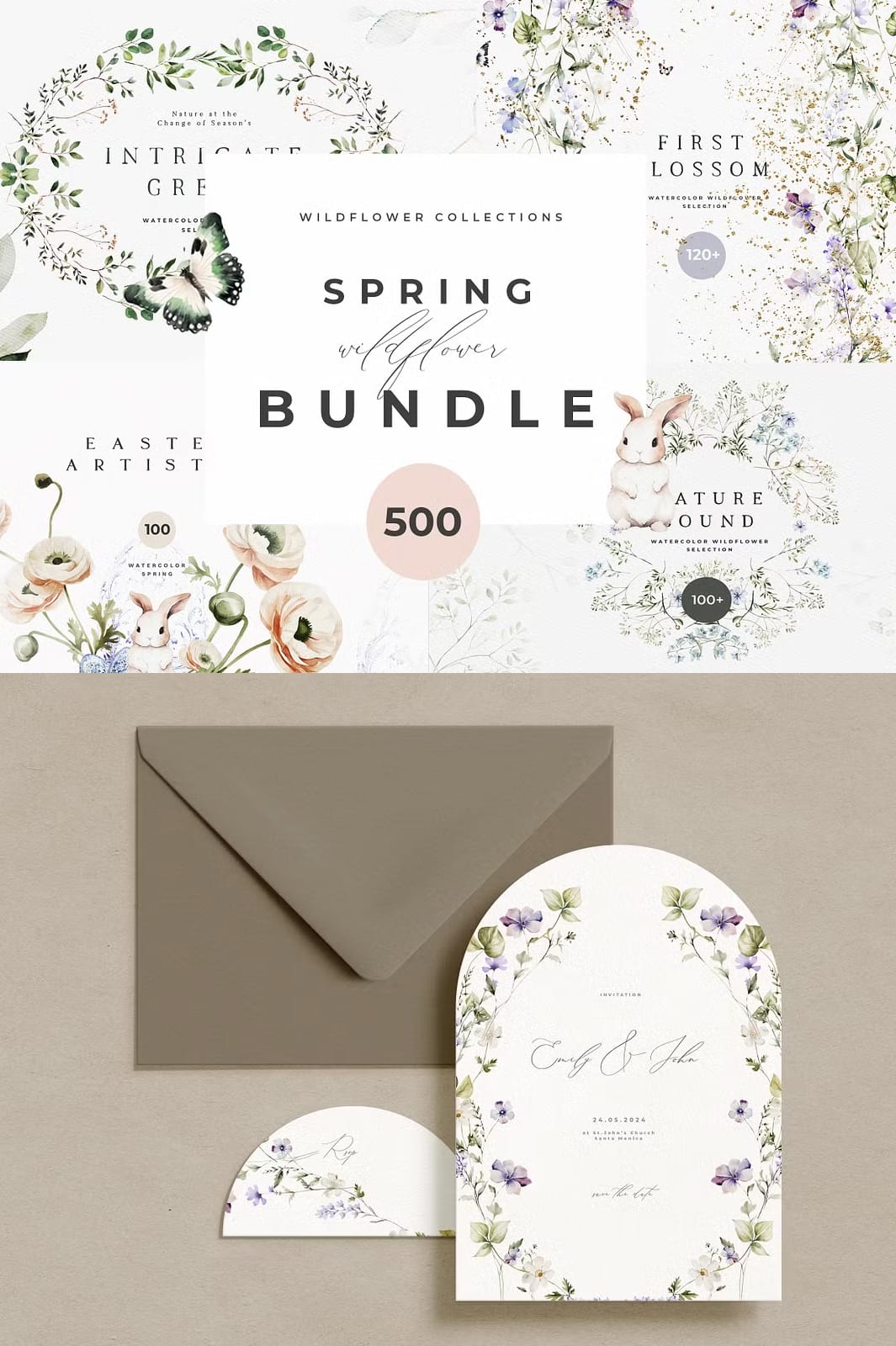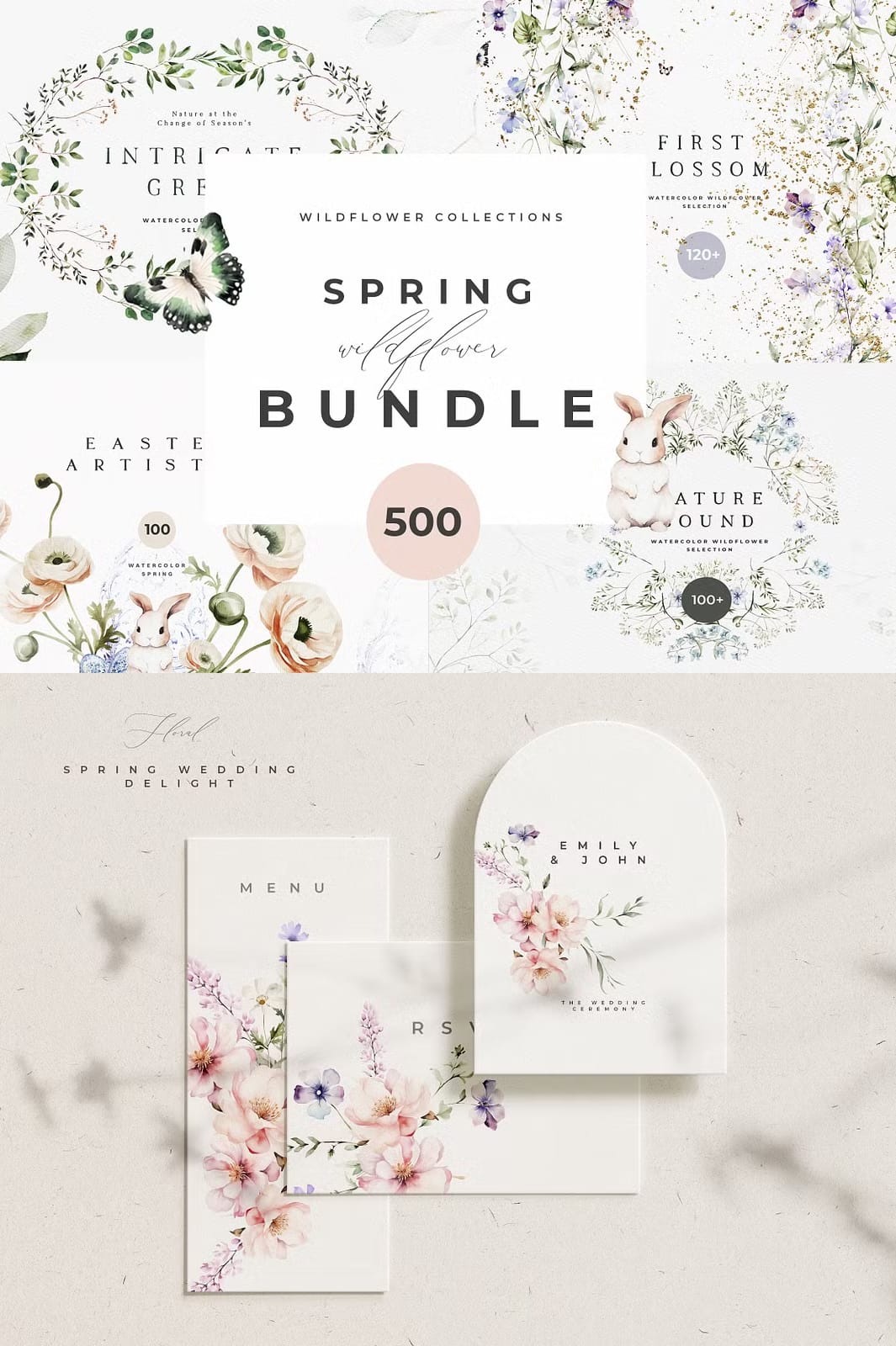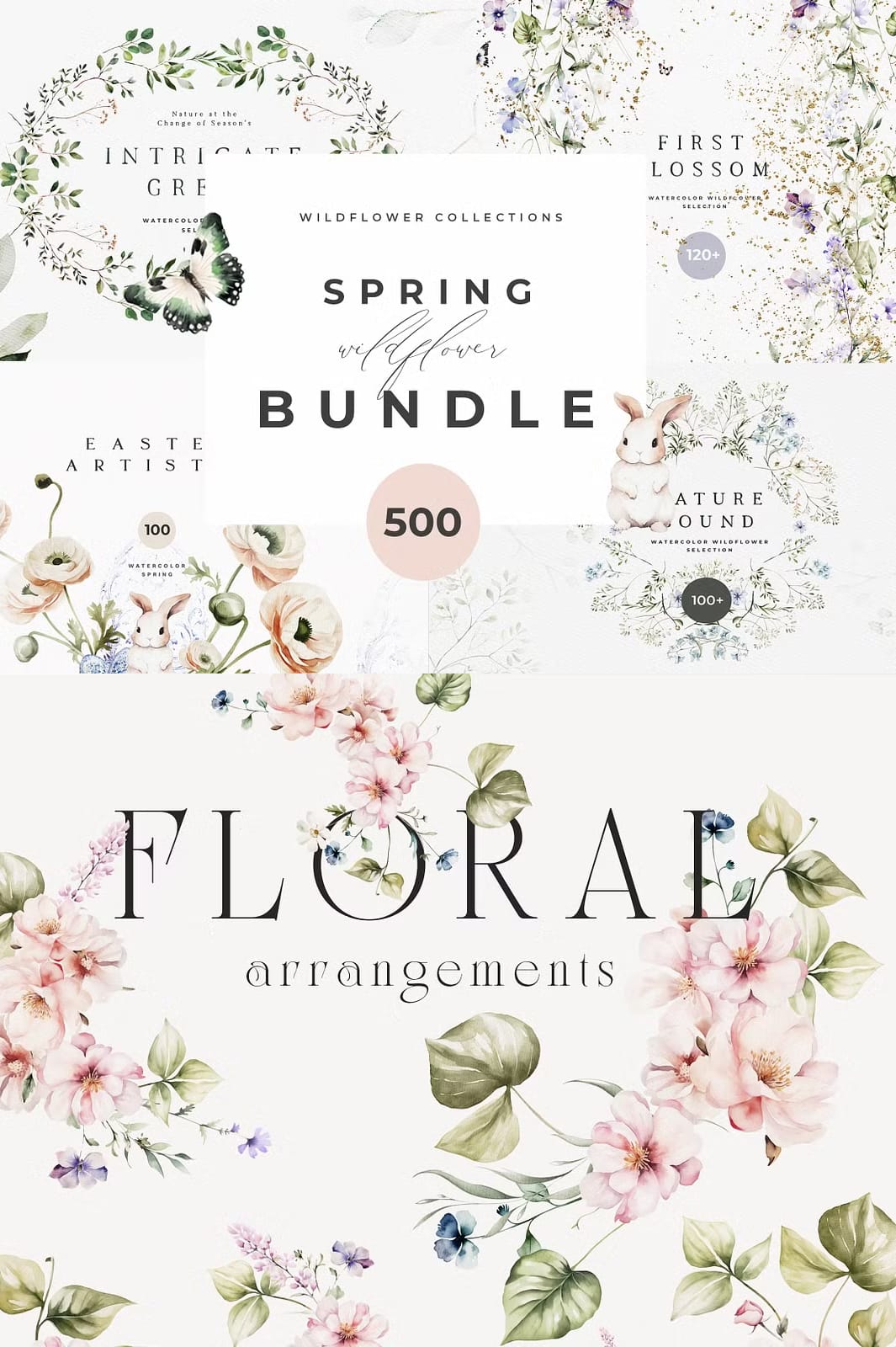 Welcome a value-packed Spring library, including everything you need for joyful Spring creations. Discover a comprehensive range of creative goodness: Watercolor wreaths and Spring greenery, various arrangements, Easter watercolor and Easter bunnies, wild flower watercolor, natural greenery, premade compositions and so much more!