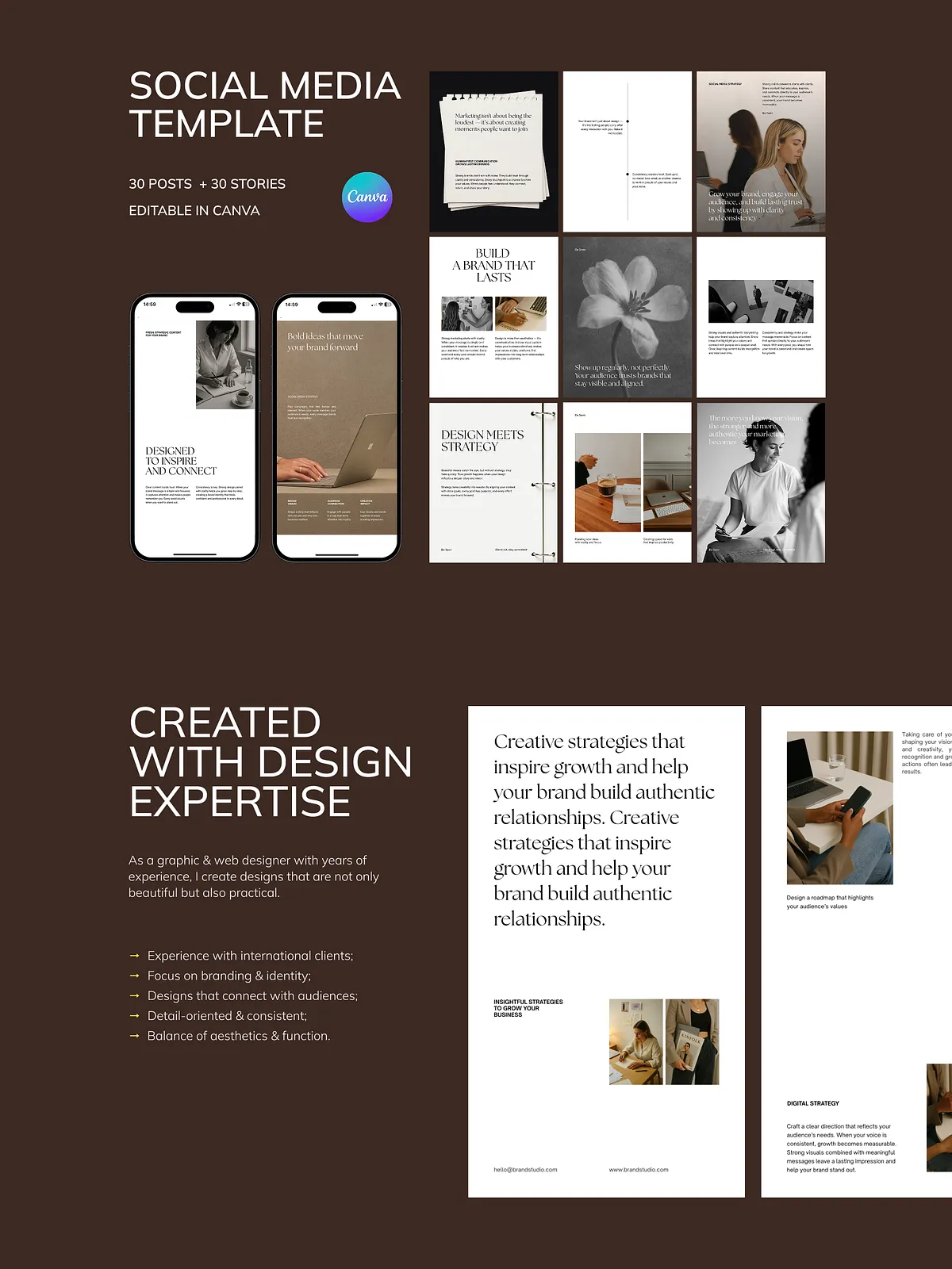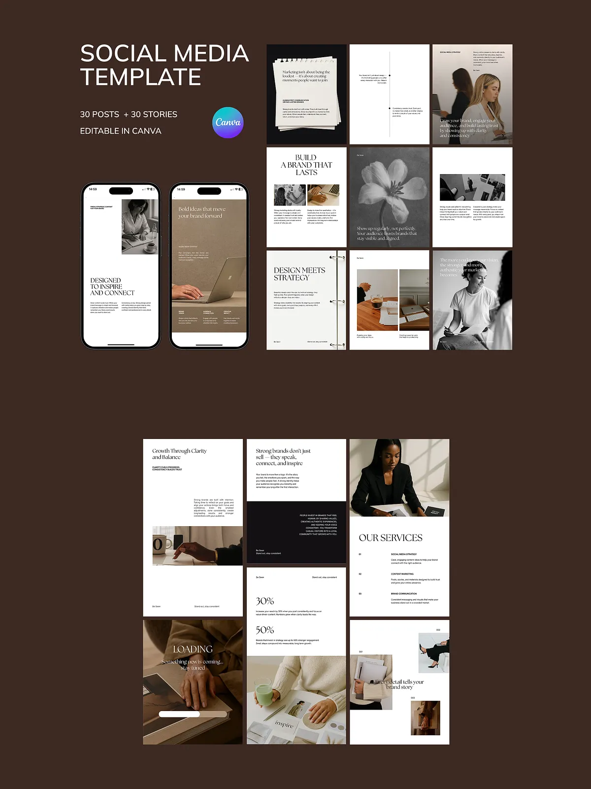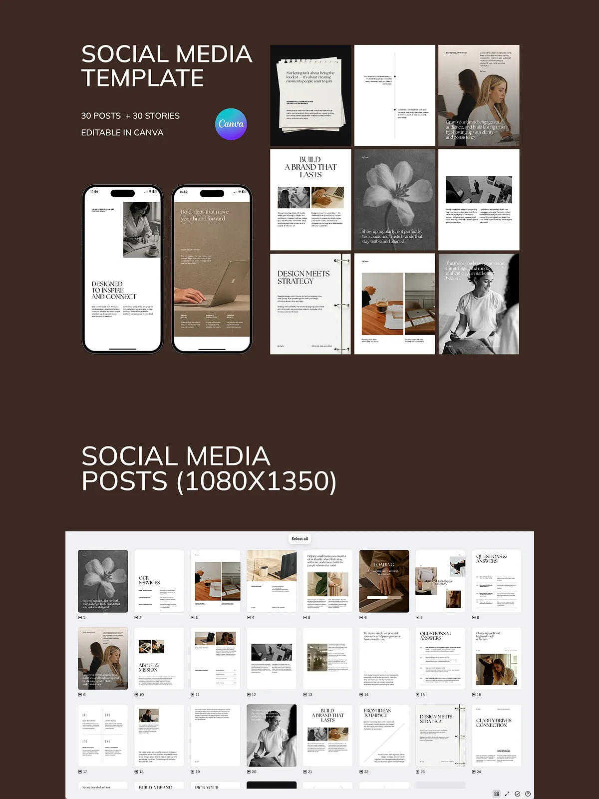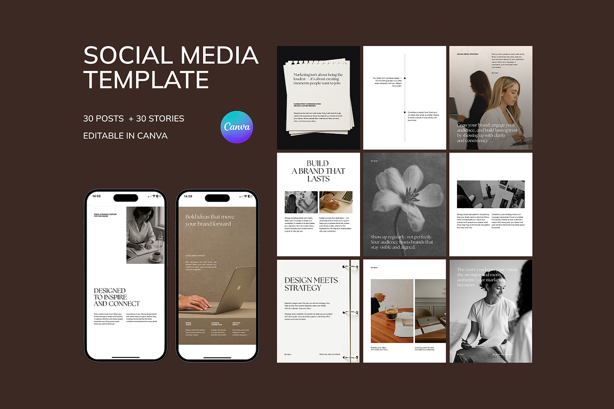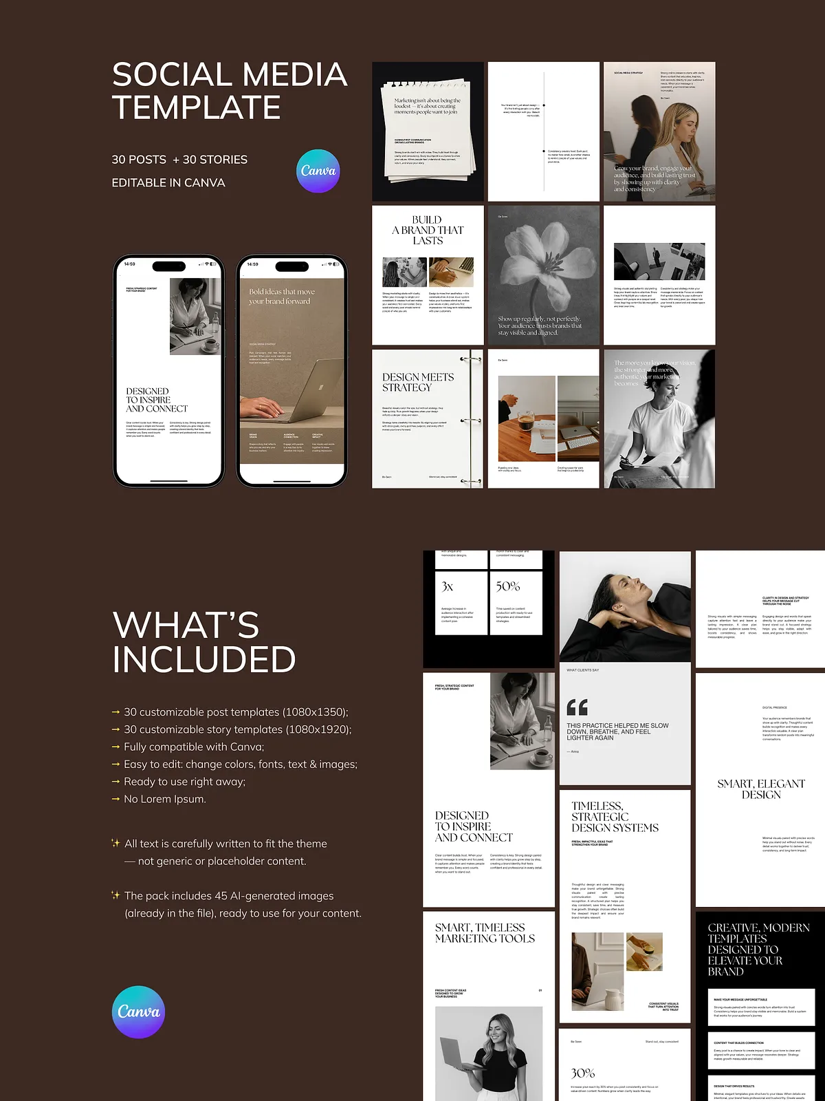 - 30 Professional Instagram Post Templates (1080 x 1350 px): Perfect for brand storytelling, lead magnets, service promotions, and educational content that positions you as an expert.
