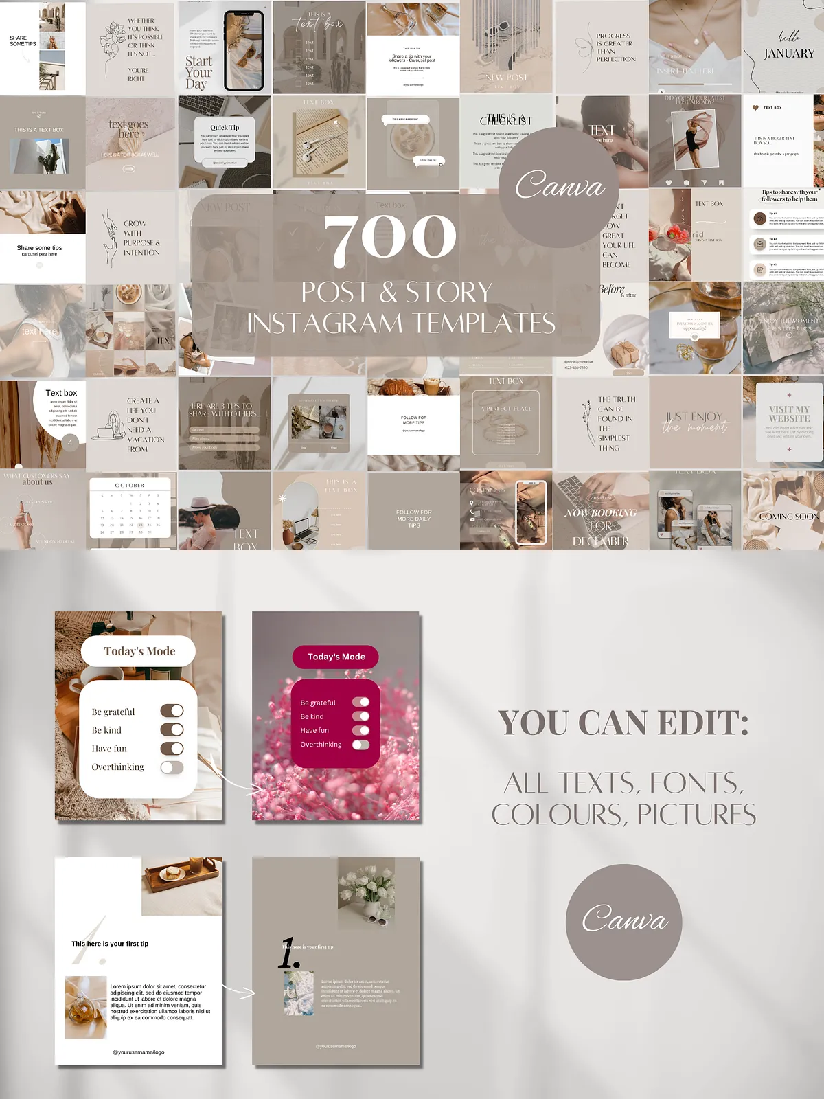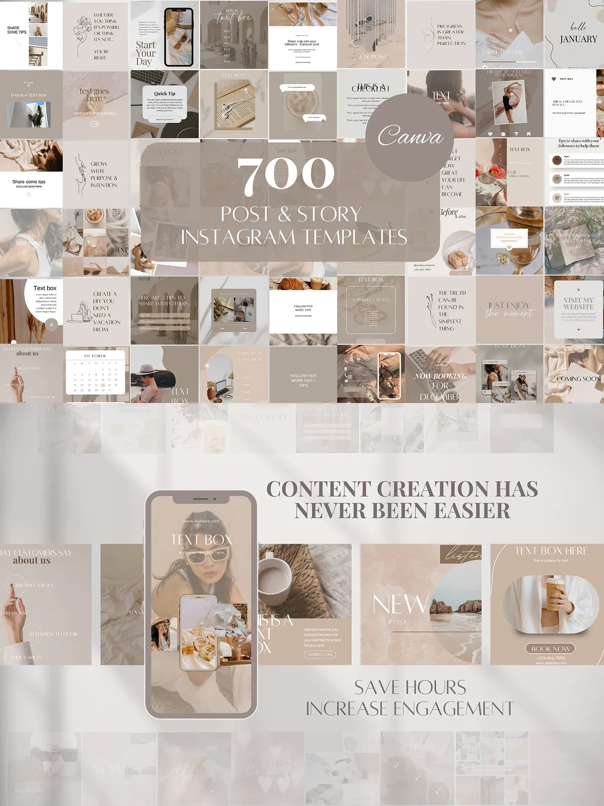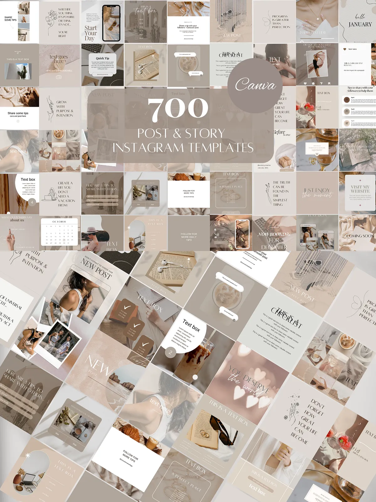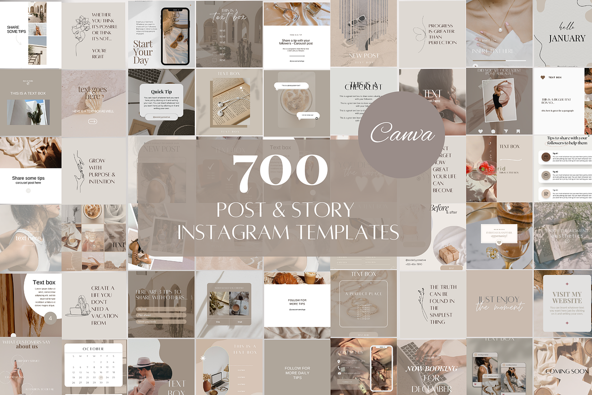 - 100 Beige Instagram Carousel Templates (50 Posts + 50 Stories) — Drive deeper engagement with multi-slide carousels that tell a story or showcase multiple products, tips, or phases. Ideal for tutorials, lookbooks, and in-depth brand messaging.