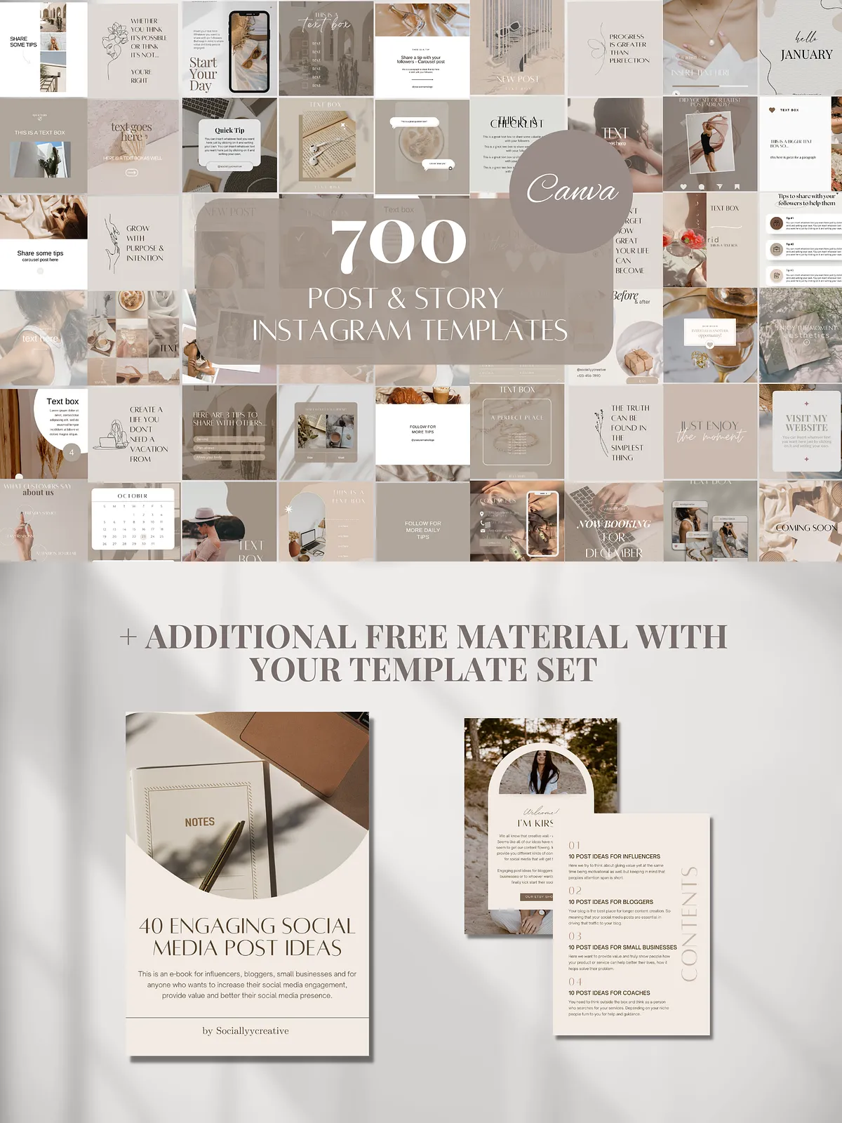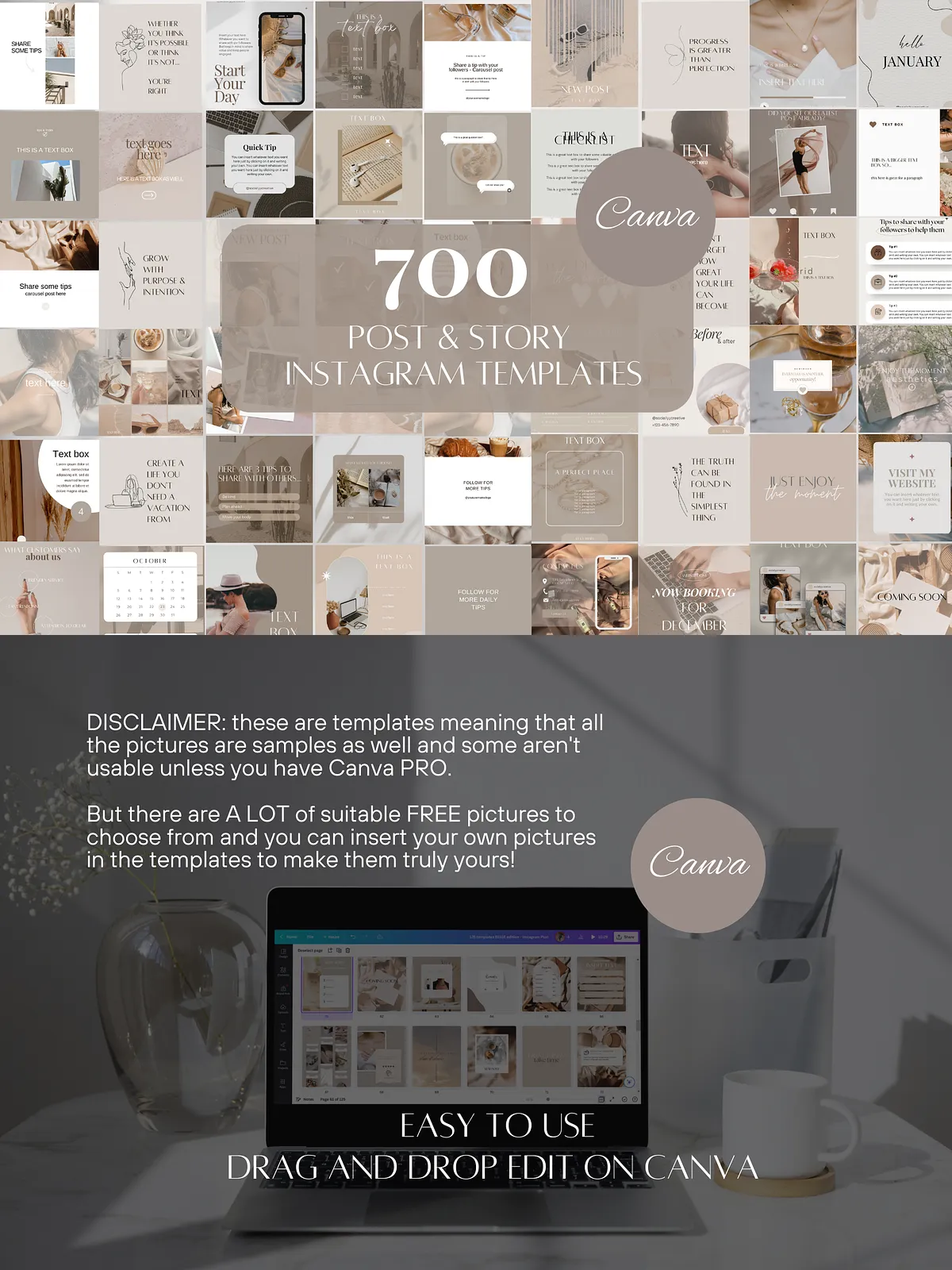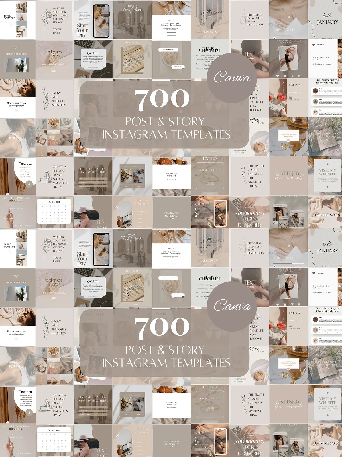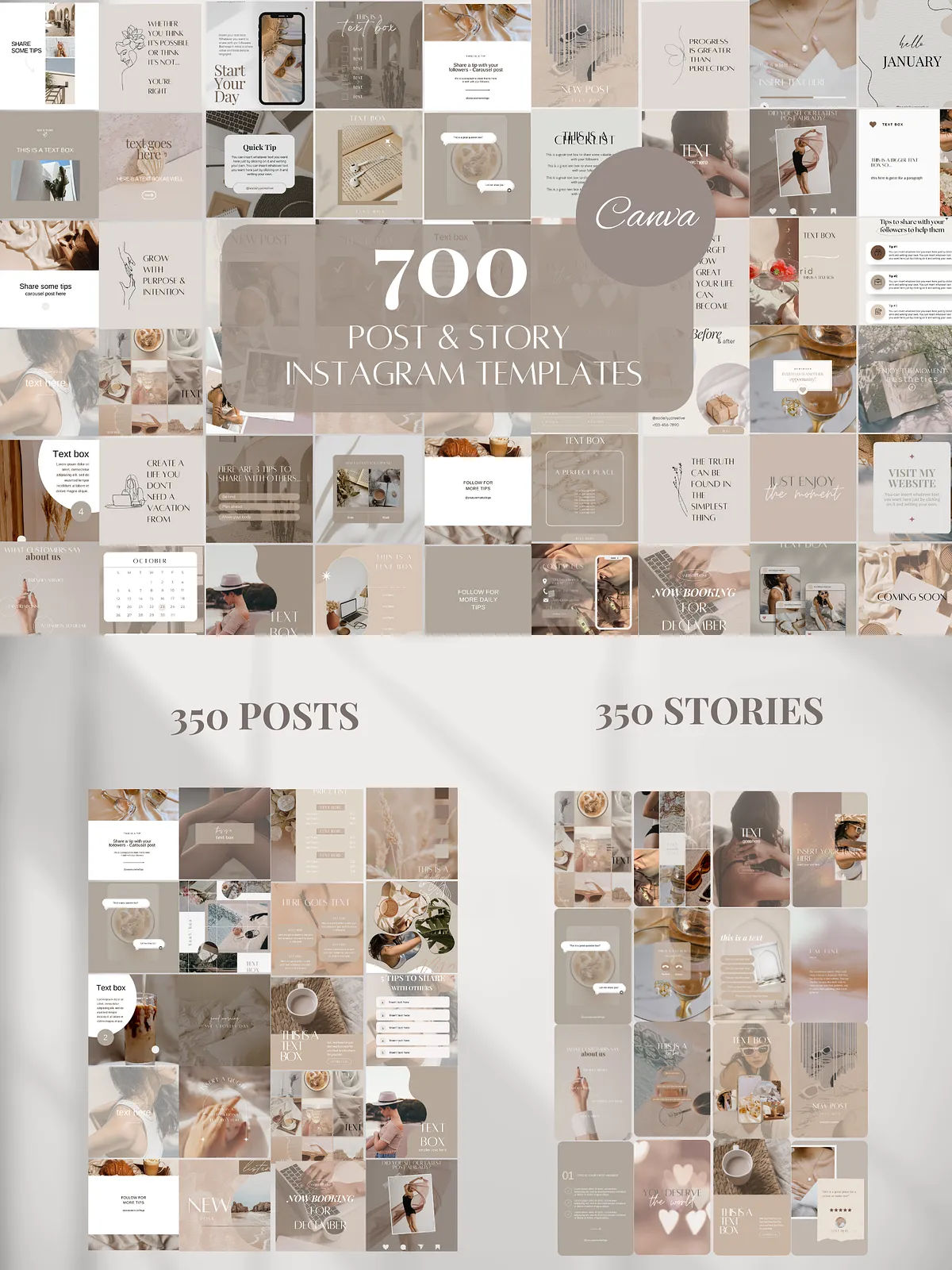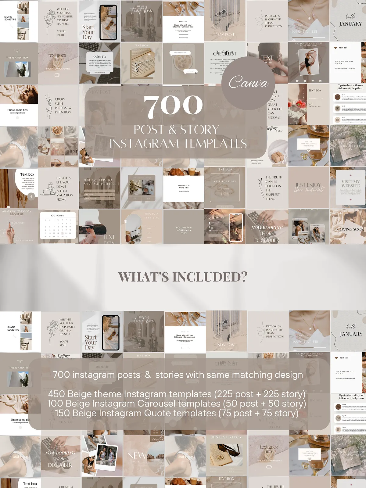 - 450 Beige-Themed Instagram Templates (225 Posts + 225 Stories) — The core of the collection. Create striking static posts and engaging vertical Stories with a clean, elevated beige focus. Perfect for daily content, product highlights, and story engagement.