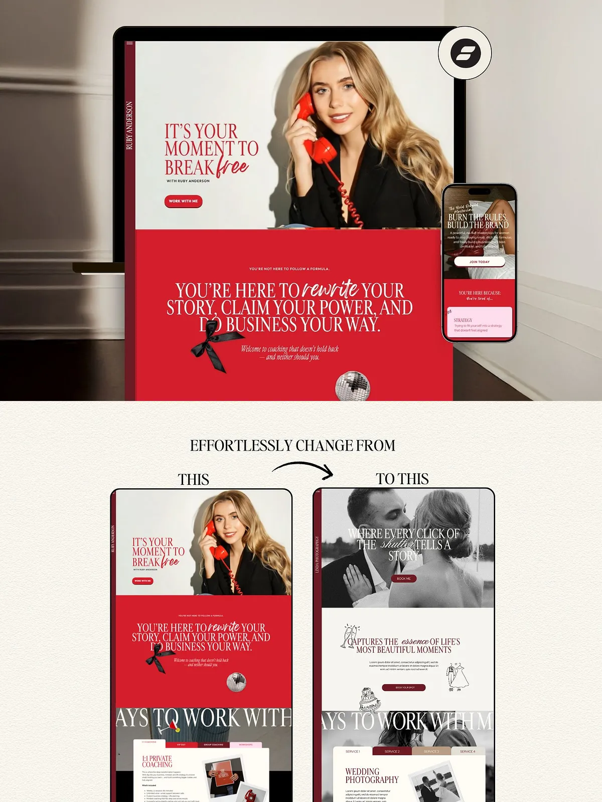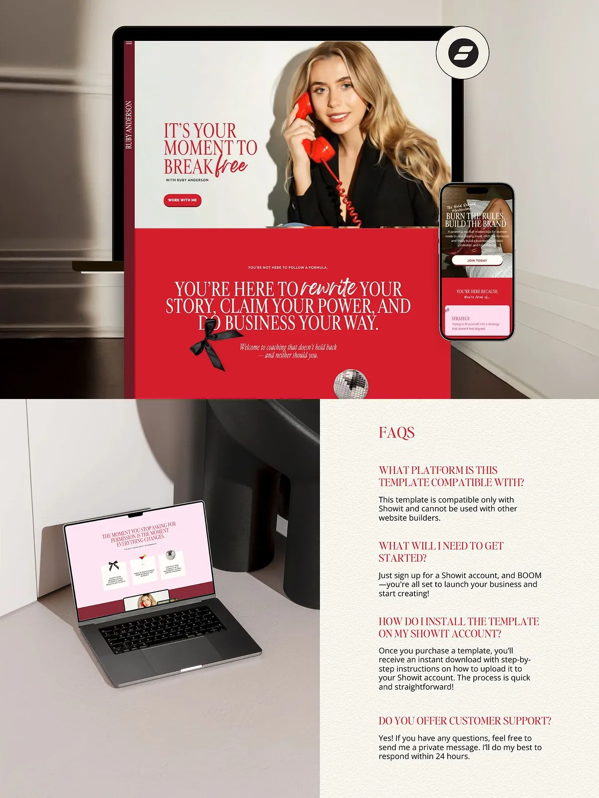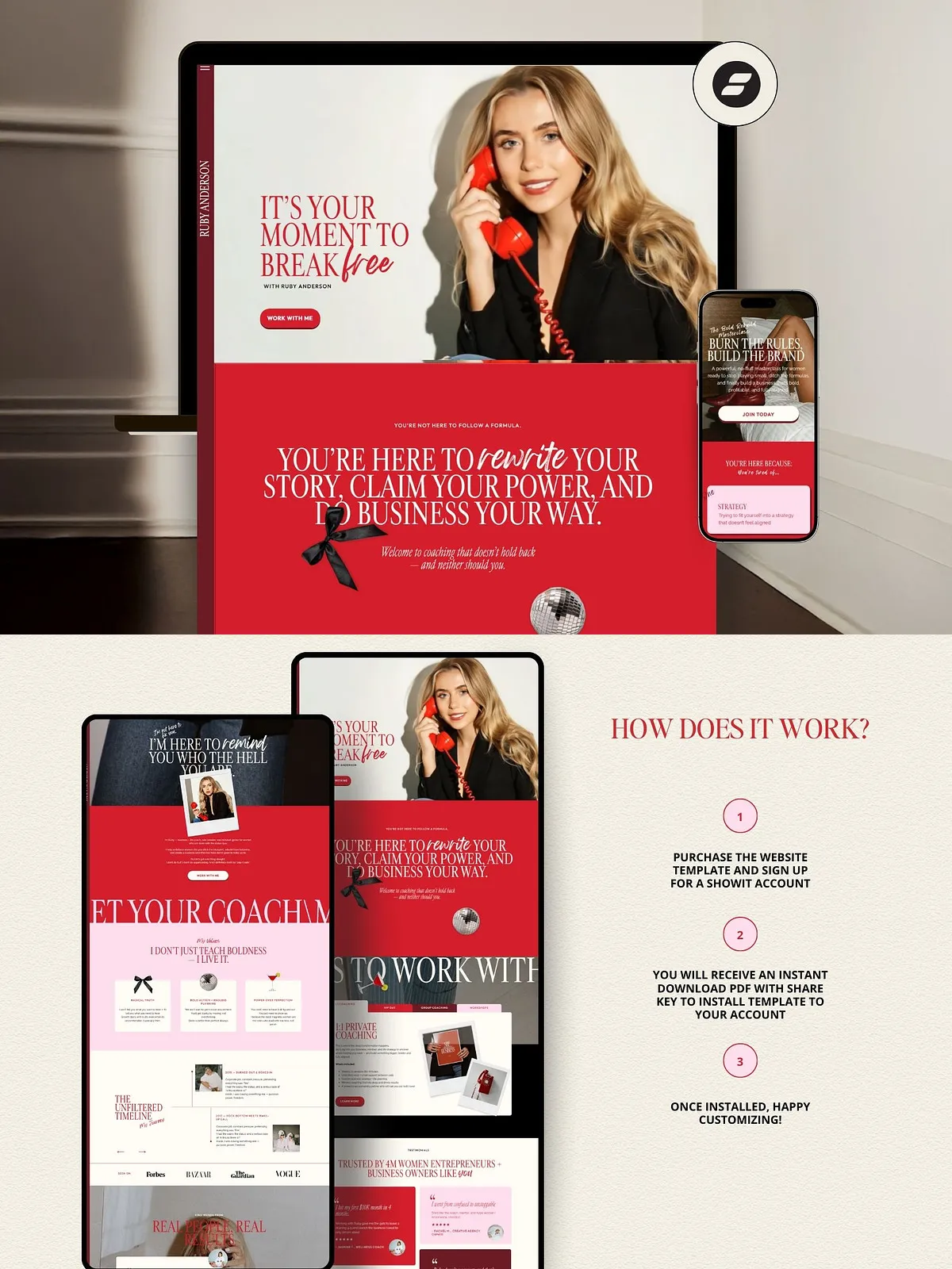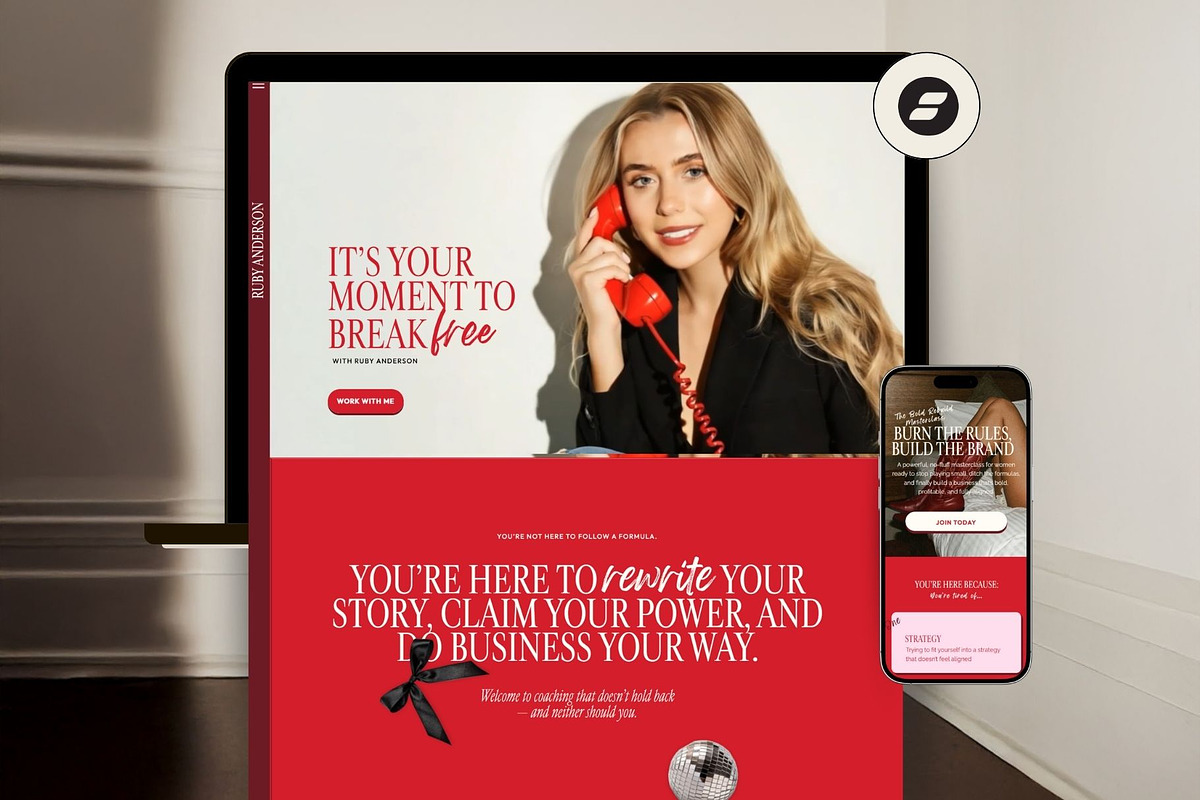Your brand deserves a website that matches your vision. The Ruby Showit Template is more than a design—it’s your digital power suit. Stop spending hours tweaking layouts. Stop overpaying for designers. Start building a bold, beautiful, high-converting website that makes your audience stop, look, and act.