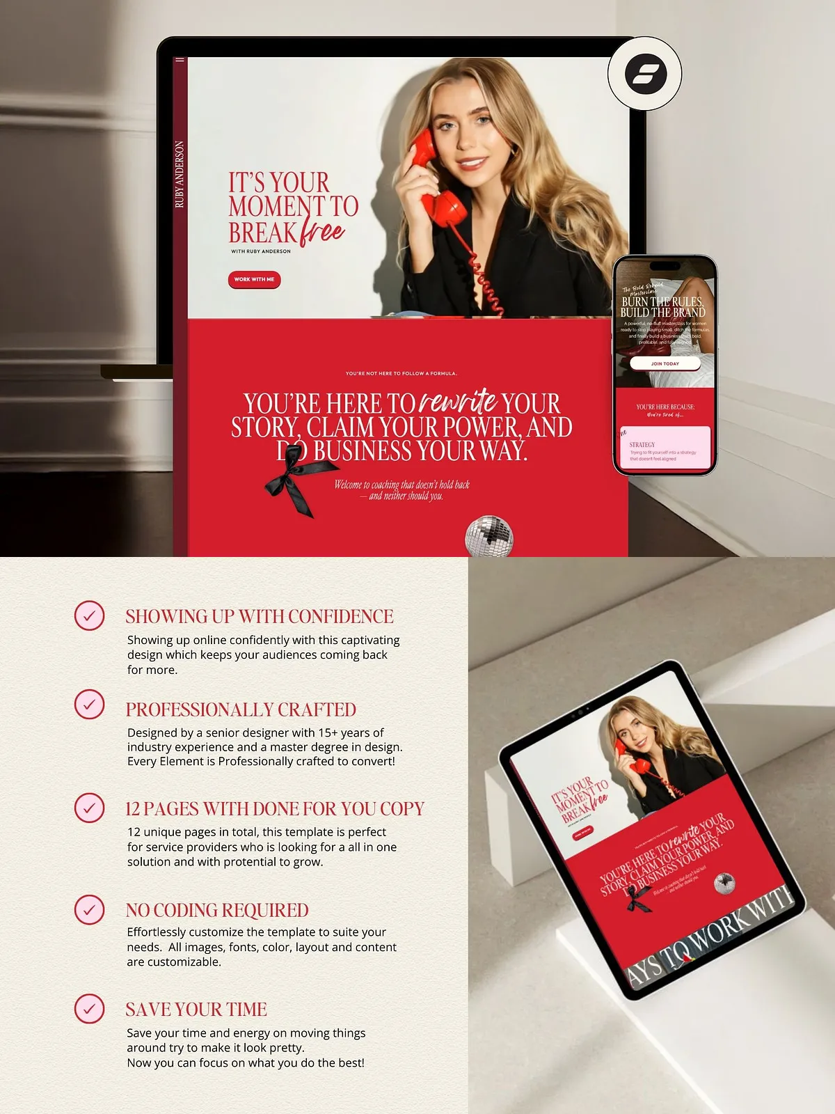 • Confidence-Boosting Design: The bold red accent palette commands attention while maintaining professionalism, setting you apart in a crowded online space.