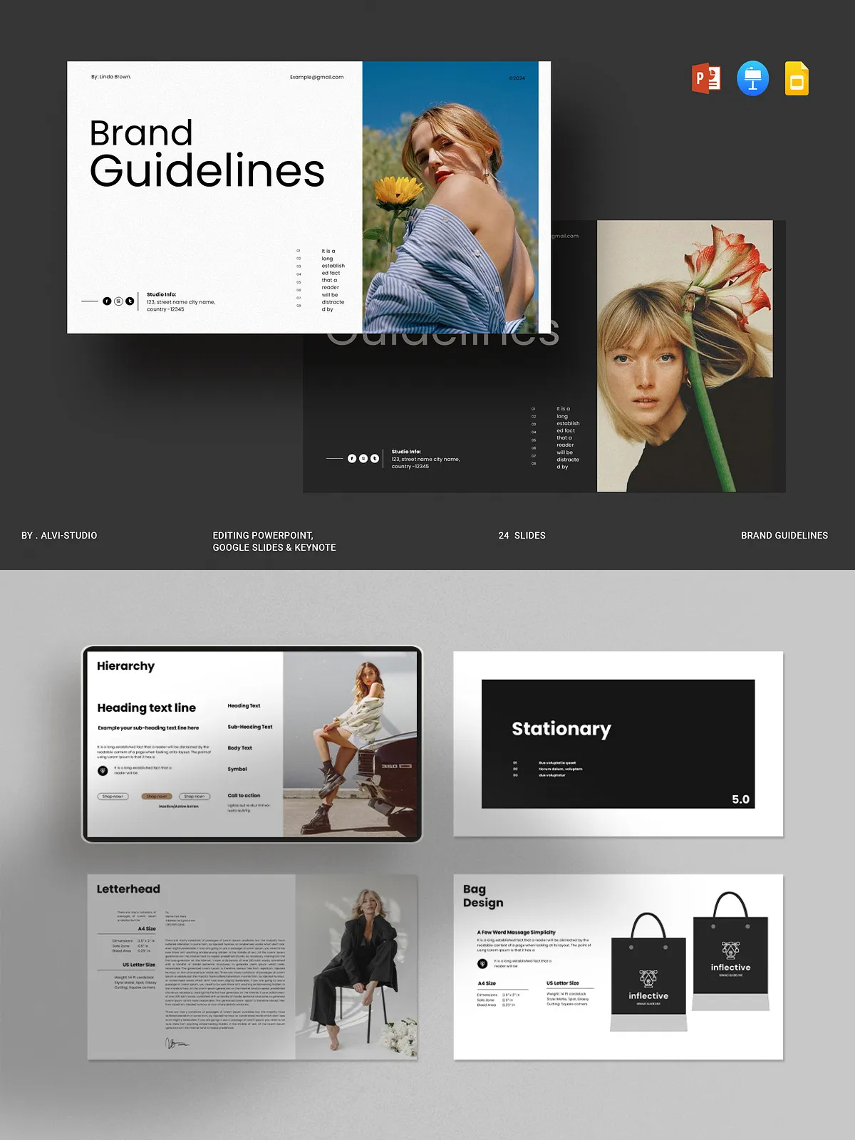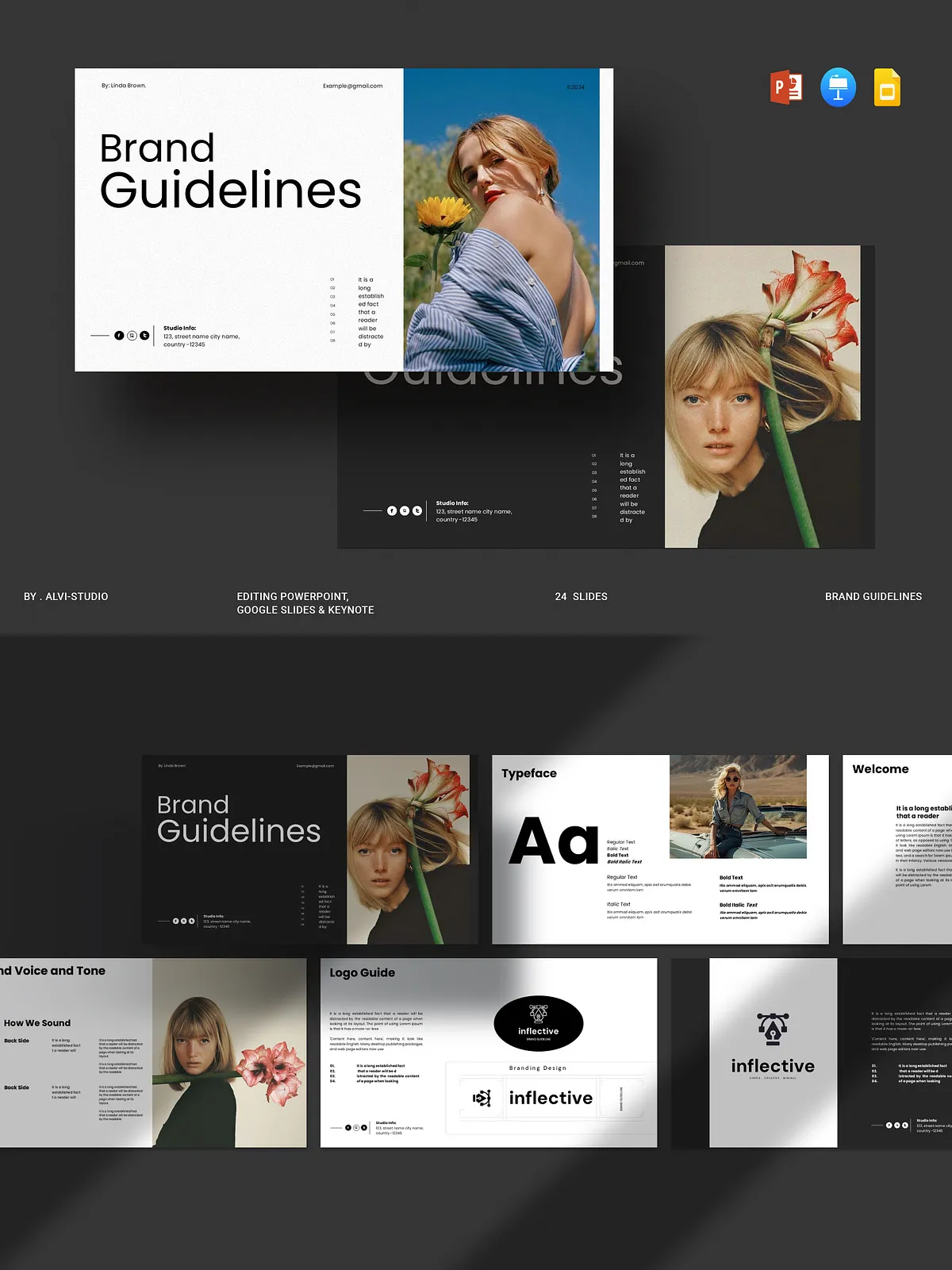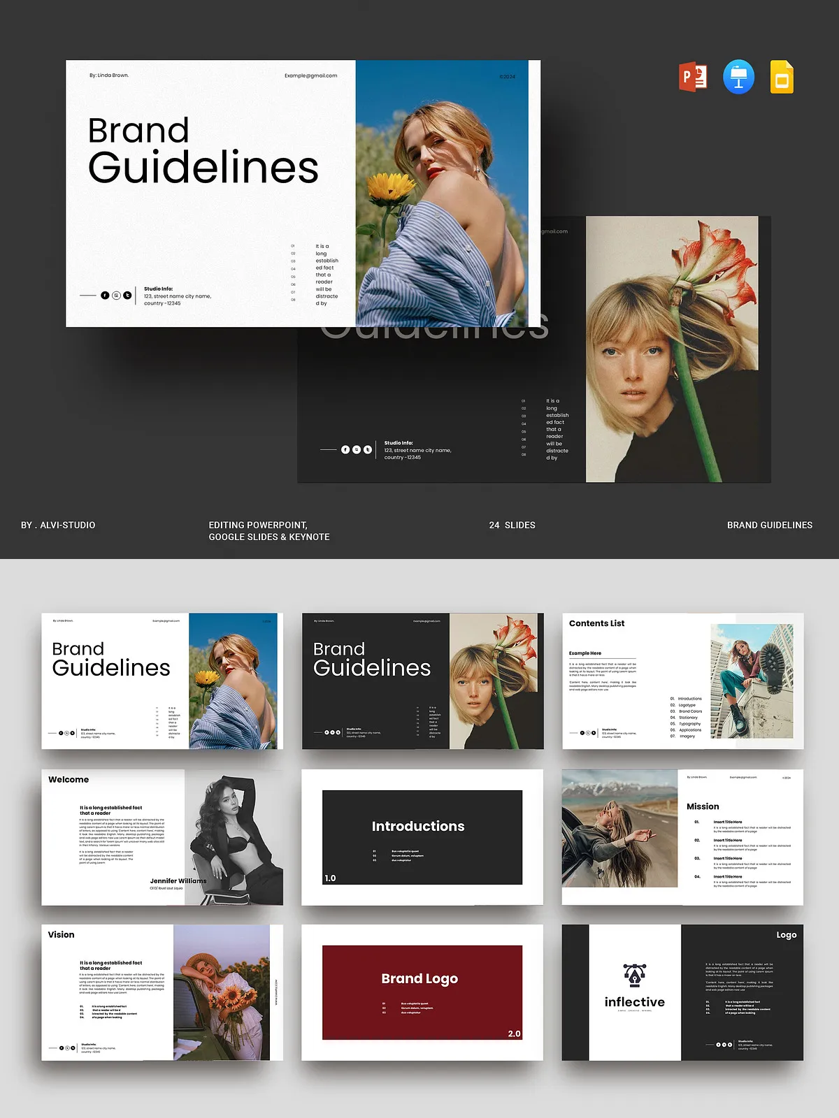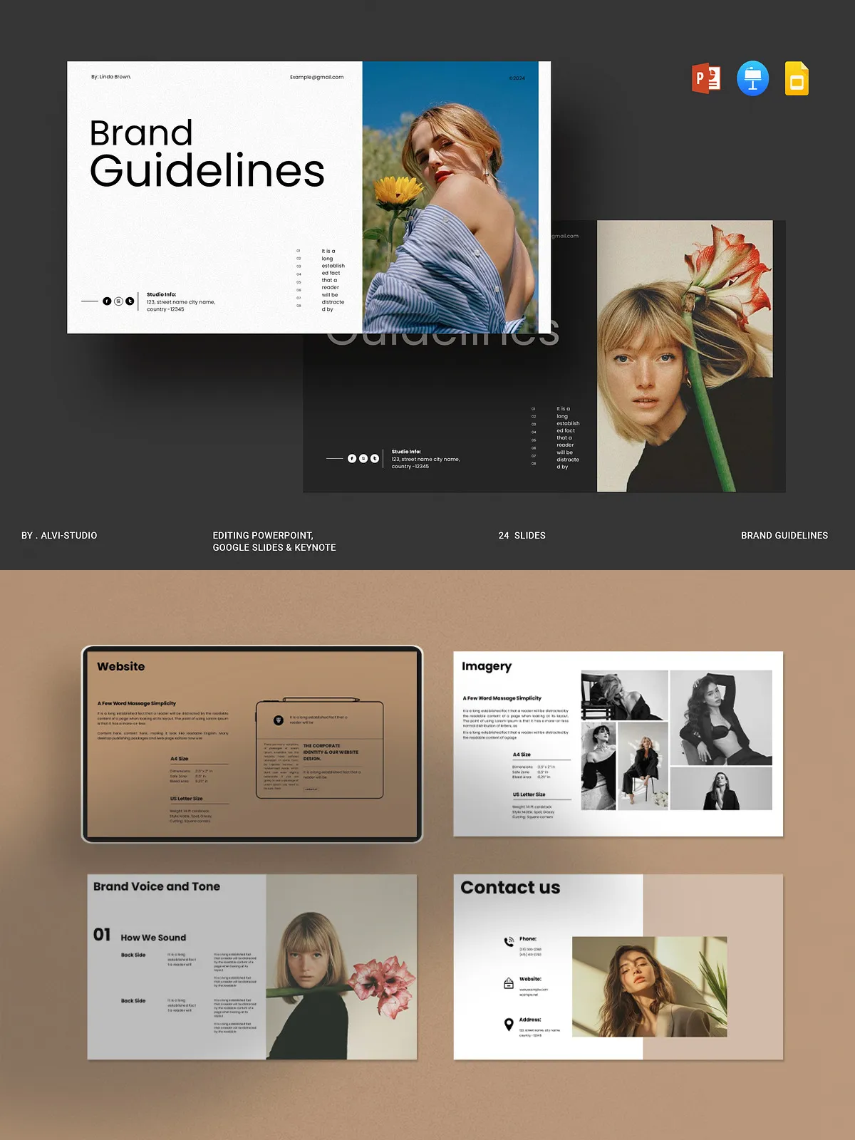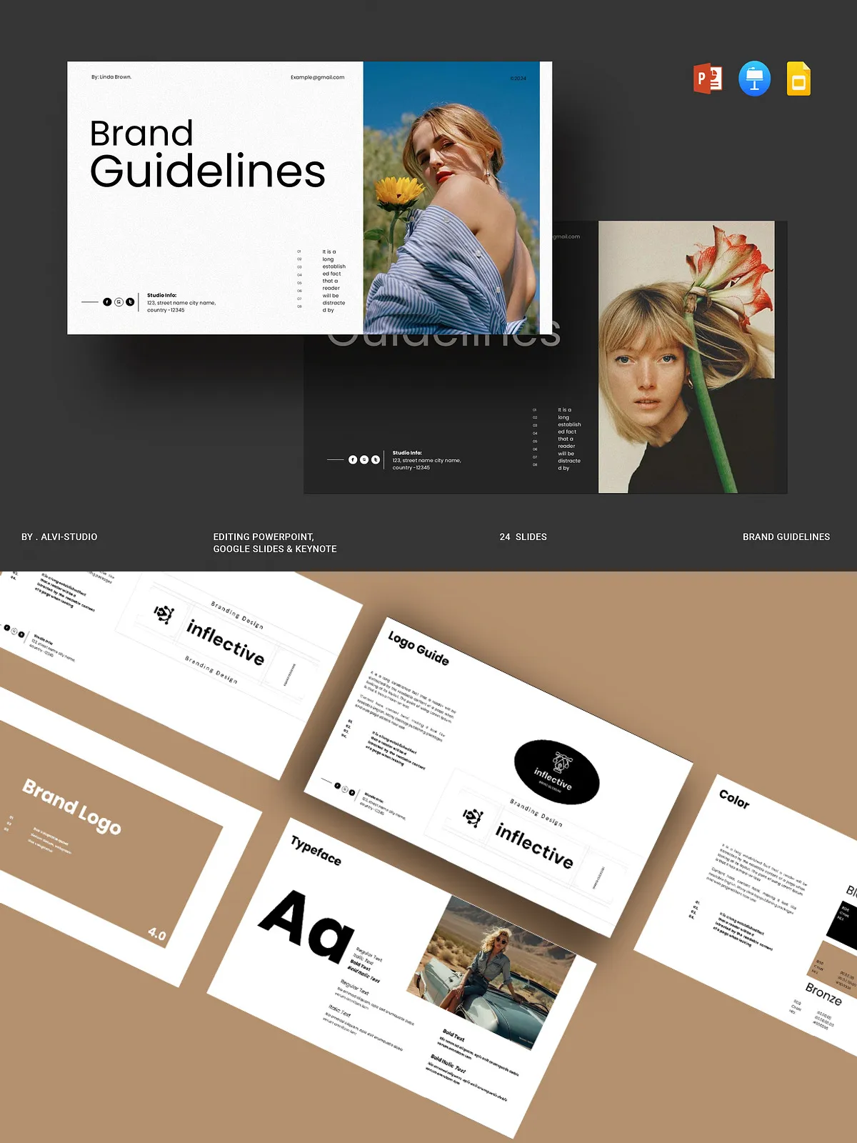 From brand mission and values to visual identity, typography, color systems, and logo usage, the 24-slide structure covers every critical component of a modern brand guideline. Each slide is purpose-built to convey essential information in a visually engaging way.