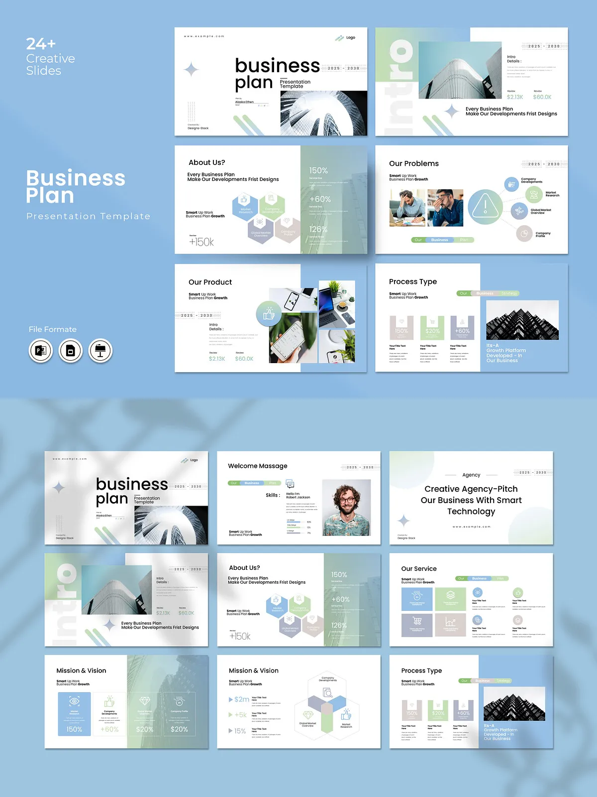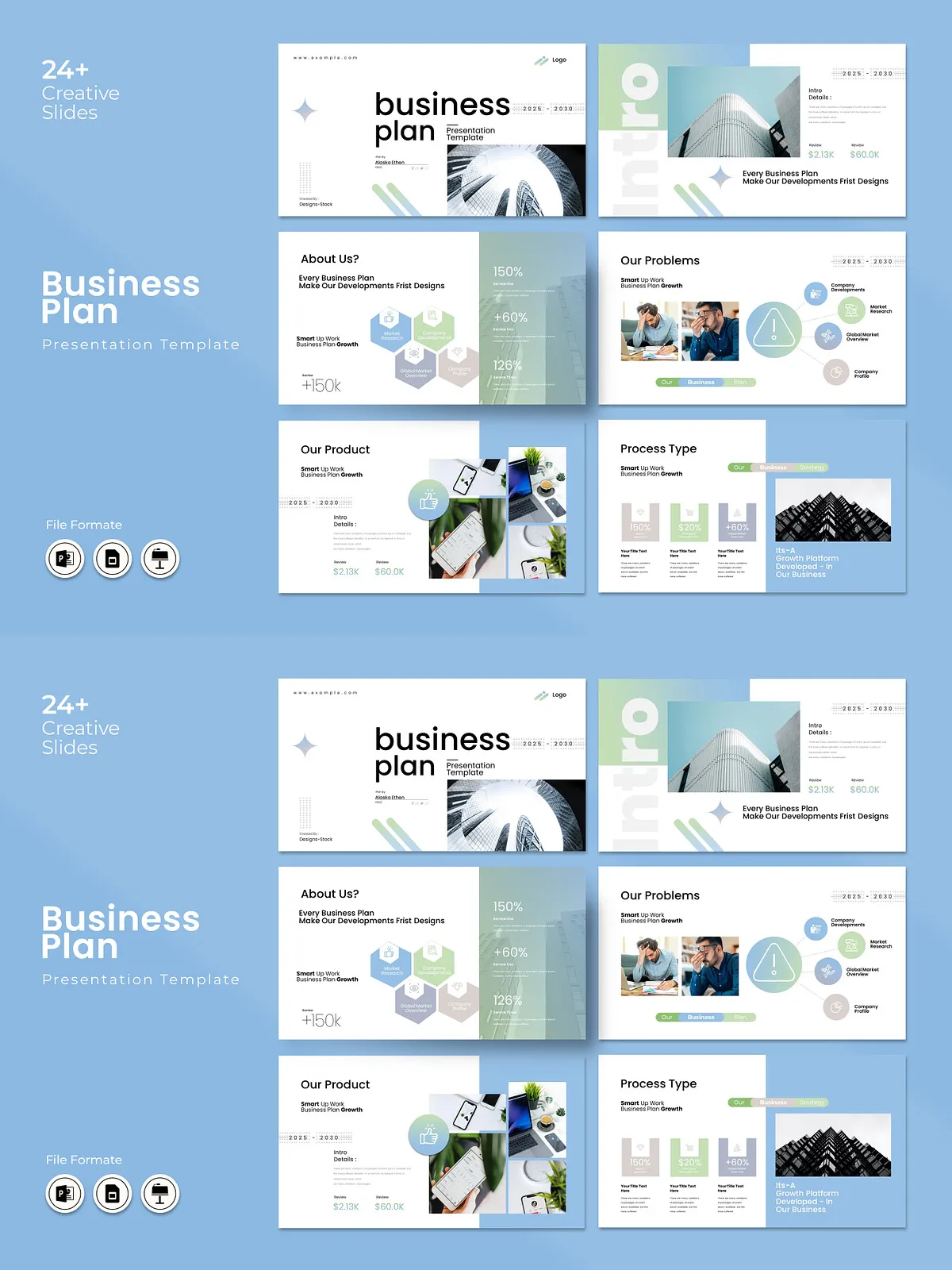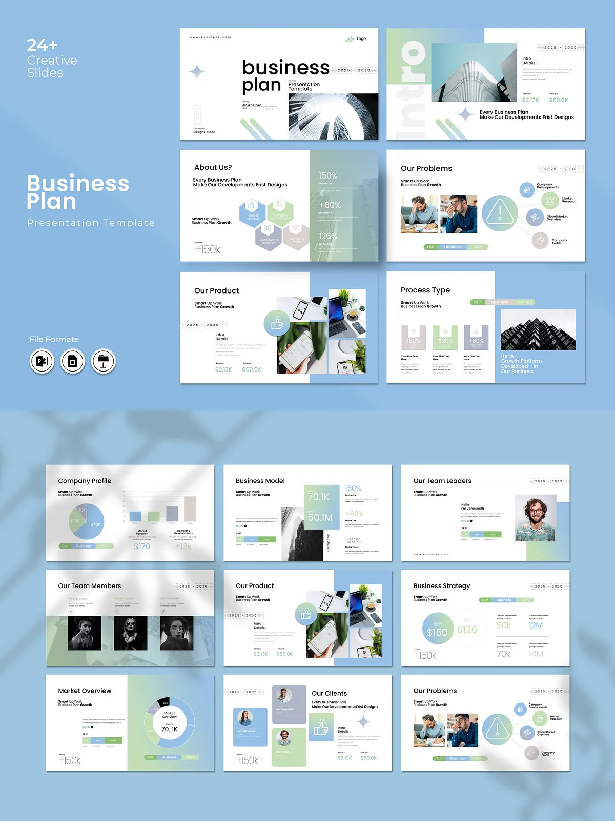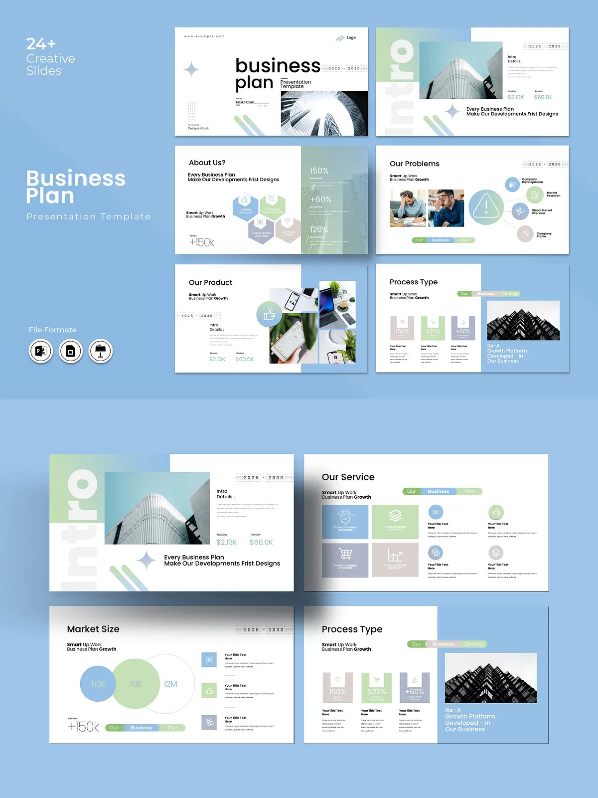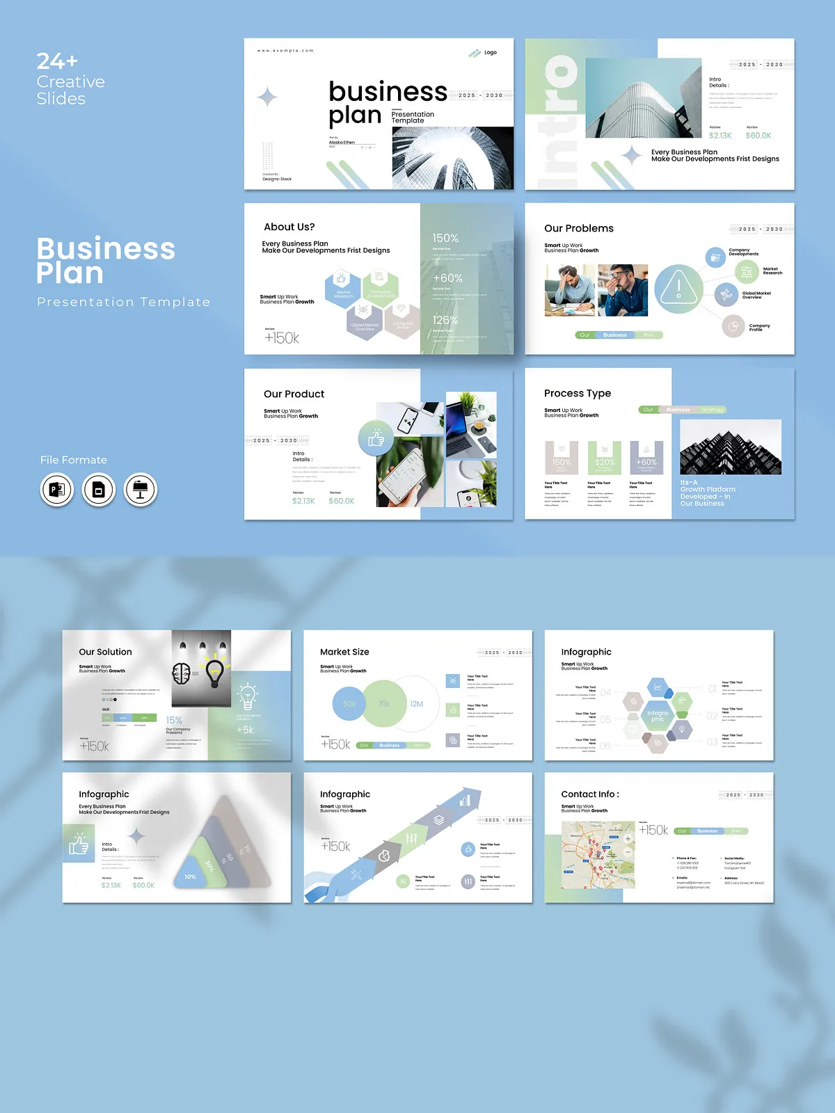 - Total of 24 Unique Slides: Cover every critical element of your business plan comprehensively, from introductory slides to detailed market research.