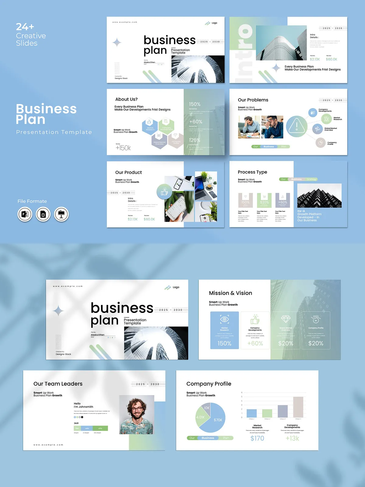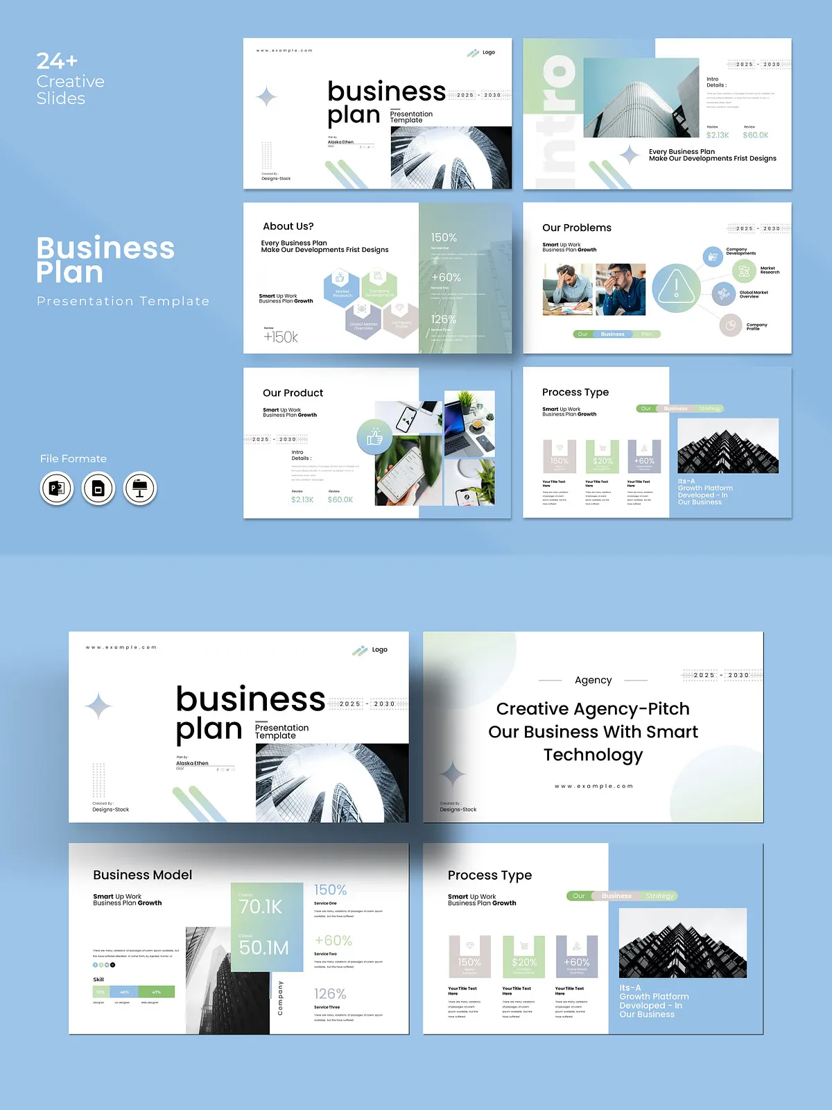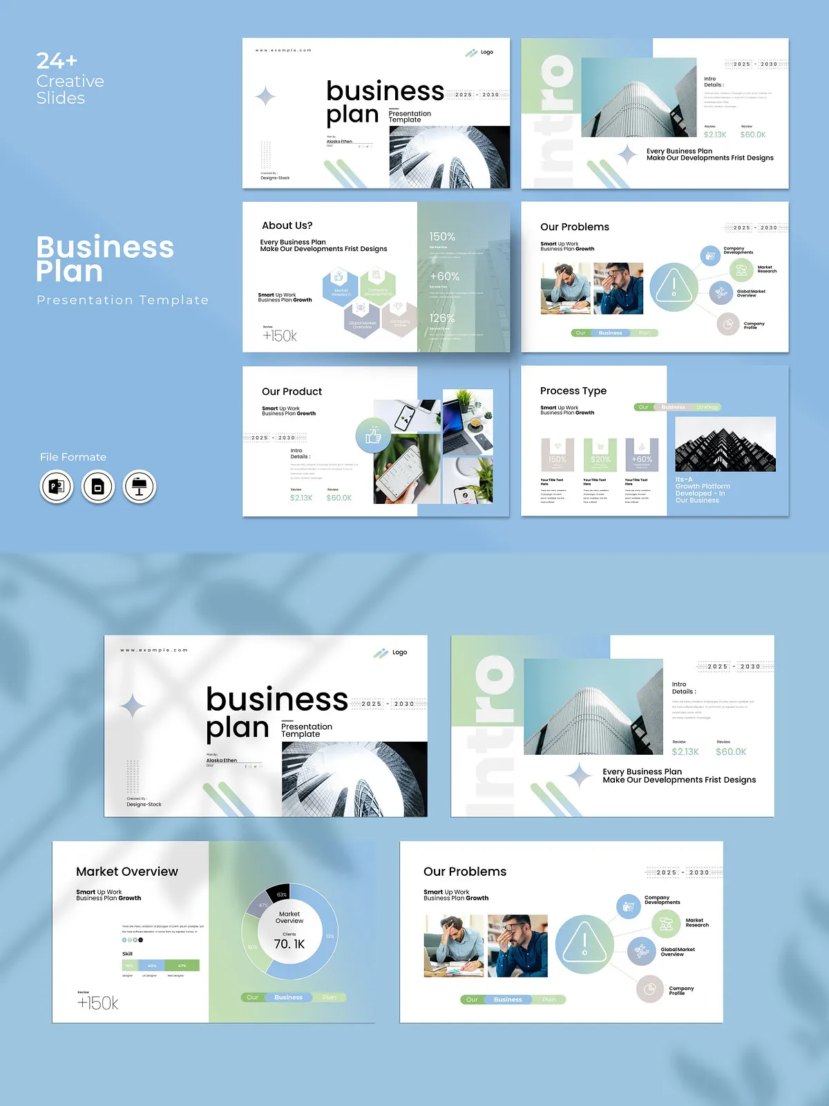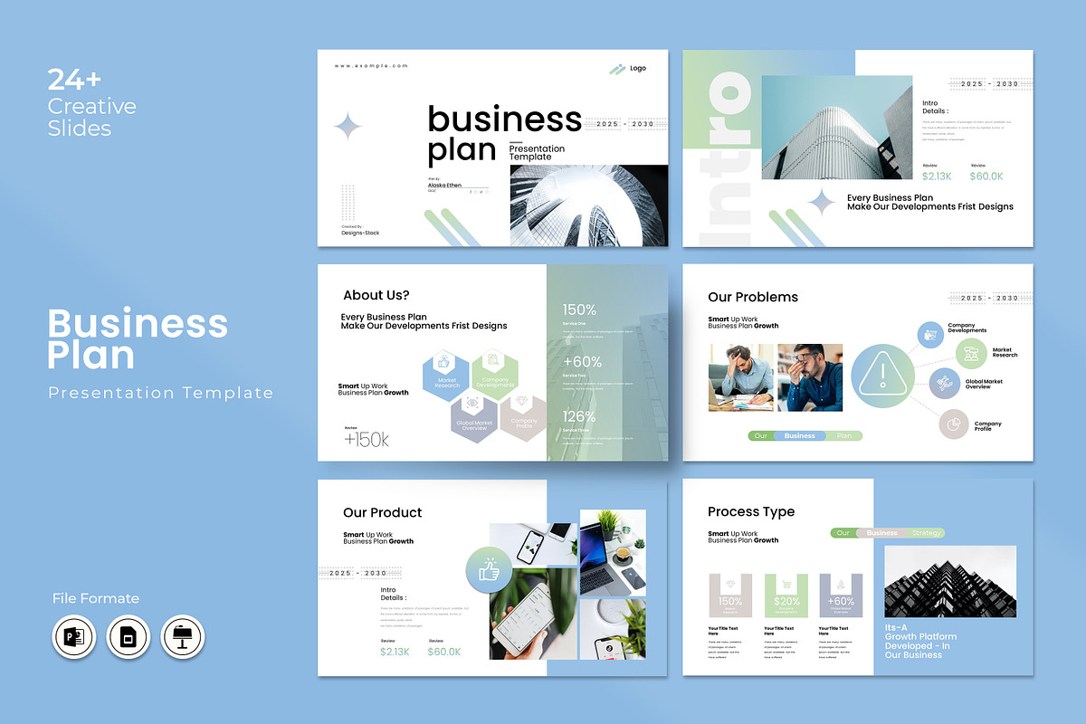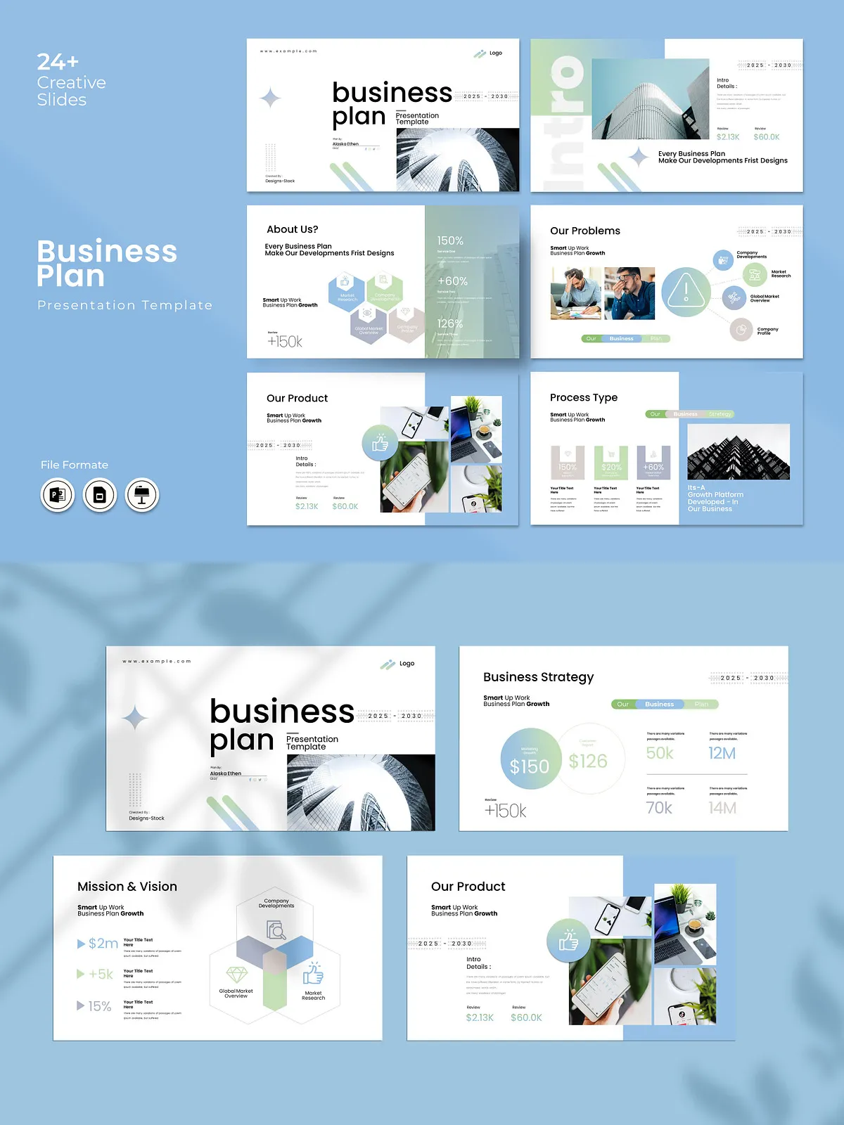 - Total of 24 Unique Slides: Cover every critical element of your business plan comprehensively, from introductory slides to detailed market research.