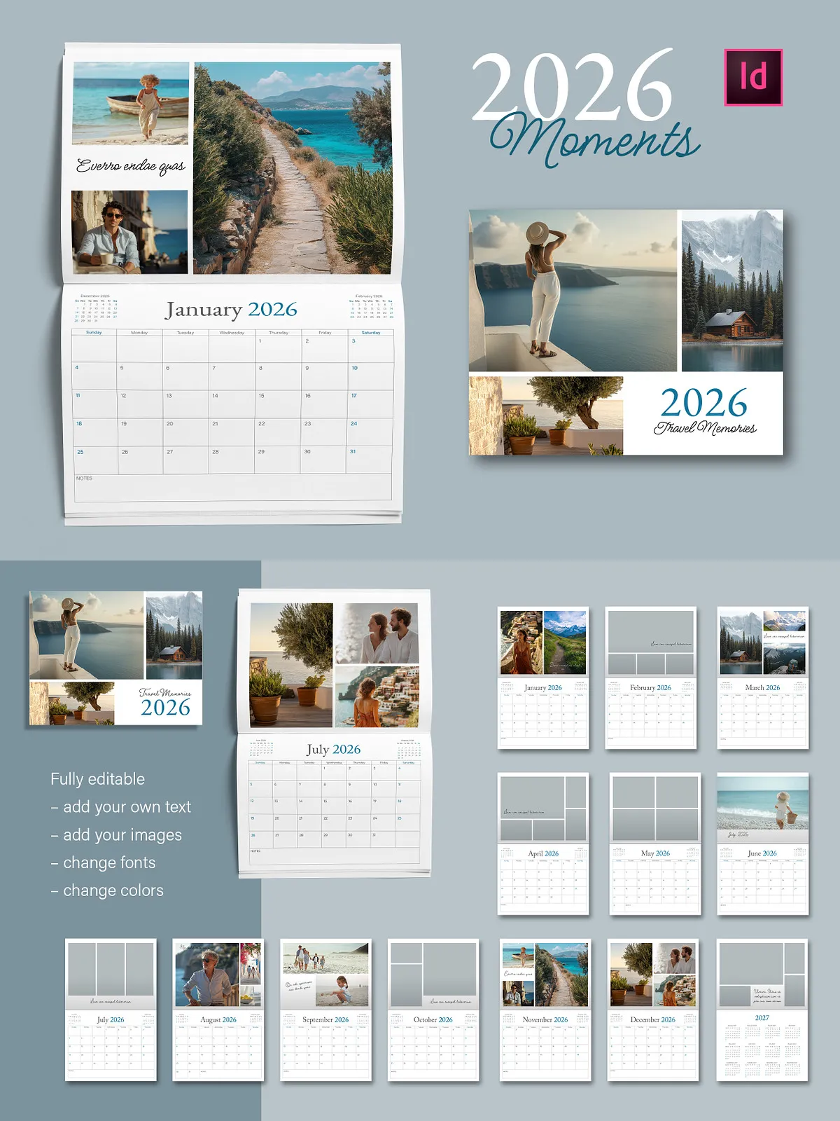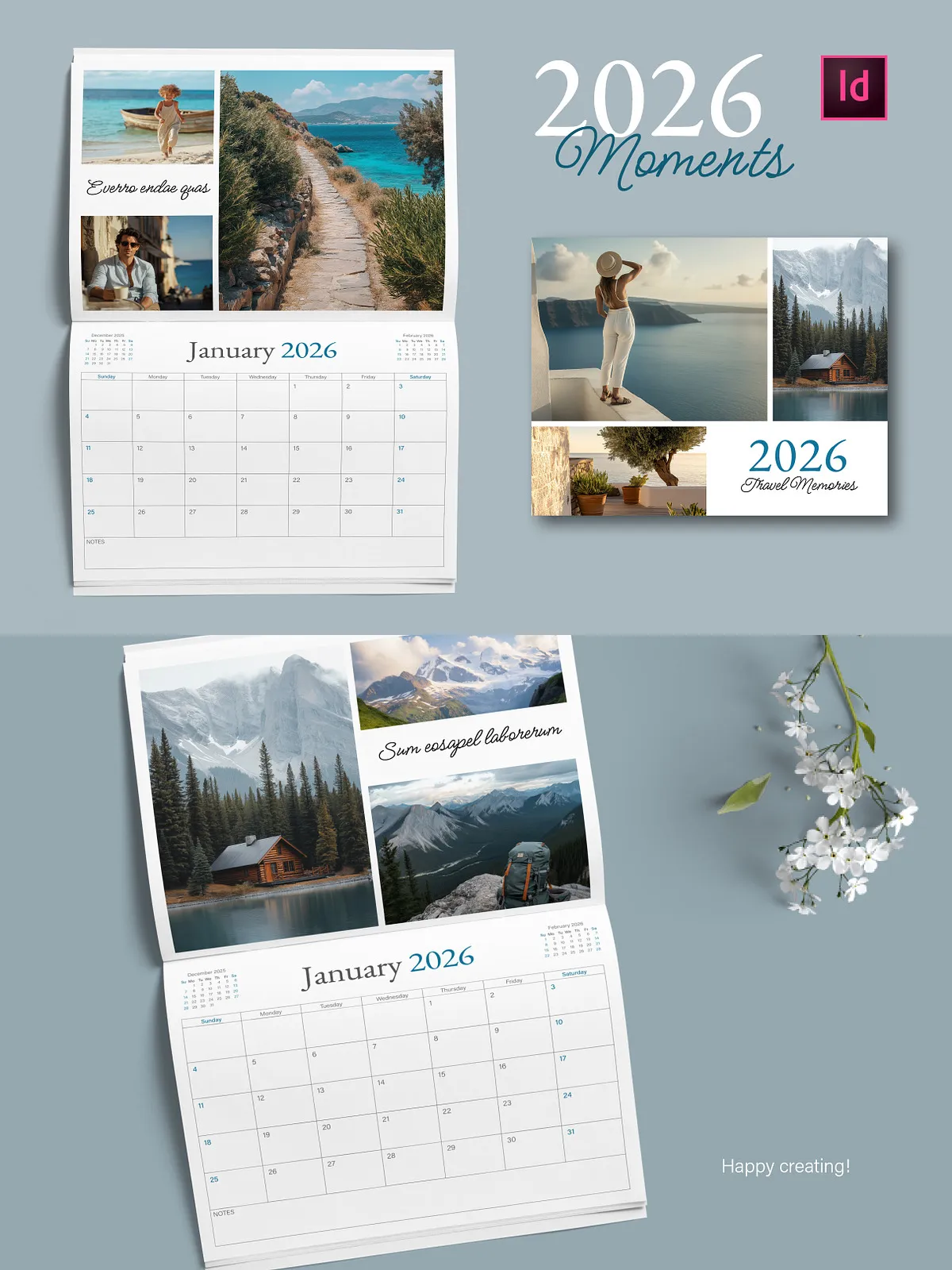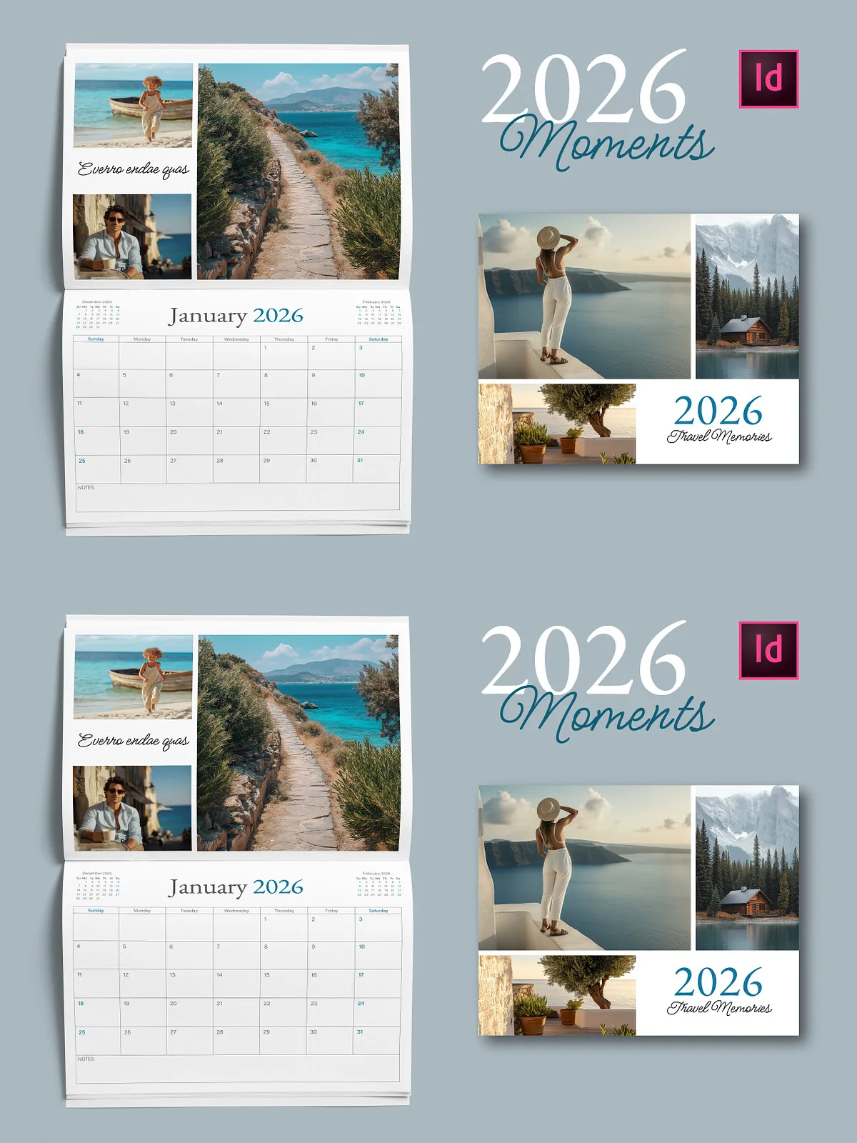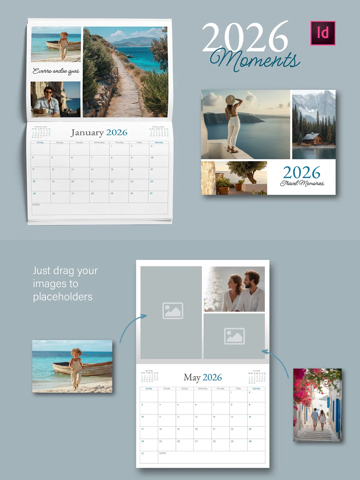 - Photography-Focused Design – Smart placeholder frames with collage layouts let you insert your own photos seamlessly and create a unique yearbook-style calendar.