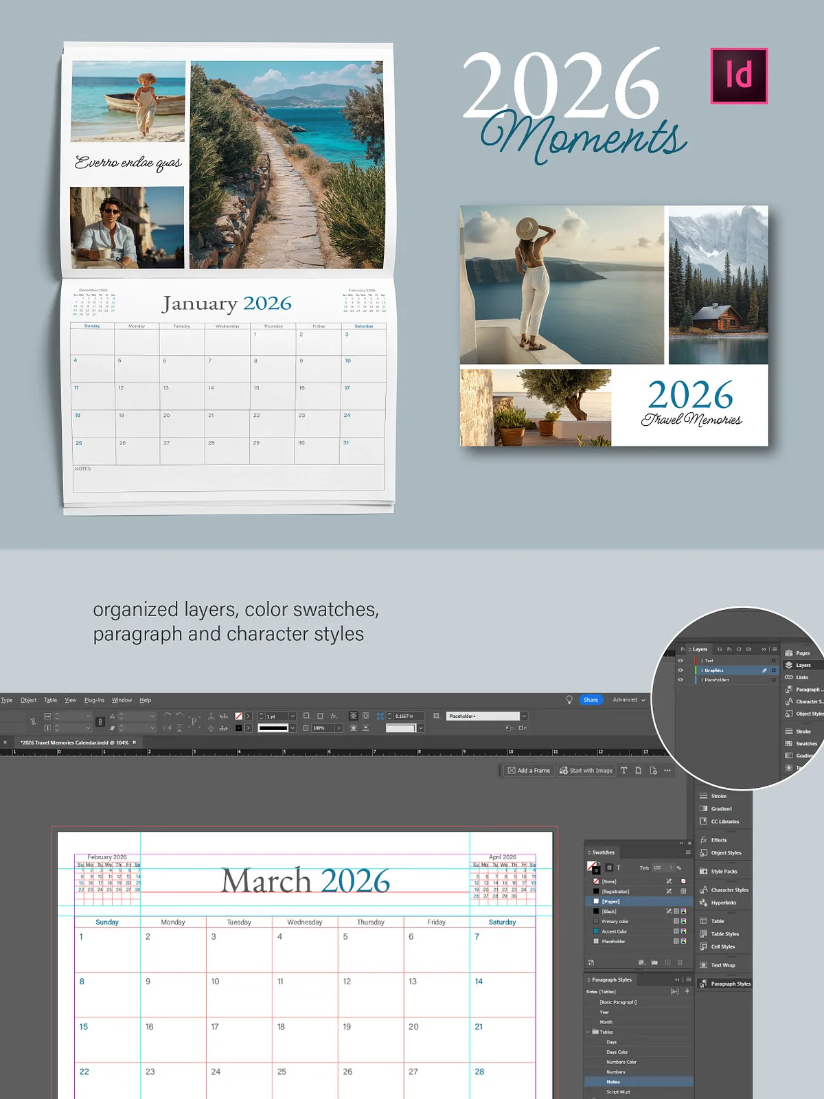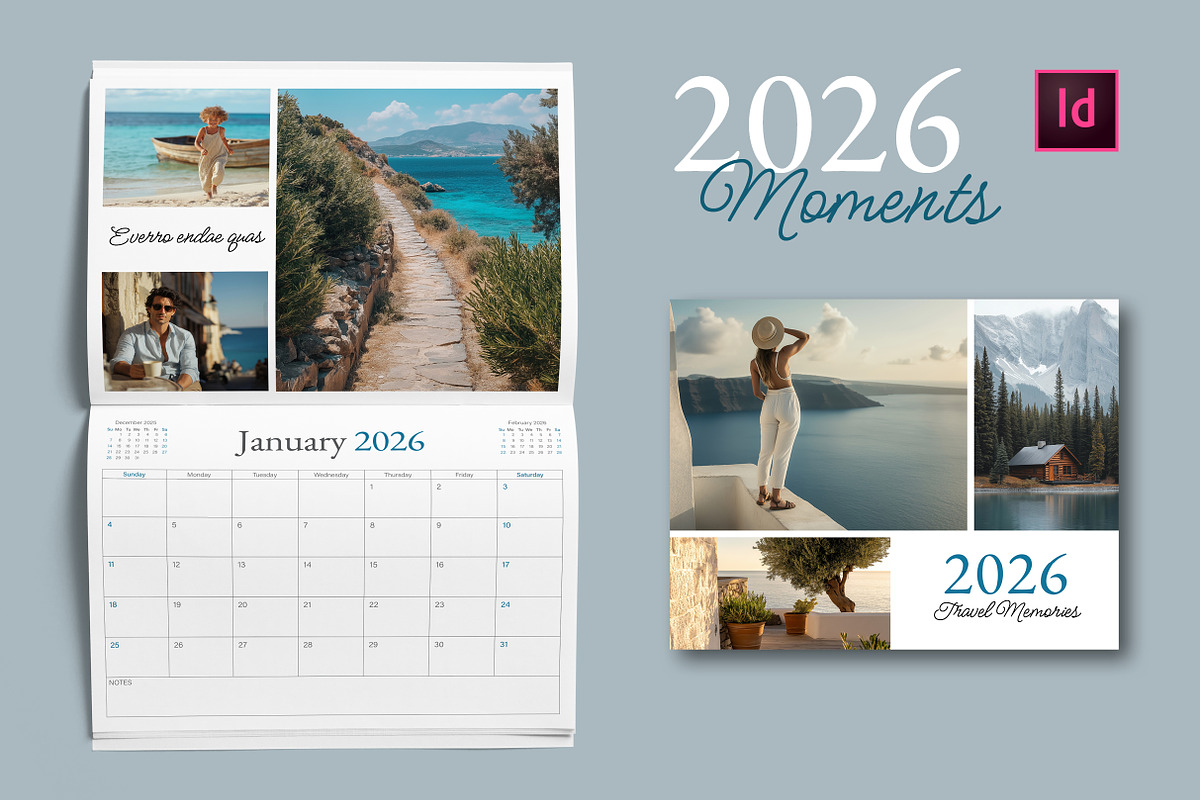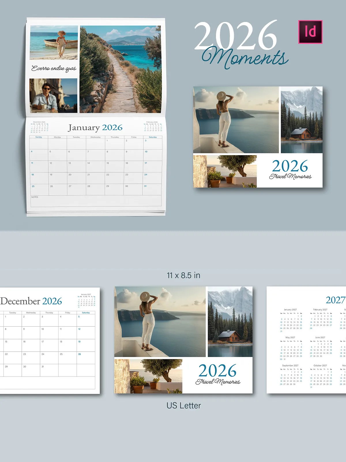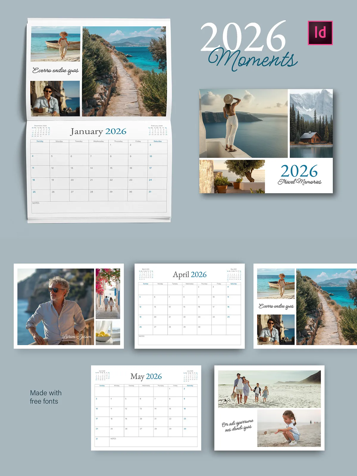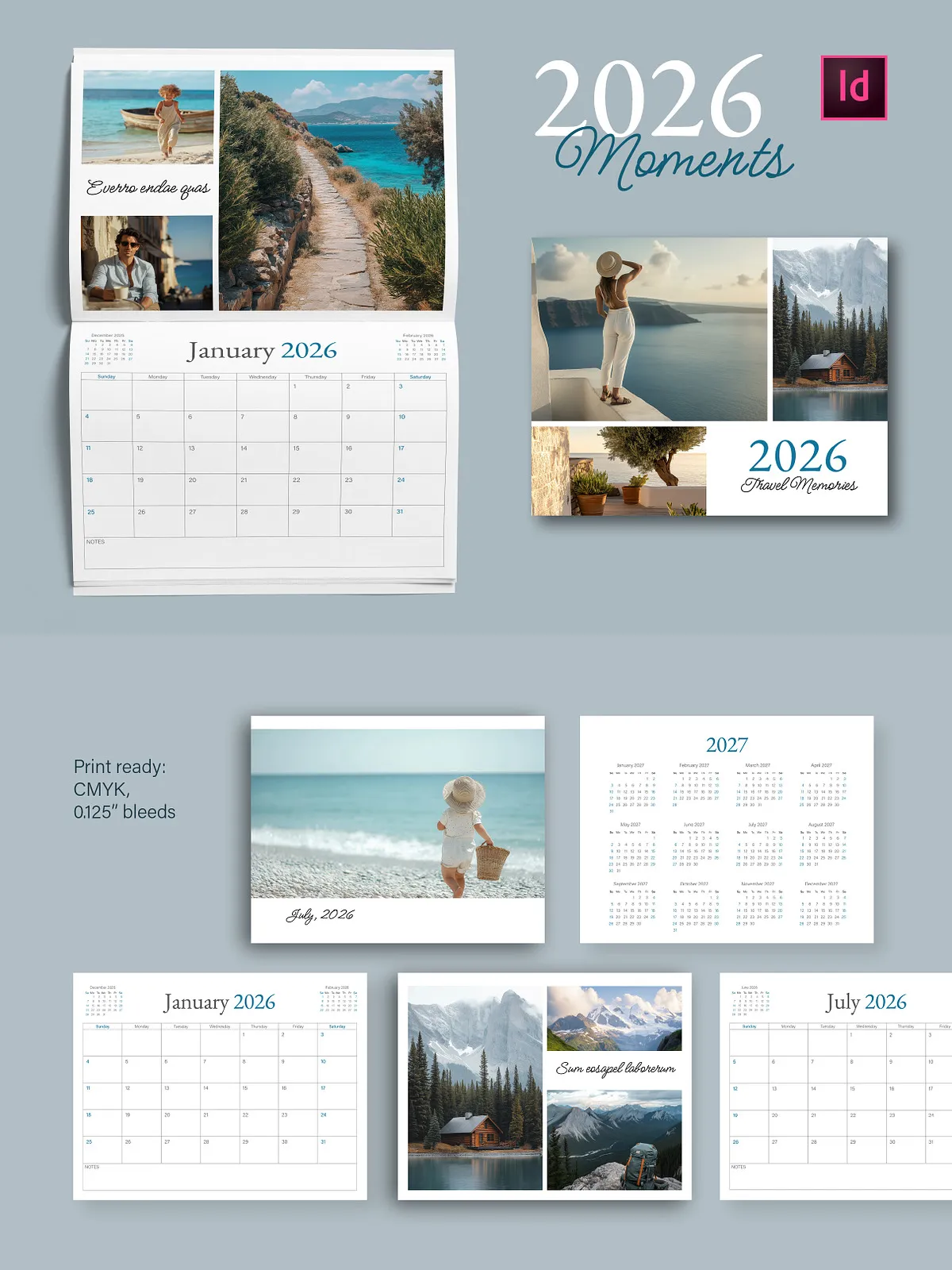 - Photography-Focused Design – Smart placeholder frames with collage layouts let you insert your own photos seamlessly and create a unique yearbook-style calendar.