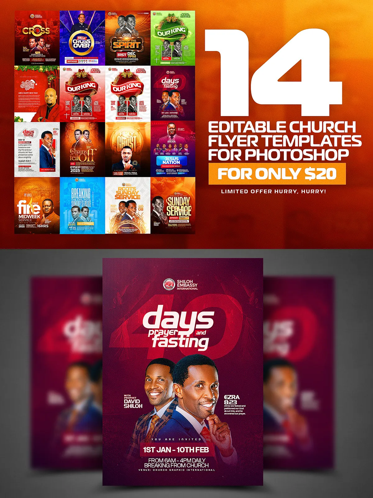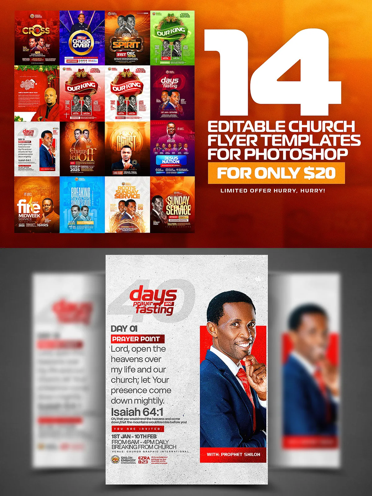 • Prayer and Fasting Flyer Template – Inspire deep spiritual engagement with solemn, reflective visuals and structured content sections.