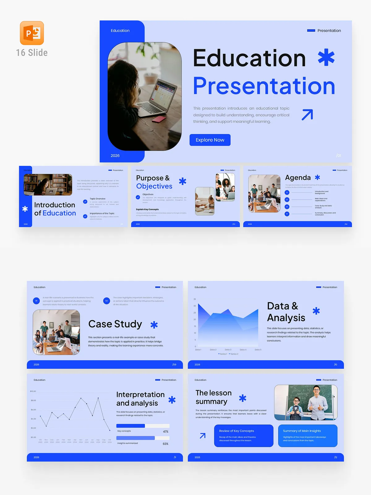 - 16 Fully Customizable Slides – Each slide is thoughtfully structured for specific educational purposes: title, agenda, learning objectives, concept breakdowns, summaries, and reflections.