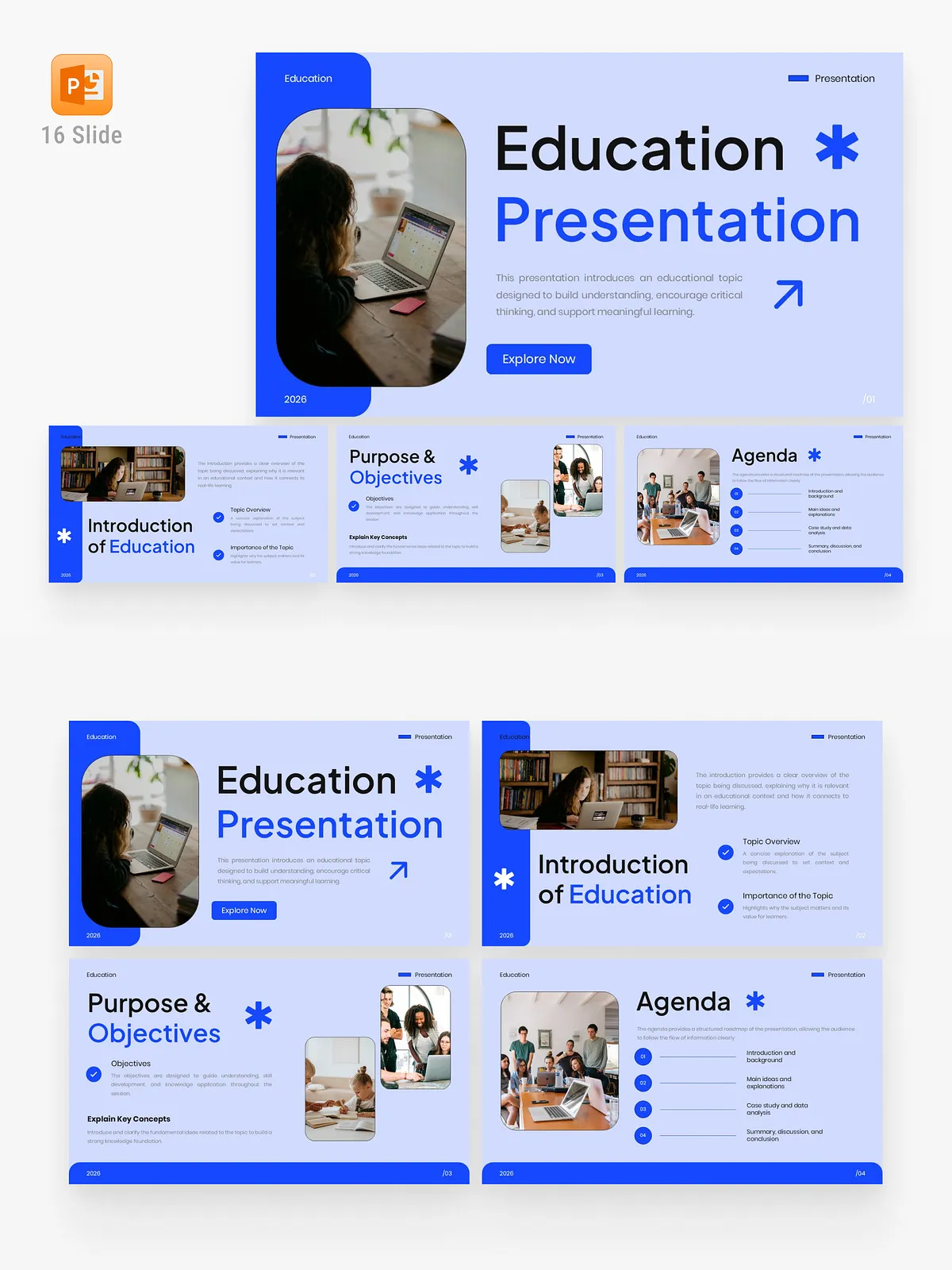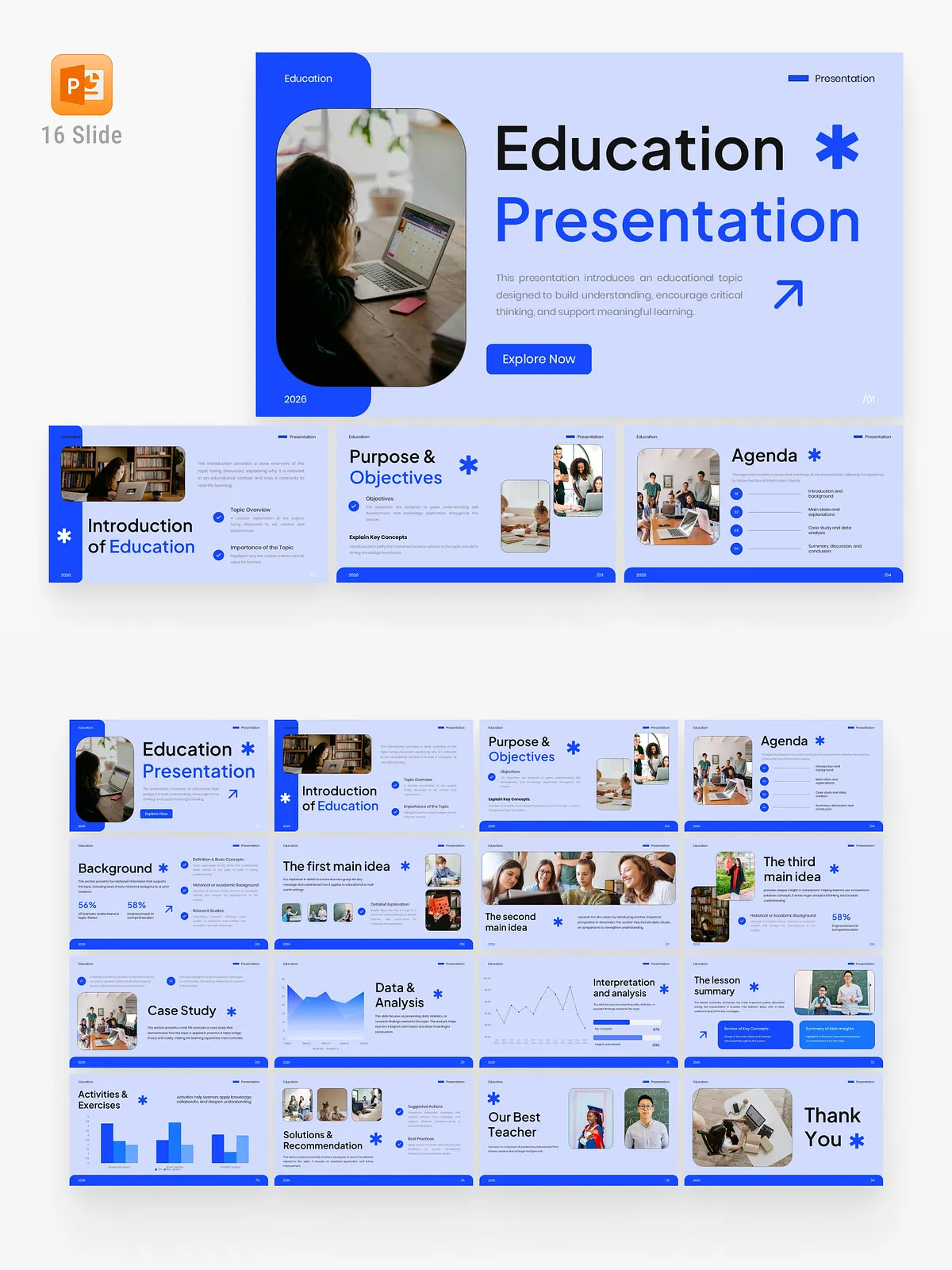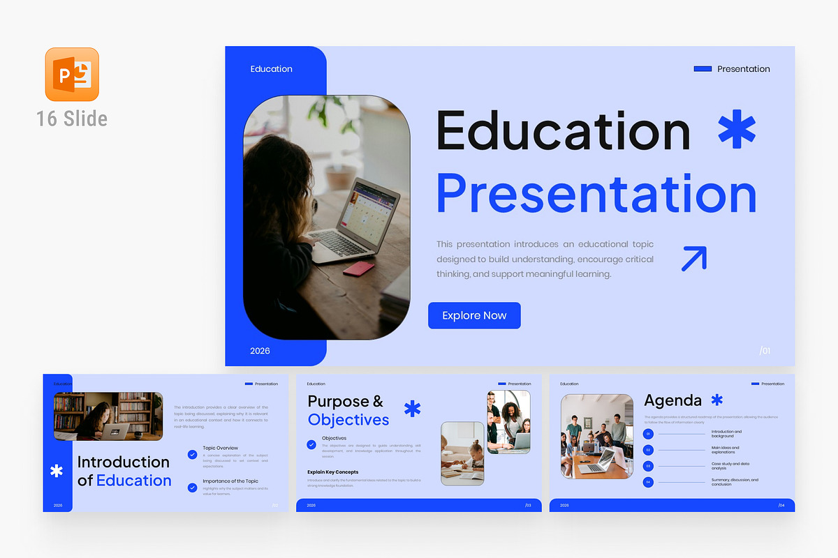 Transform your educational messaging with this meticulously crafted Education PowerPoint Template, designed for clarity, engagement, and intellectual impact. Engineered for educators, academic professionals, online course creators, and students, this 16-slide template delivers a sophisticated visual experience that enhances comprehension and fosters meaningful learning. With a calm blue color scheme, minimalist design, and authentic learning-focused imagery, every slide guides your audience through structured storytelling—from introduction to learning outcomes—with precision and presence.