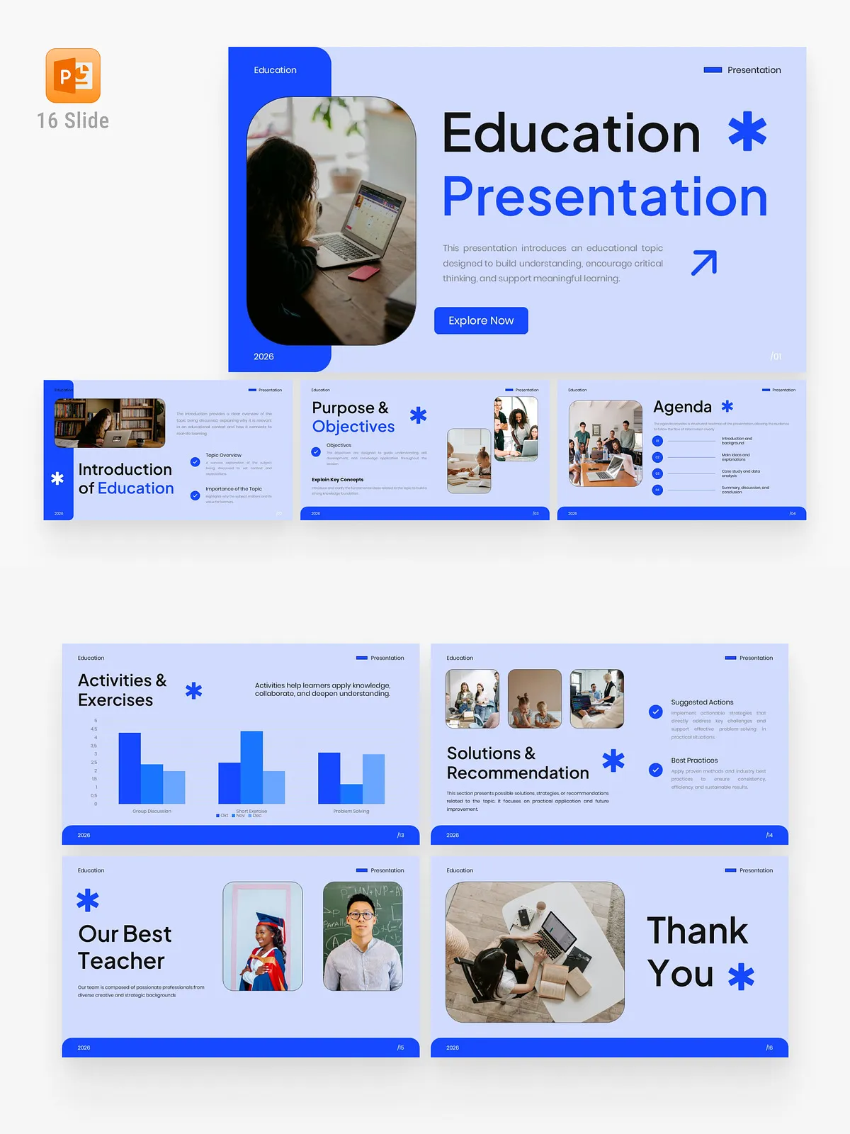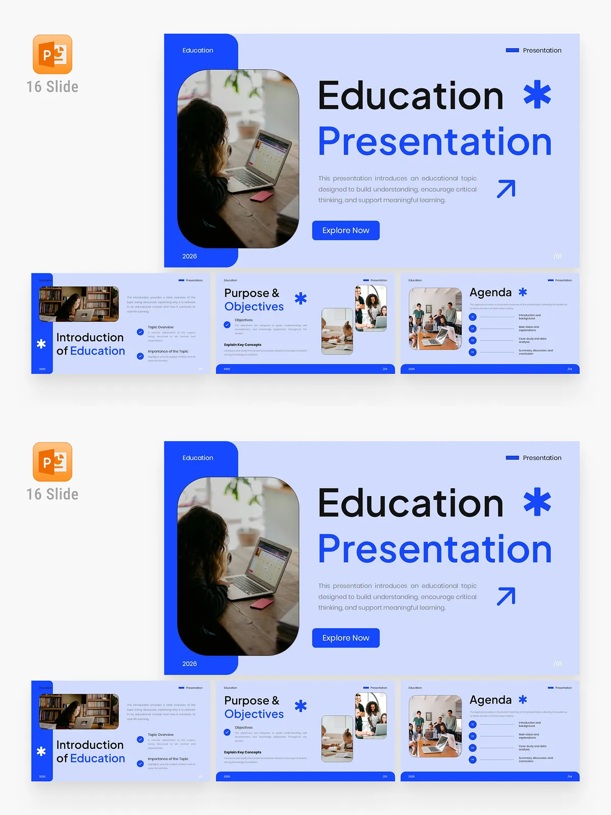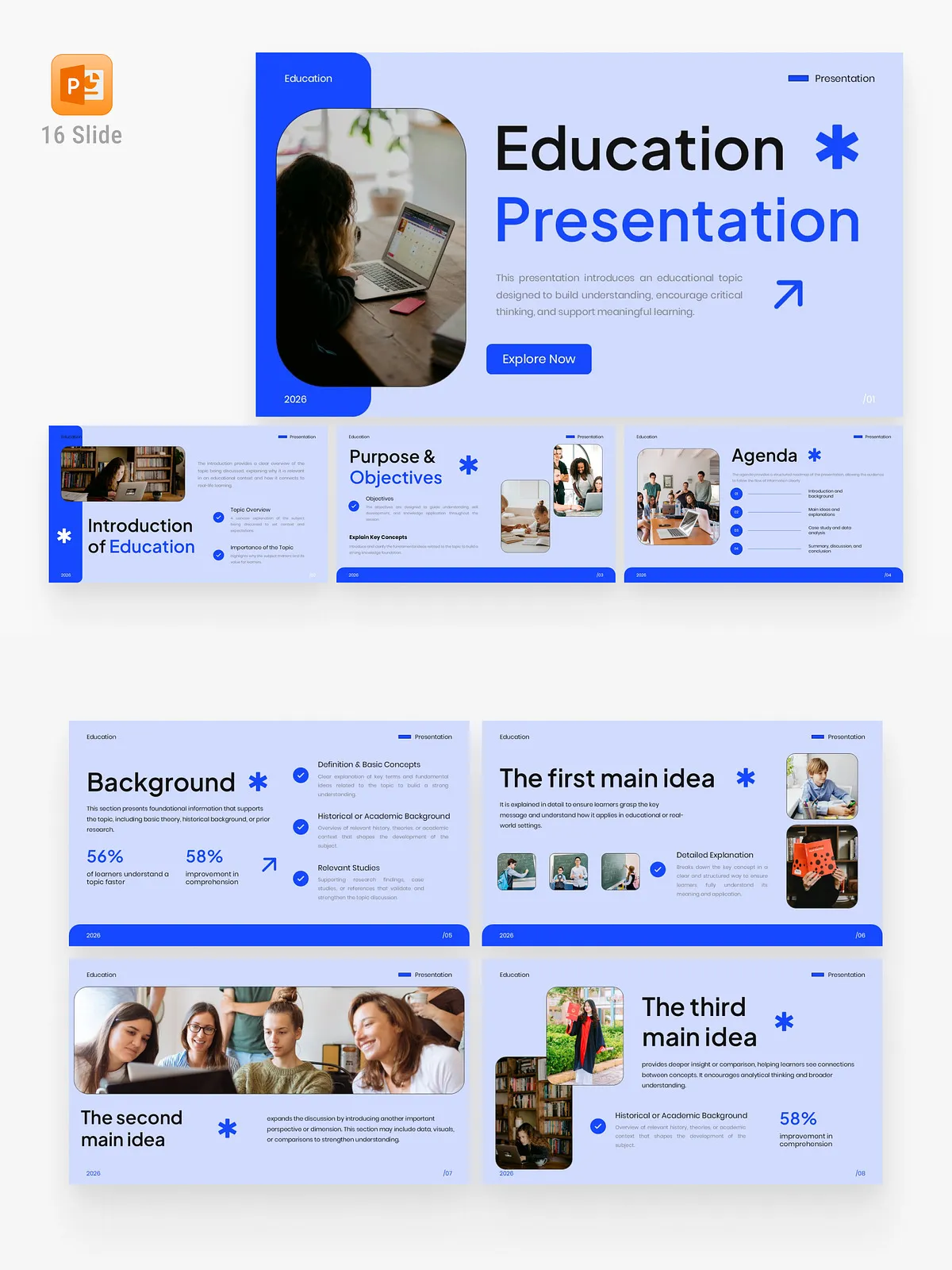 Transform your educational messaging with this meticulously crafted Education PowerPoint Template, designed for clarity, engagement, and intellectual impact. Engineered for educators, academic professionals, online course creators, and students, this 16-slide template delivers a sophisticated visual experience that enhances comprehension and fosters meaningful learning. With a calm blue color scheme, minimalist design, and authentic learning-focused imagery, every slide guides your audience through structured storytelling—from introduction to learning outcomes—with precision and presence.