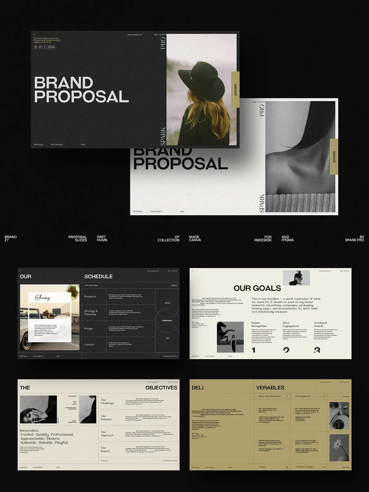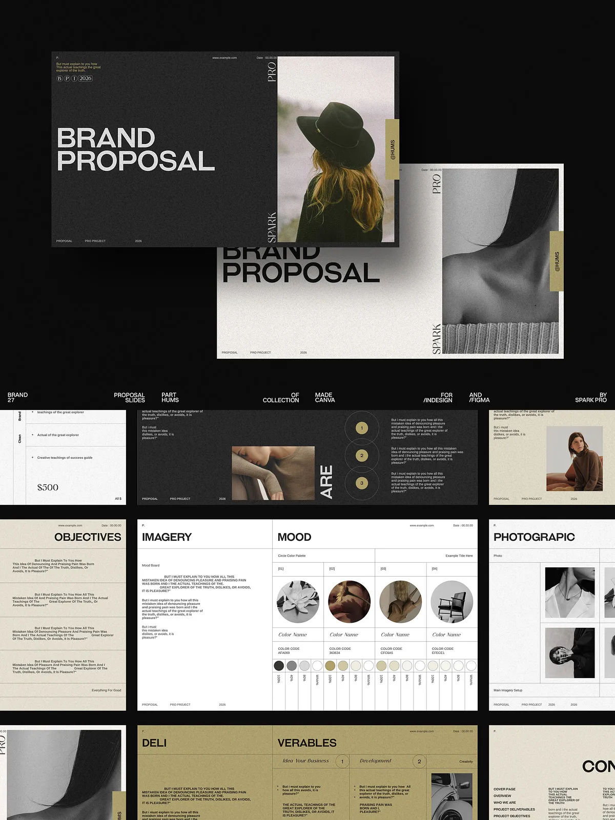 • 27 Professionally Crafted Slides — From your personal introduction and brand story to your creative concept breakdown and project timeline, every section is thoughtfully structured to guide the client through your vision with purpose and clarity.