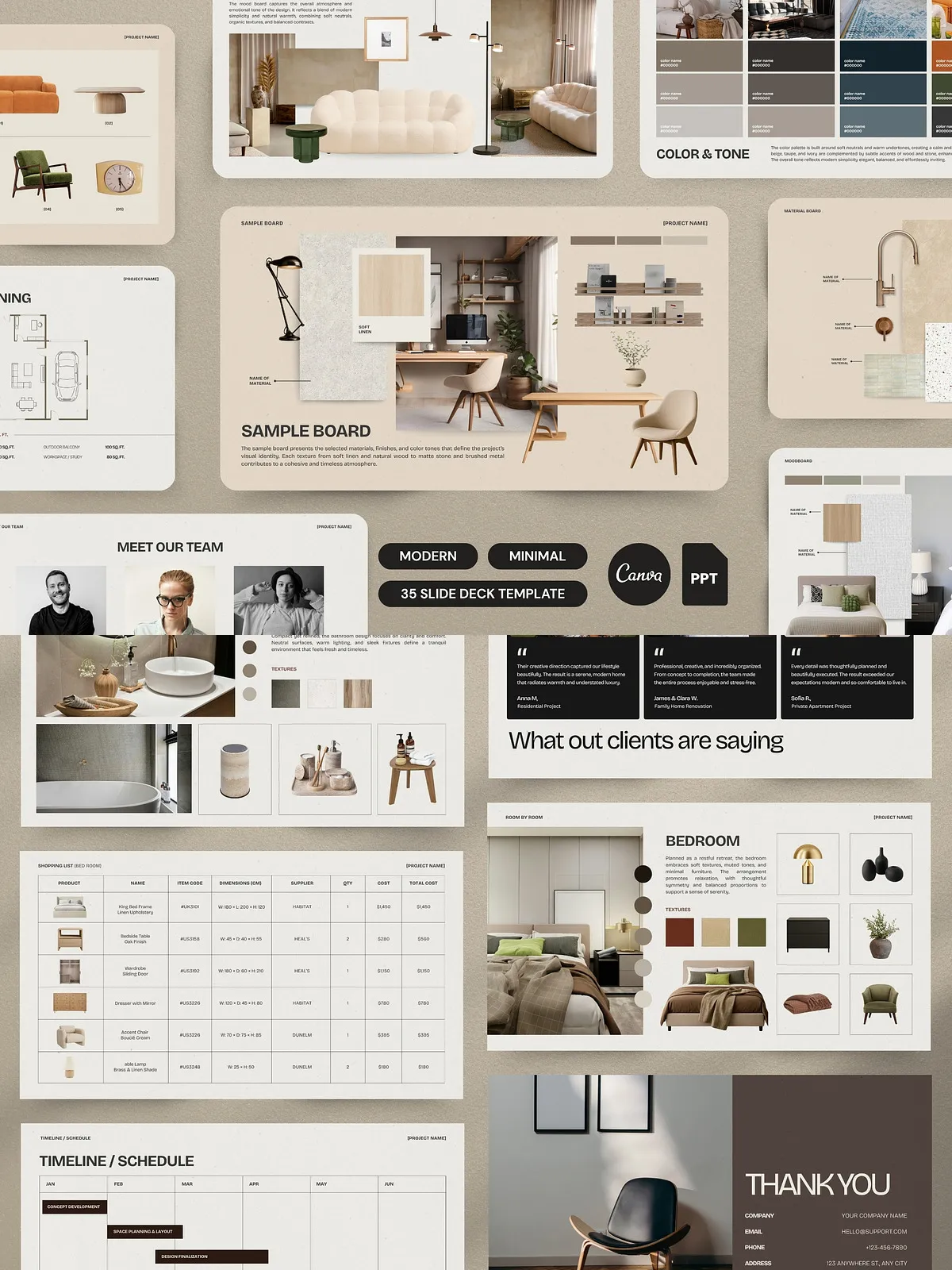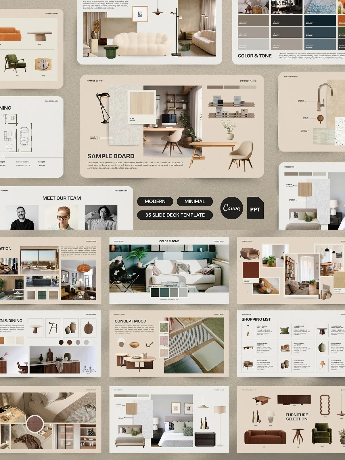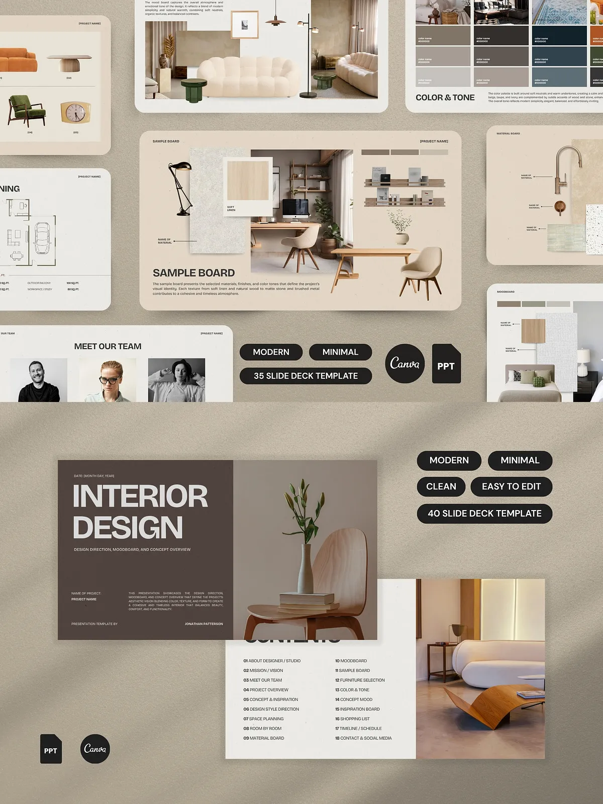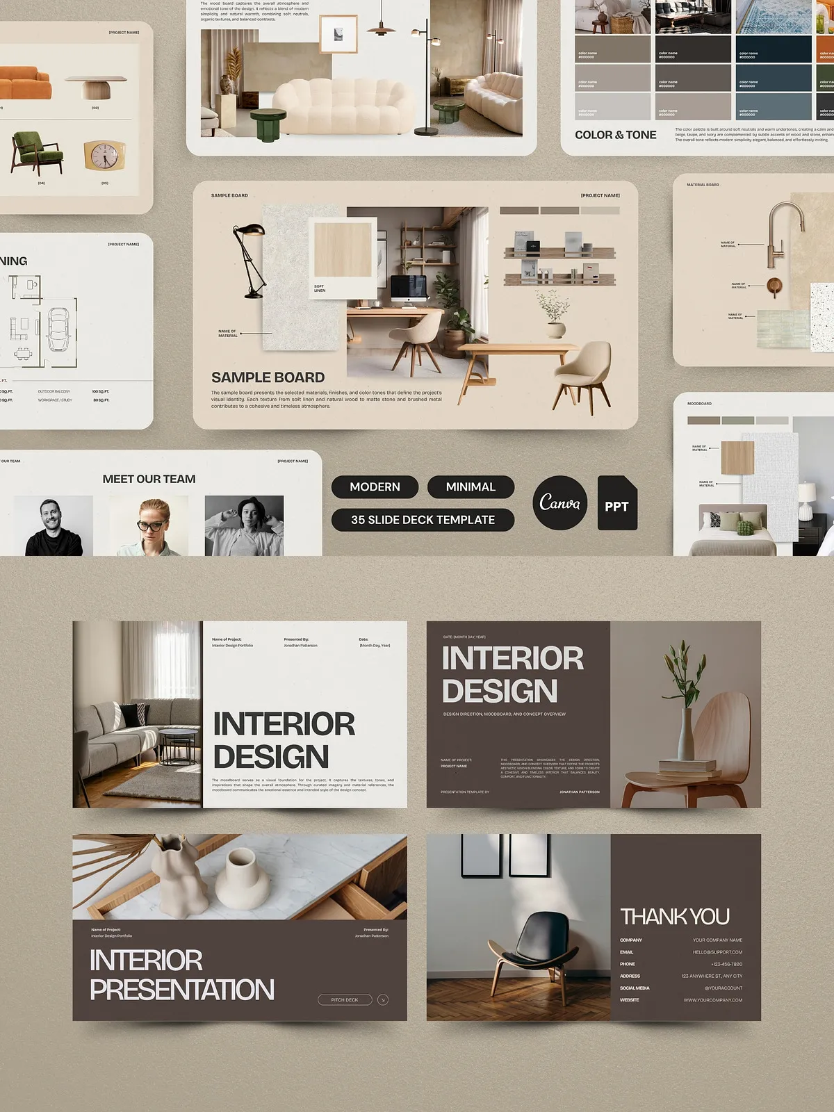Present your interior design concepts like a pro—every idea, mood, and material selection communicated with power and polish. The Interior Design Client Presentation Template is your complete toolkit for creating client-ready presentations in both Canva and PowerPoint (PPT). Whether you’re launching a residential renovation, a boutique hotel concept, or a high-end commercial space, this template gives you the structure, style, and flexibility to impress from the first slide to the final call-to-action.